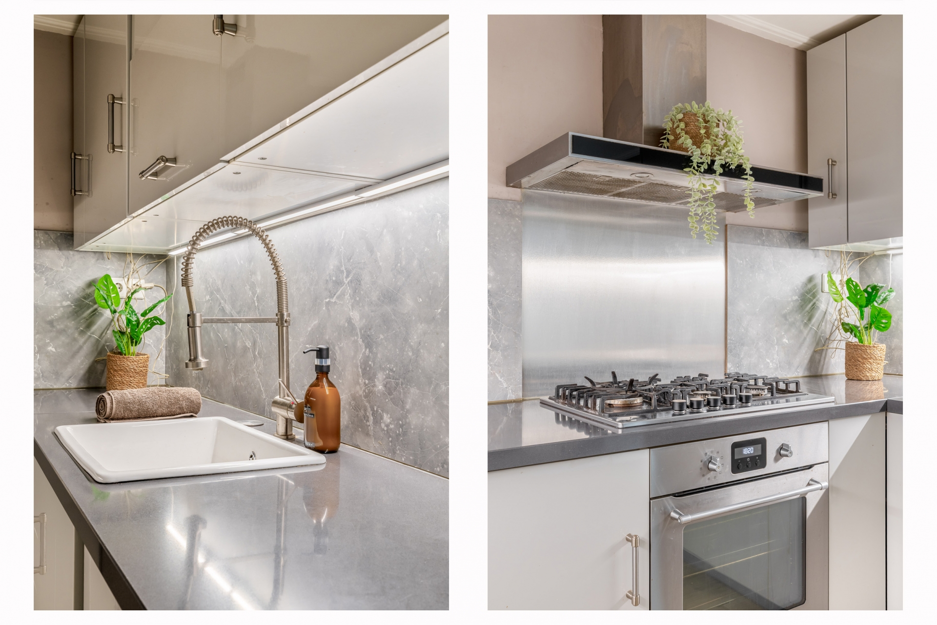 Grenzend aan de eetkamer ligt de moderne keuken in U-opstelling. Hier beschik je over alles wat je nodig hebt: een 5-pits gaskookplaat, oven, magnetron, RVS-afzuigkap en vaatwasser. Dankzij de vele kasten is er volop bergruimte.
