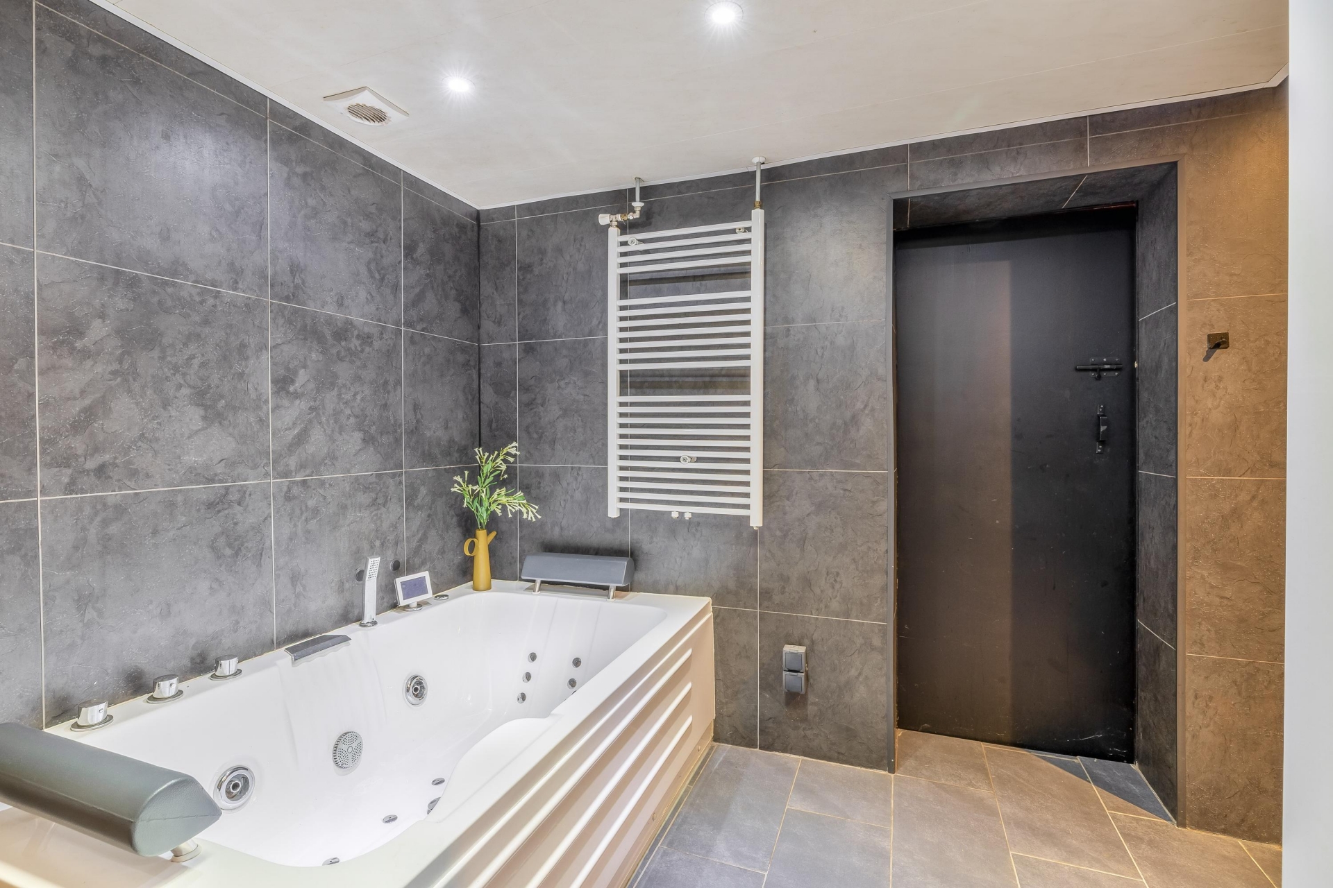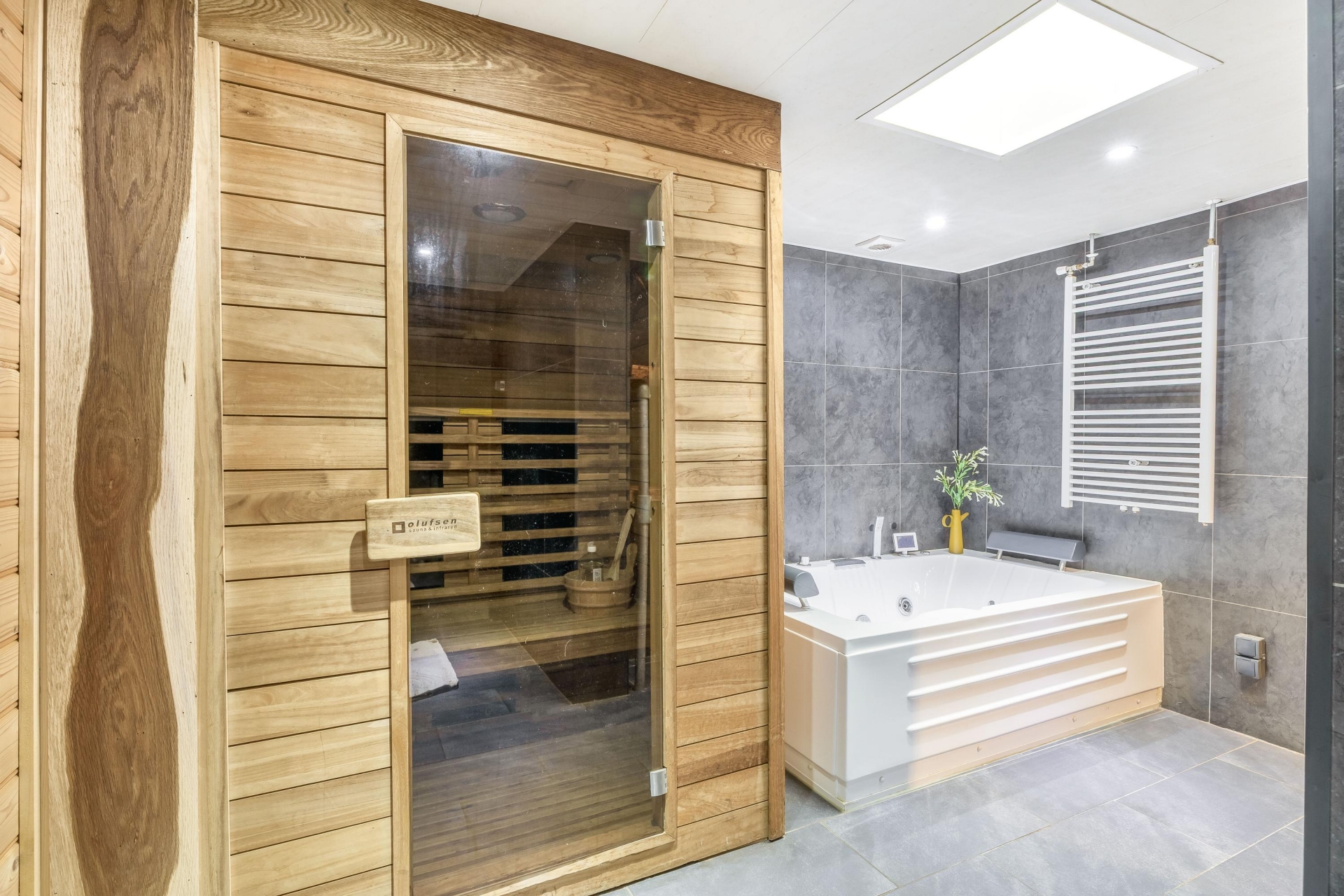 Aansluitend bevindt zich de badkamer, en dat is er één die je niet snel tegenkomt. Een ruime inloopdouche met regendouche, een wastafel met verlichte spiegel, een whirlpool én een Finse sauna maken dit een plek waar je echt tot rust komt. De cv-opstelling is netjes weggewerkt in een kast. Daarnaast is er een separaat toilet en een aparte wasruimte met plaats voor wasmachine en droger.