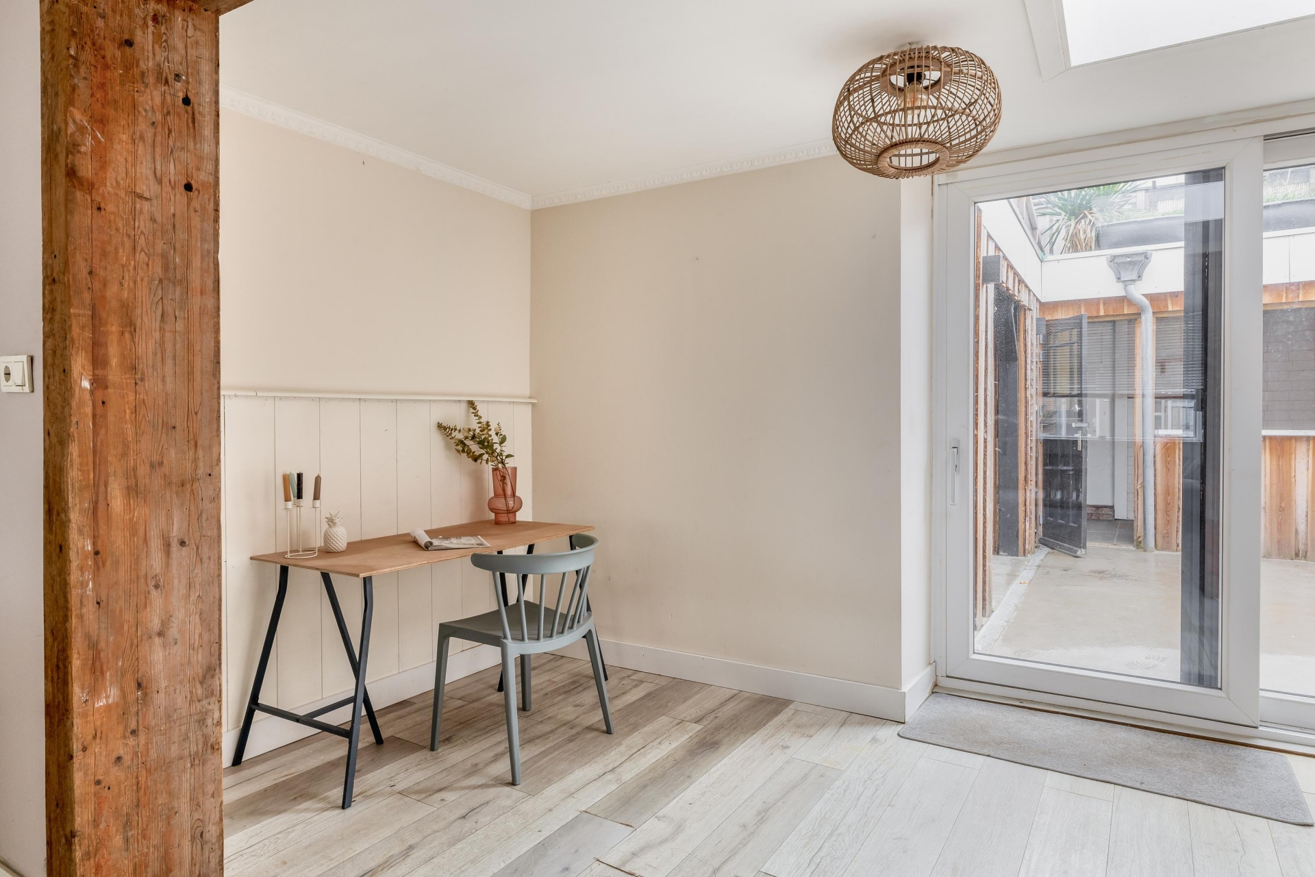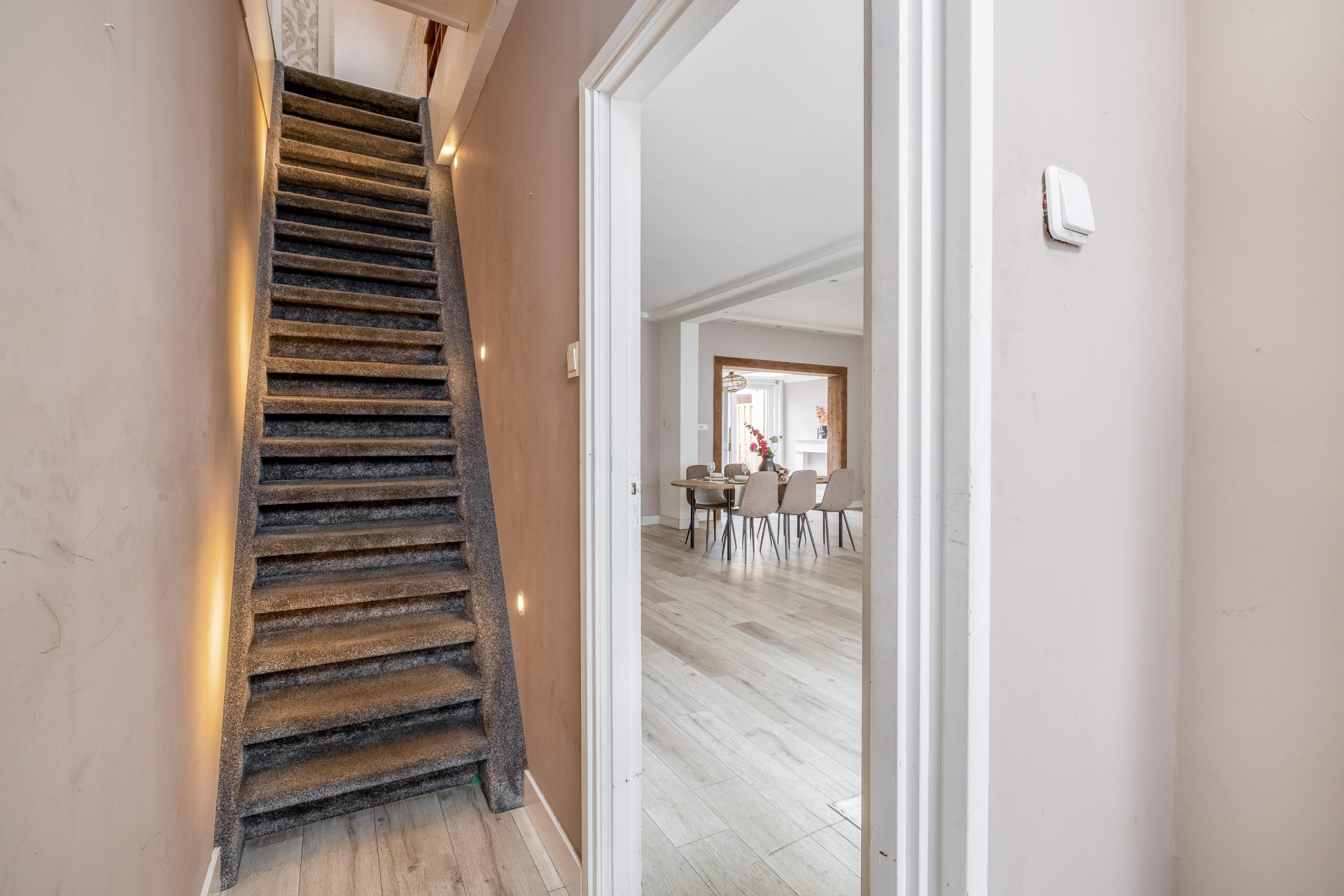 Bij binnenkomst valt direct de ruimte op. Dit huis is in het verleden samengevoegd uit twee woningen en dat merk je: de woonkamer is uitzonderlijk ruim en heeft een prettige indeling met een duidelijk zit- en eetgedeelte.