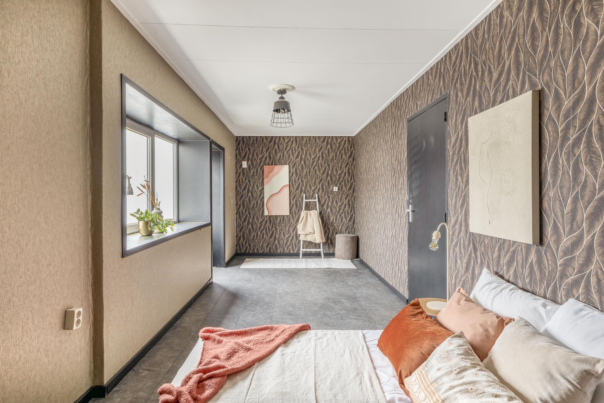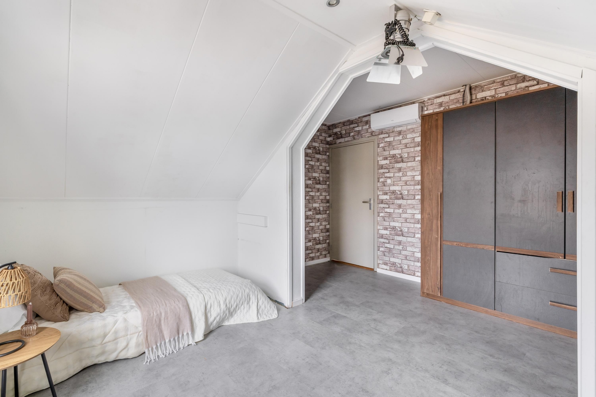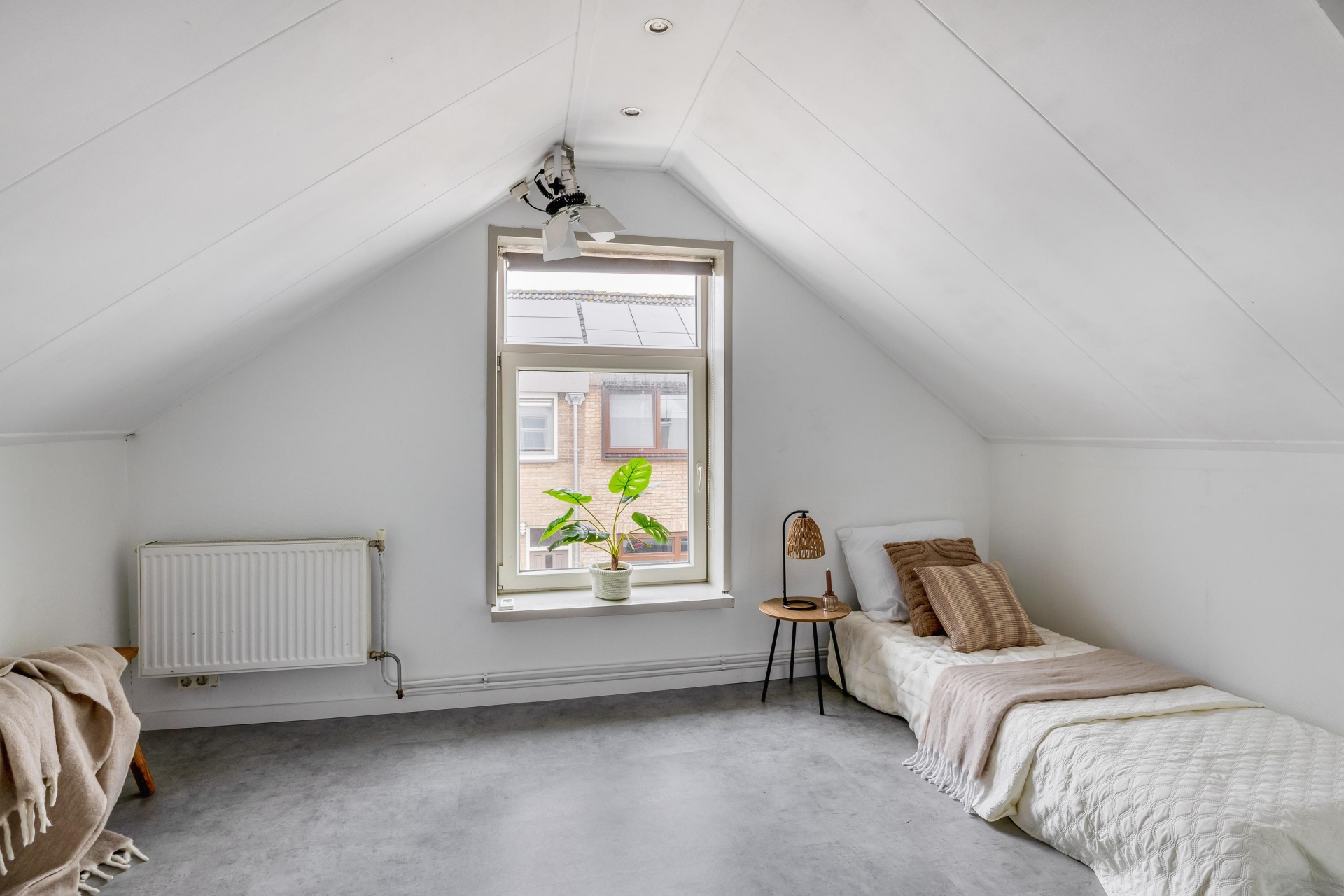 De twee kamers aan de voorzijde hebben een speelse indeling dankzij de puntdaken. Eén van deze kamers is voorzien van airconditioning, de andere beschikt over vaste kastruimte.