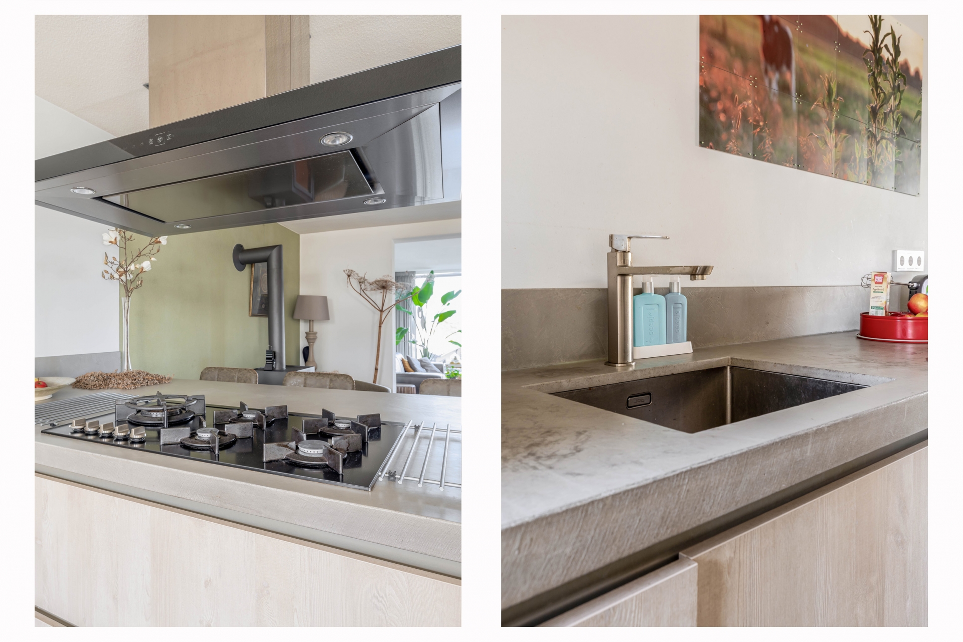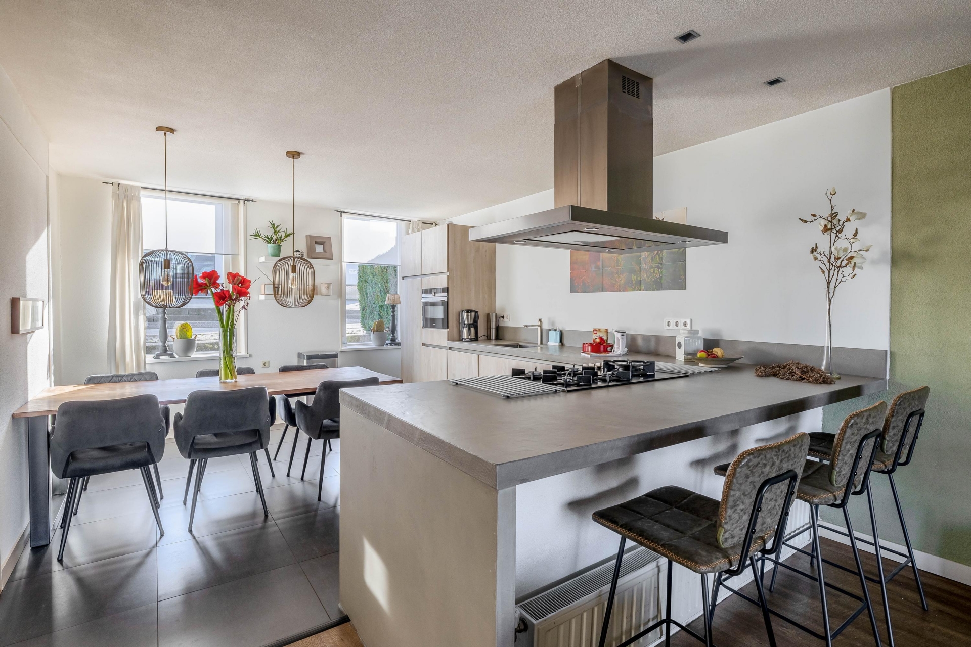 De moderne woonkeuken is een fijne plek waar koken en samenzijn centraal staan. Hier is volop ruimte voor een grote eettafel waar familie en vrienden gemakkelijk aanschuiven. De keuken vormt daarmee echt het hart van het huis.