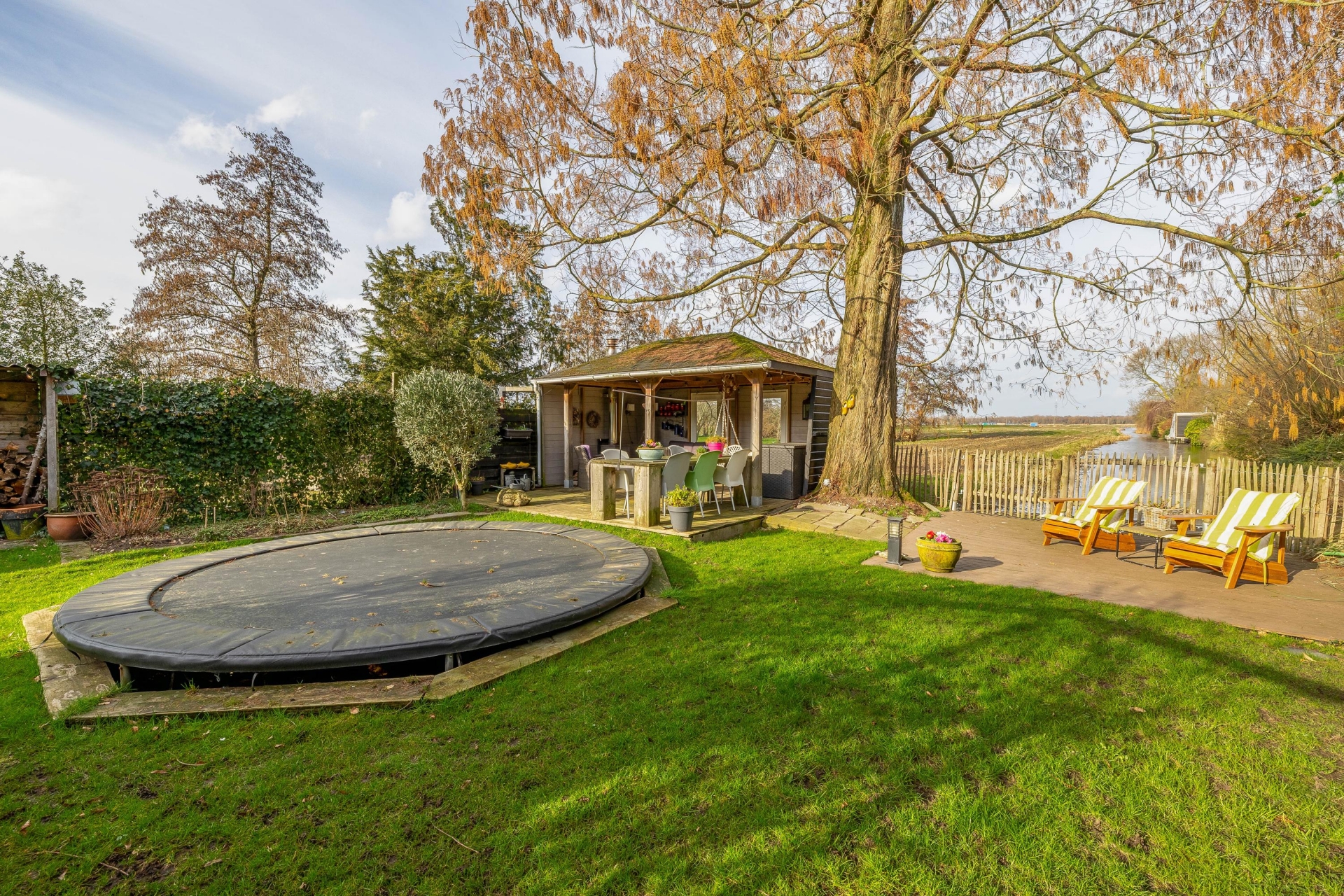 Achter in de tuin staat een sfeervol prieel met houtkachel. Dit is een heerlijke plek waar je tot in de late uurtjes kunt genieten van lange zomeravonden met vrienden en familie. Vanaf hier kijk je uit over de polder en ervaar je de rust en vrijheid van het buitenleven.