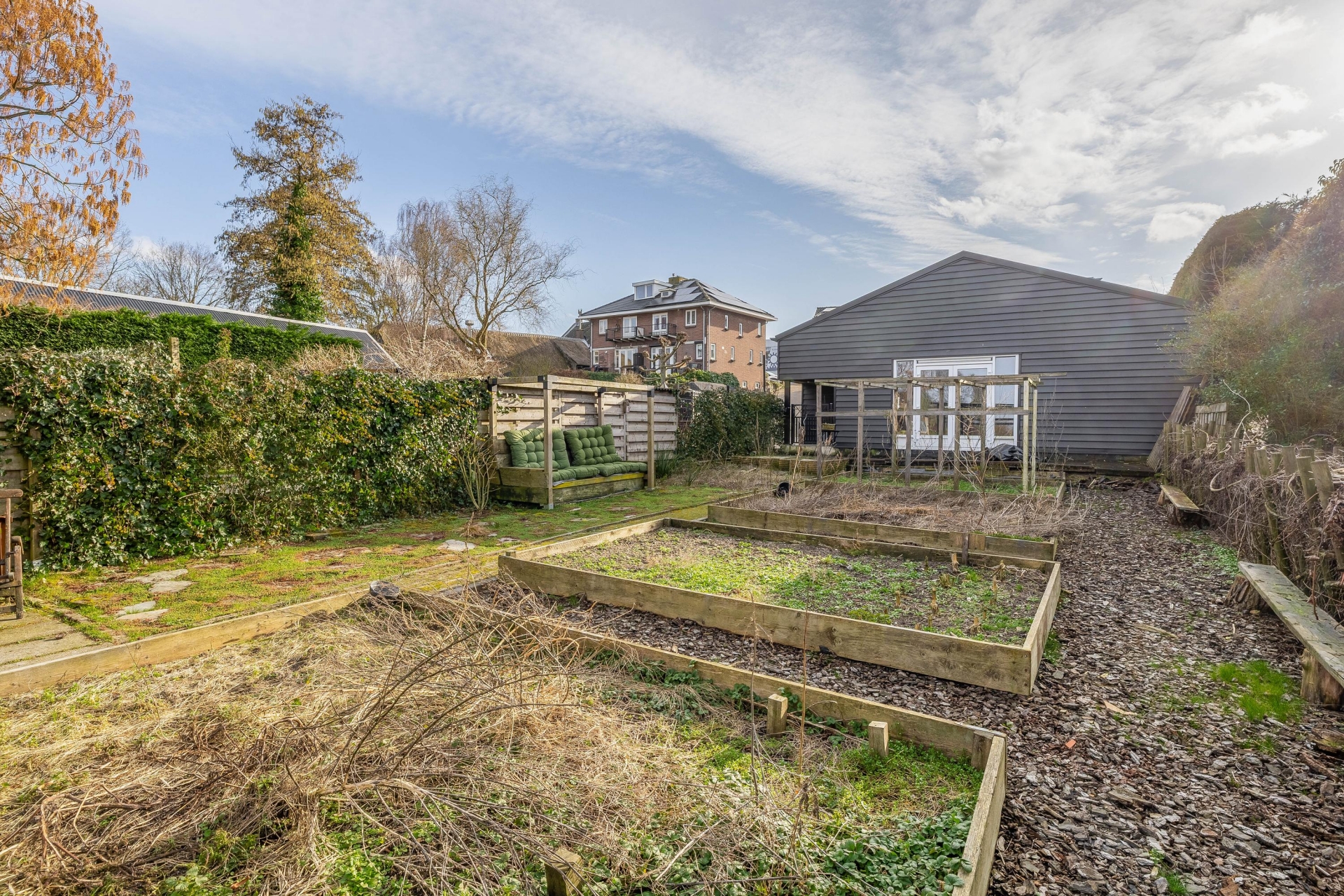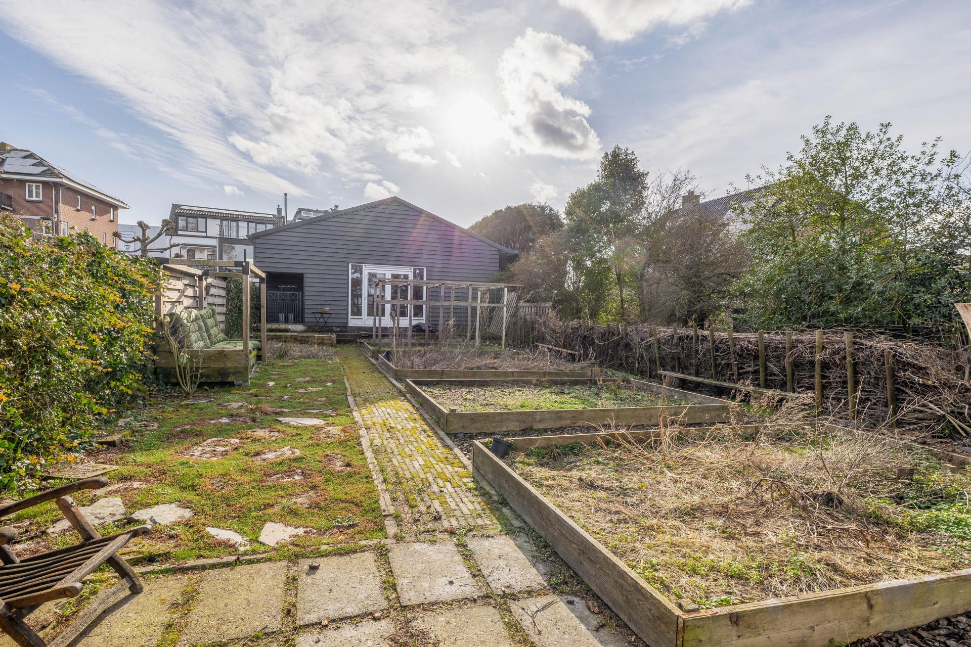 De tuin rondom het huis is royaal en biedt volop mogelijkheden voor ontspanning en buitenleven. Hier is ruimte genoeg voor een grote moestuin, speeltoestellen voor de kinderen of meerdere terrassen om van de zon te genieten.