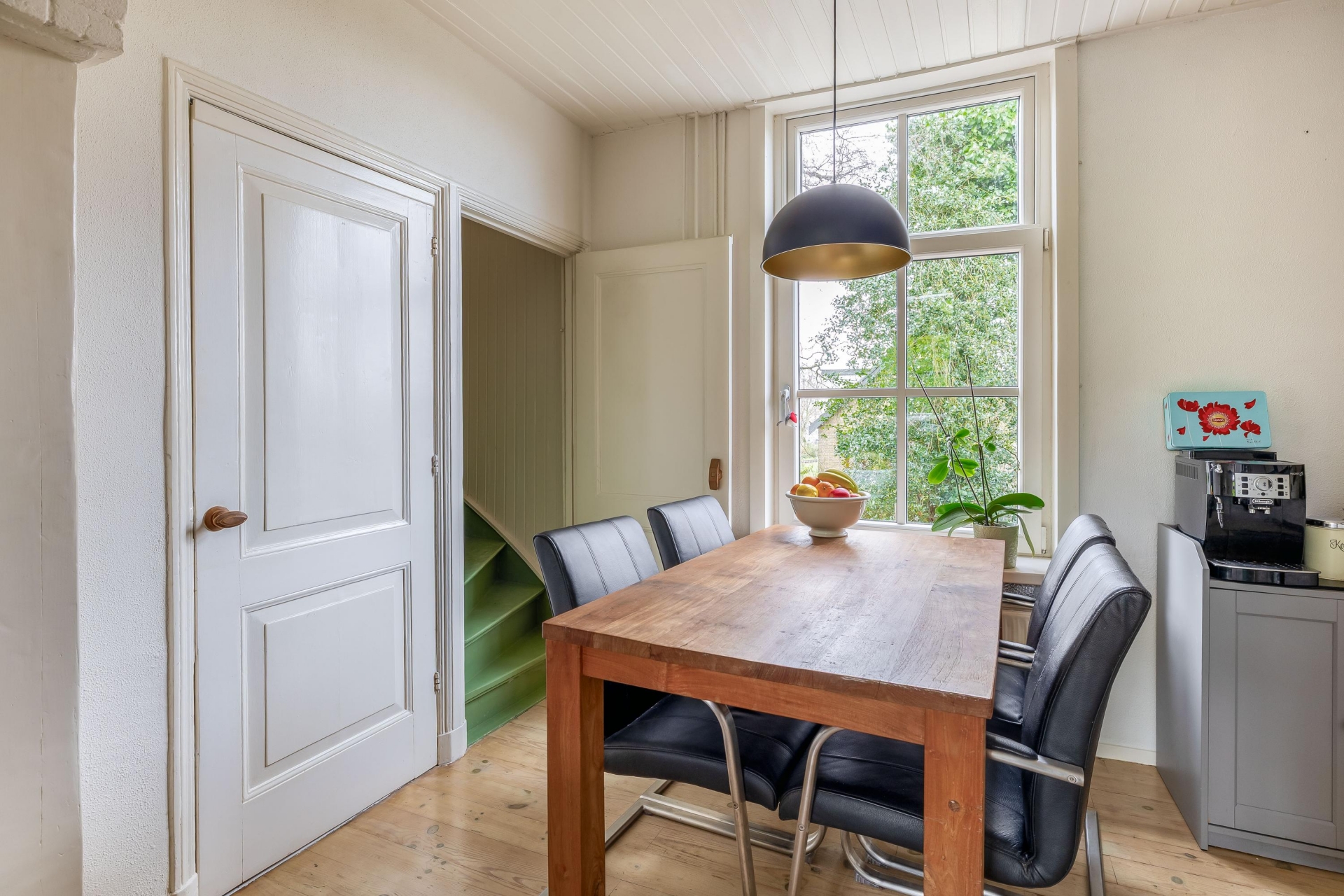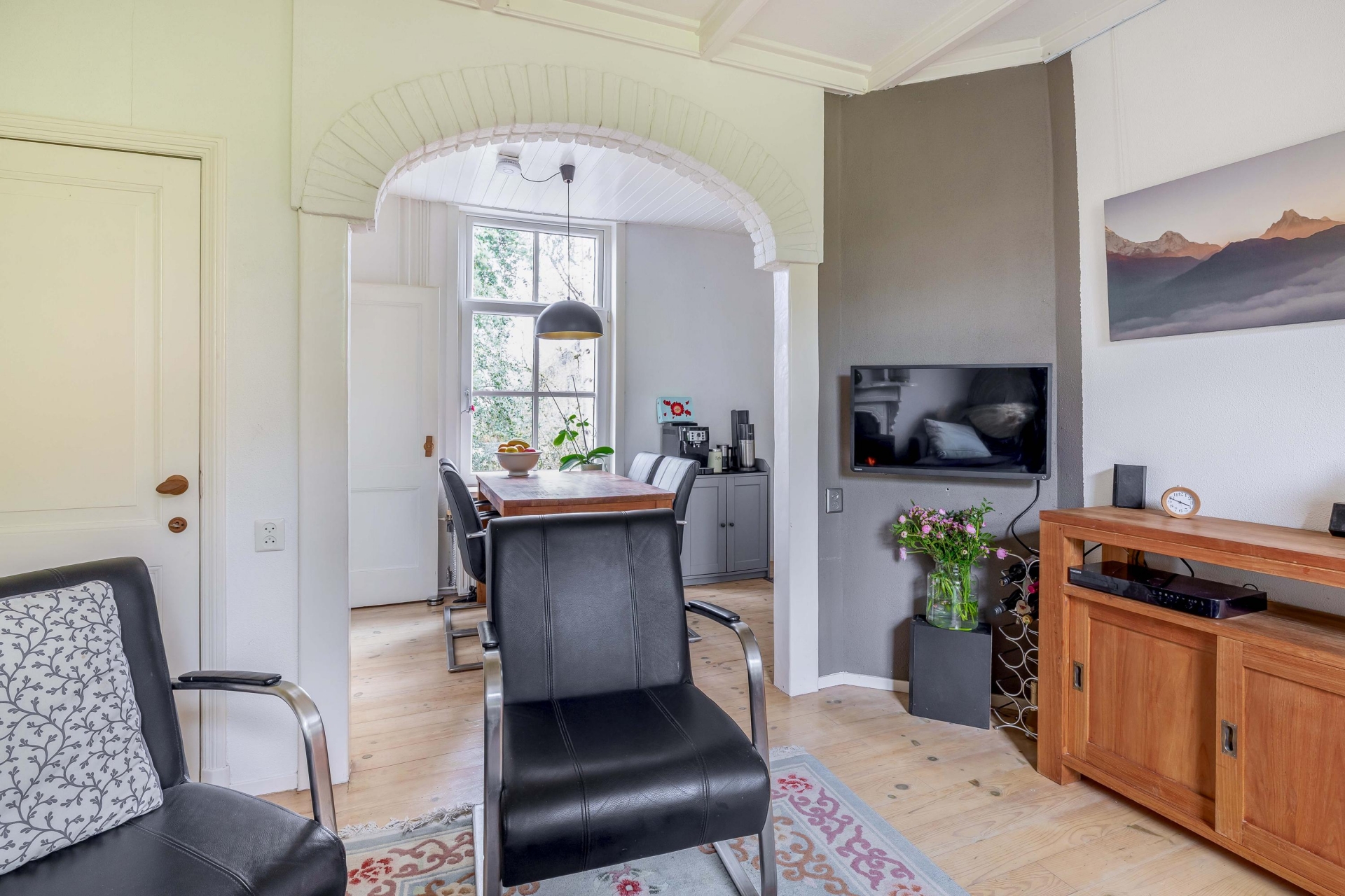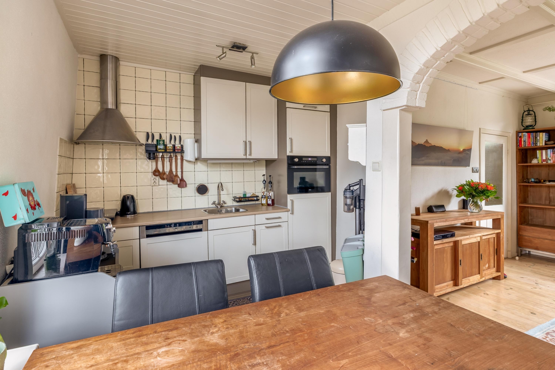 Via de entree kom je binnen in de gezellige woonkamer. Hier valt meteen de prettige lichtinval op, gecombineerd met de mooie details zoals het balkenplafond en de schouw met houtkachel. Dit is zo’n ruimte waar je je direct thuis voelt. De zithoek is knus en overzichtelijk, maar biedt voldoende plek voor een comfortabele opstelling. Aan de achterzijde van de woonkamer is ruimte voor een eettafel, waar je uitkijkt richting de tuin. De open verbinding richting de keuken zorgt voor een fijne flow in het huis, waardoor het geheel ruimtelijk aanvoelt.
