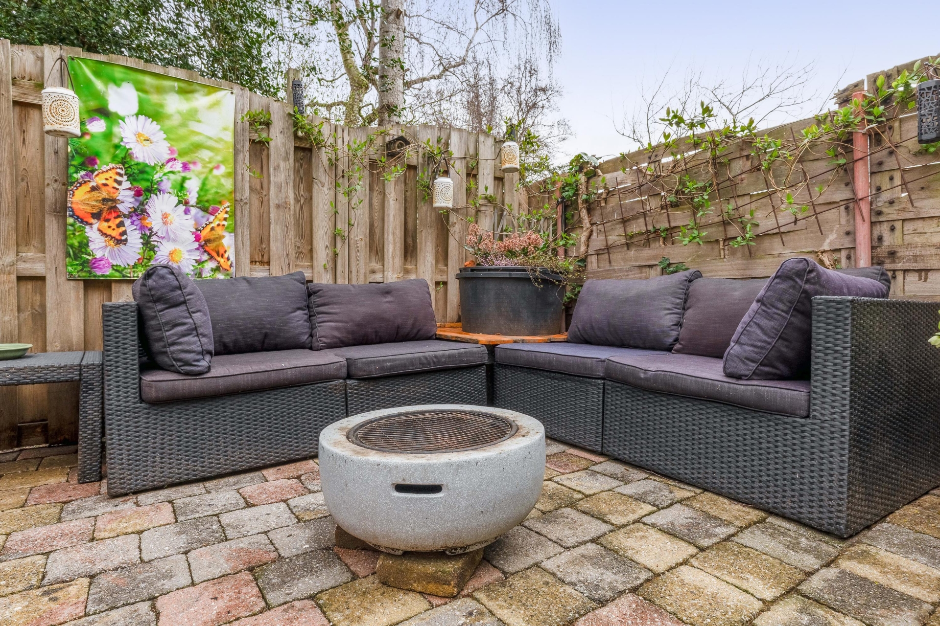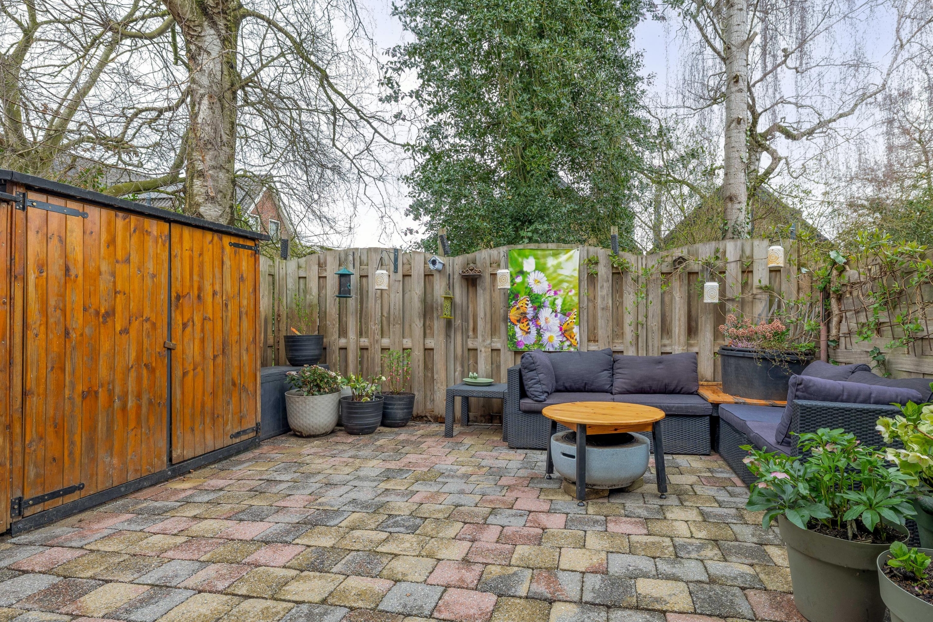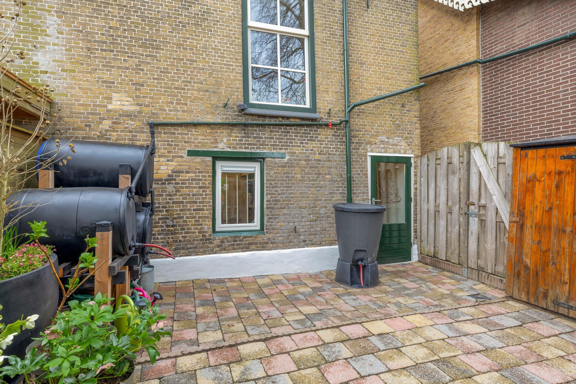 De tuin ligt beschut en biedt volop privacy. De bestrating maakt het onderhoudsvriendelijk, terwijl het groen en de omliggende beplanting zorgen voor een gezellige sfeer.