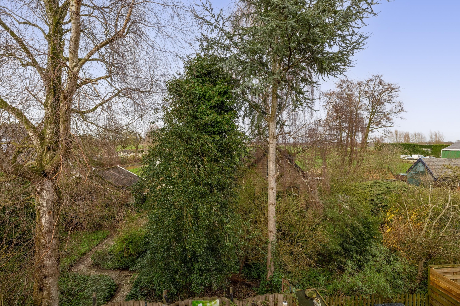 Wat deze plek echt bijzonder maakt, is het vrije gevoel aan de achterzijde. Door de bomen heen kijk je uit over de weilanden, wat zorgt voor een rustige en landelijke beleving. Een fijne plek om buiten te zitten, te ontspannen of gezellig met vrienden te borrelen.