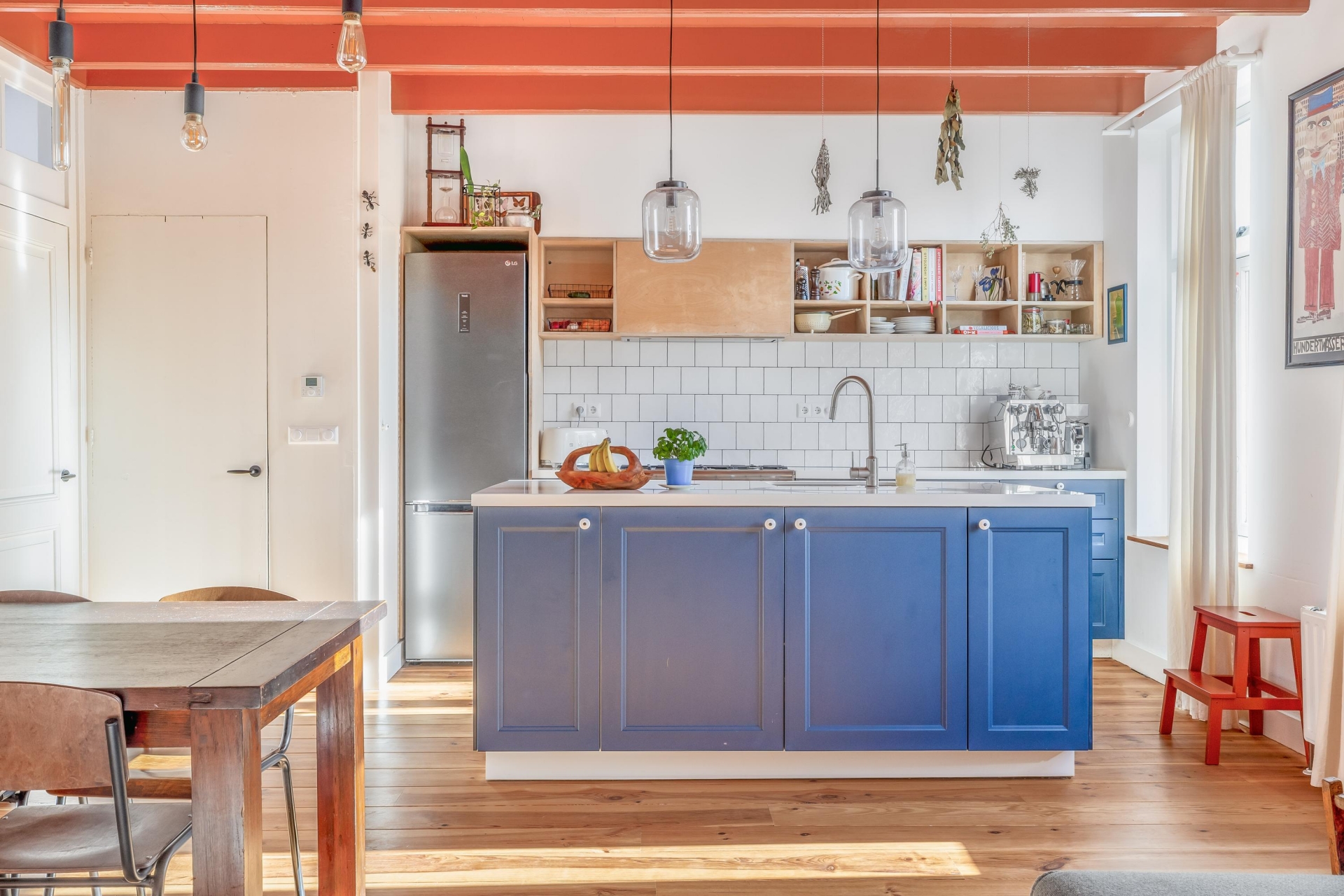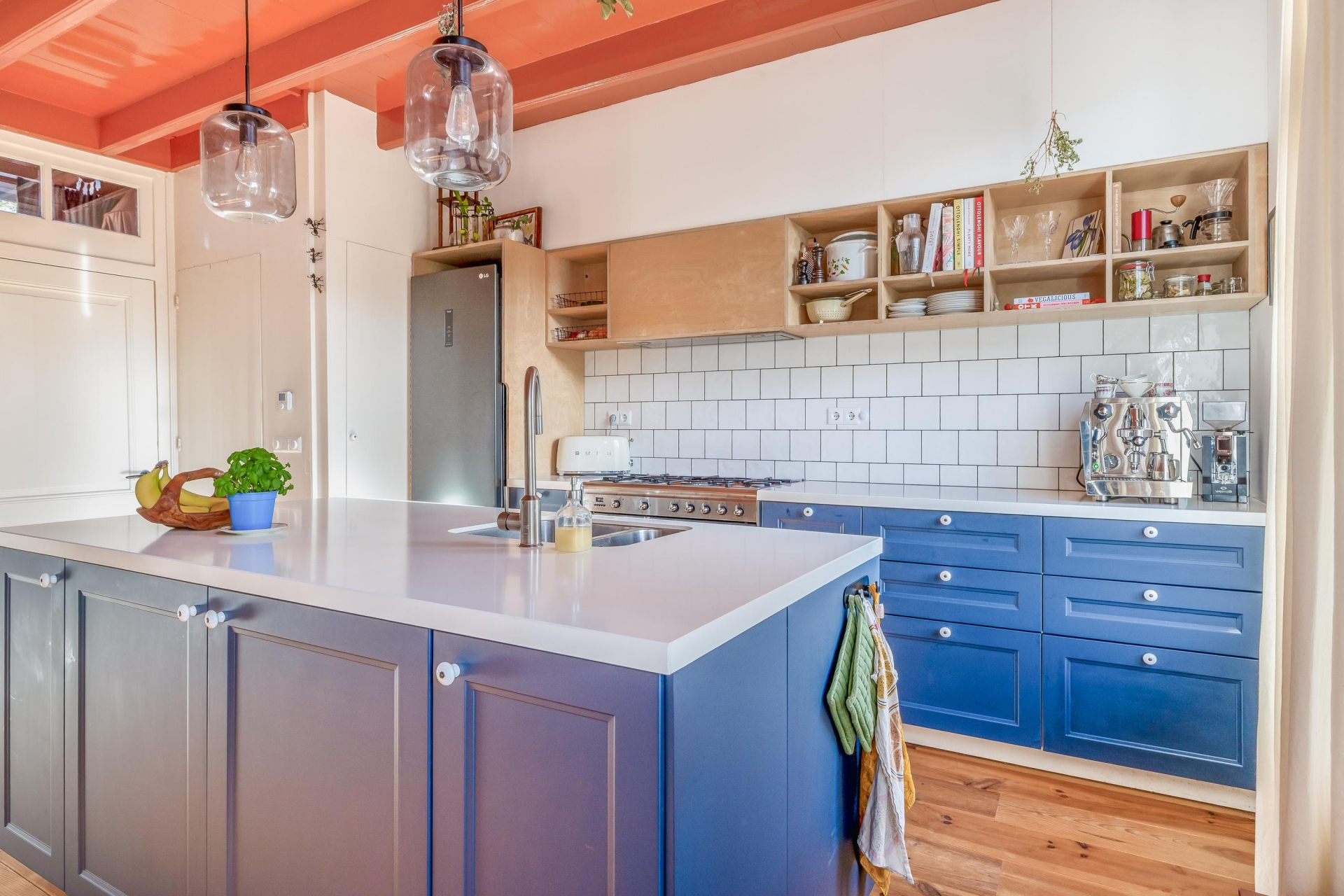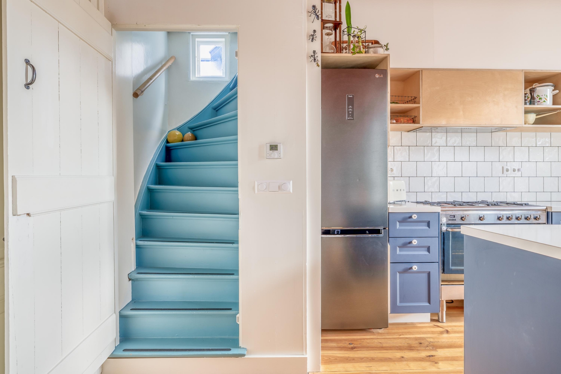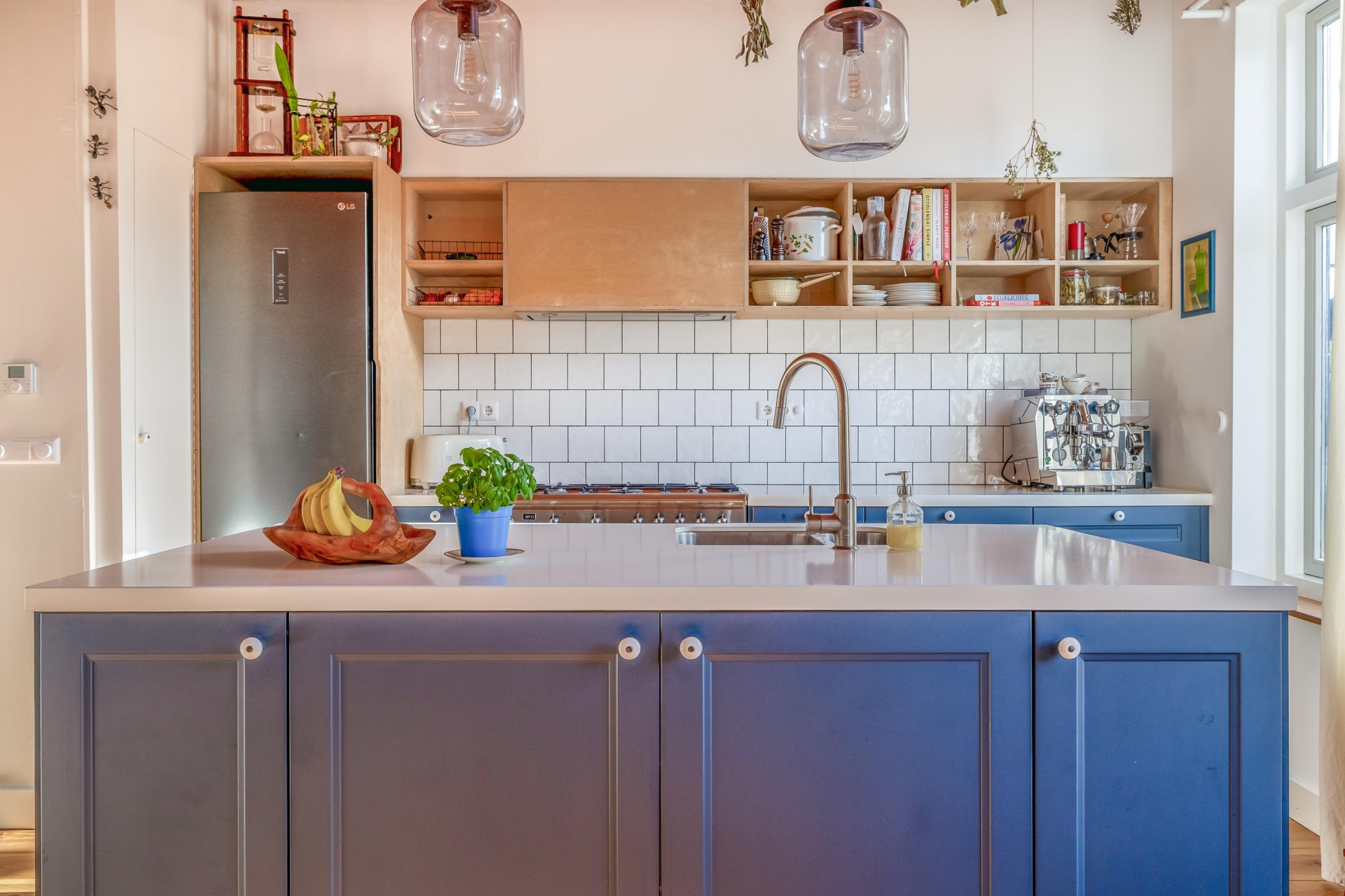 De woonkeuken is zonder twijfel één van de blikvangers van het huis. Het kookeiland in diepblauw contrasteert prachtig met de lichte wandtegels en het warme hout van de vloer. De open schappen, het royale werkblad en de ruimte rondom het eiland maken dit een plek waar je niet alleen kookt, maar ook samenkomt.