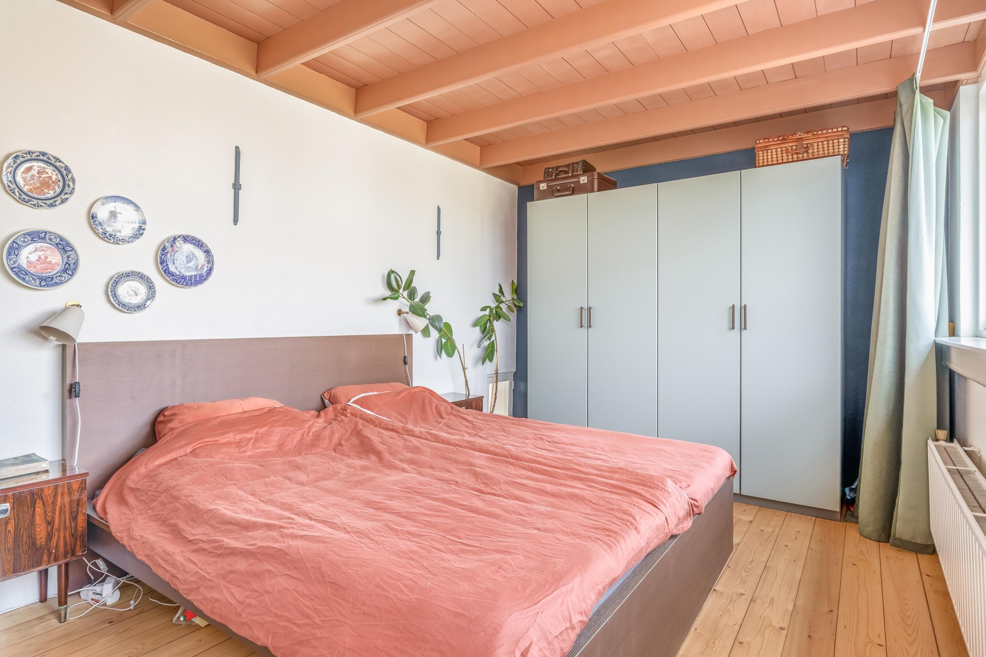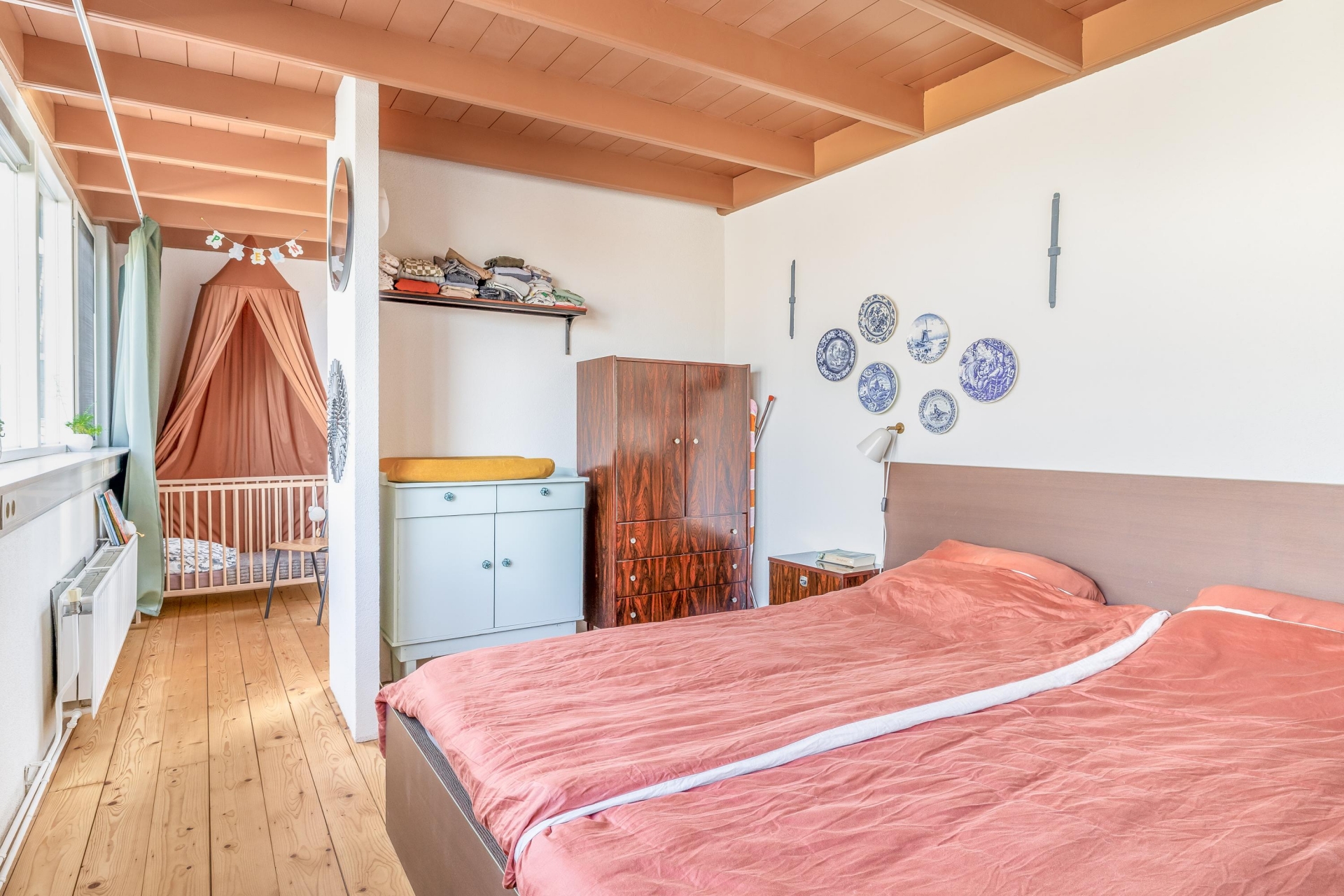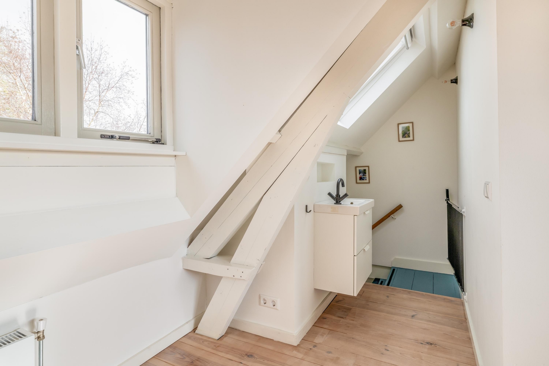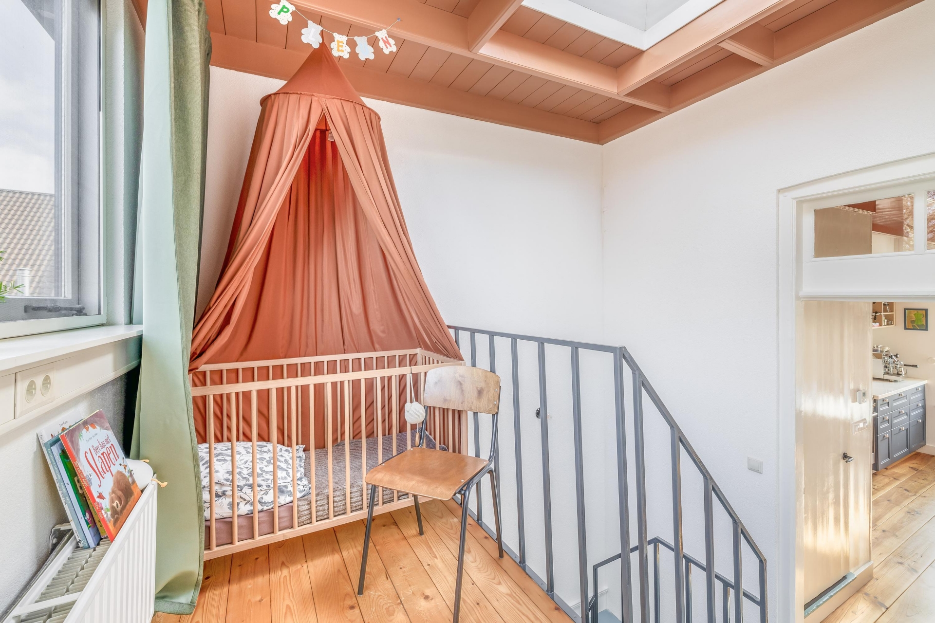De zichtbare balken en het kleurgebruik geven de ruimte een eigen identiteit; modern, maar met respect voor het bouwjaar van het huis.