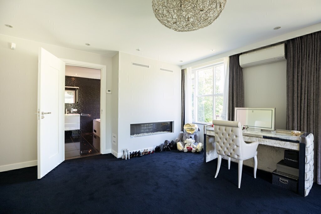 Aan de rechterzijde op de begane grond vind u tevens de hoofdslaapkamer met badkamer ensuite, gashaard, inloopkast met vaste kastenwand en openslaande deuren naar achterterras. De badkamer is v.v. bubbelbad, aparte douche, 2e toilet, nisje met glasplaten voor de handdoeken, mechanische ventilatie en dubbele wastafel.