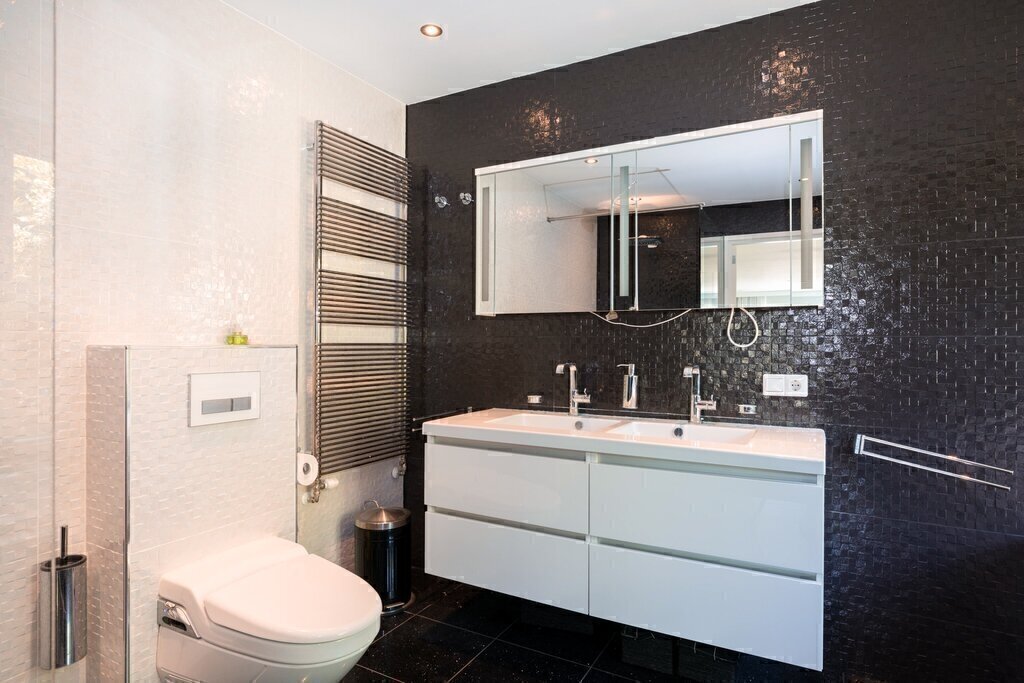 De modern en luxe badkamer is v.v. 2e toilet, bubbelbad, inloopdouche, wastafel, spiegel en verlichting.
