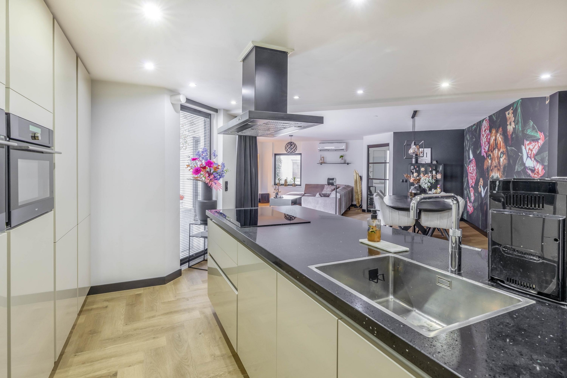 Entree met toegang tot het toilet en de lichte, tuingerichte woonkamer. De ruimte heeft een speelse indeling en beschikt over een fraaie PVC-vloer met vloerverwarming. De woonkamer beschikt over een cinewall, een stalen tussendeur en zwarte plinten. Hierdoor is er een luxe uitstraling gecreëerd. Voor comfort is er nog een airconditioning geplaatst. De open keuken is geplaatst in 2020 en beschikt over alle benodigde inbouwapparatuur. Achter de keuken is een tussenportaal te vinden, welke toegang biedt tot een slaapkamer en de trapopgang naar de eerste verdieping.
