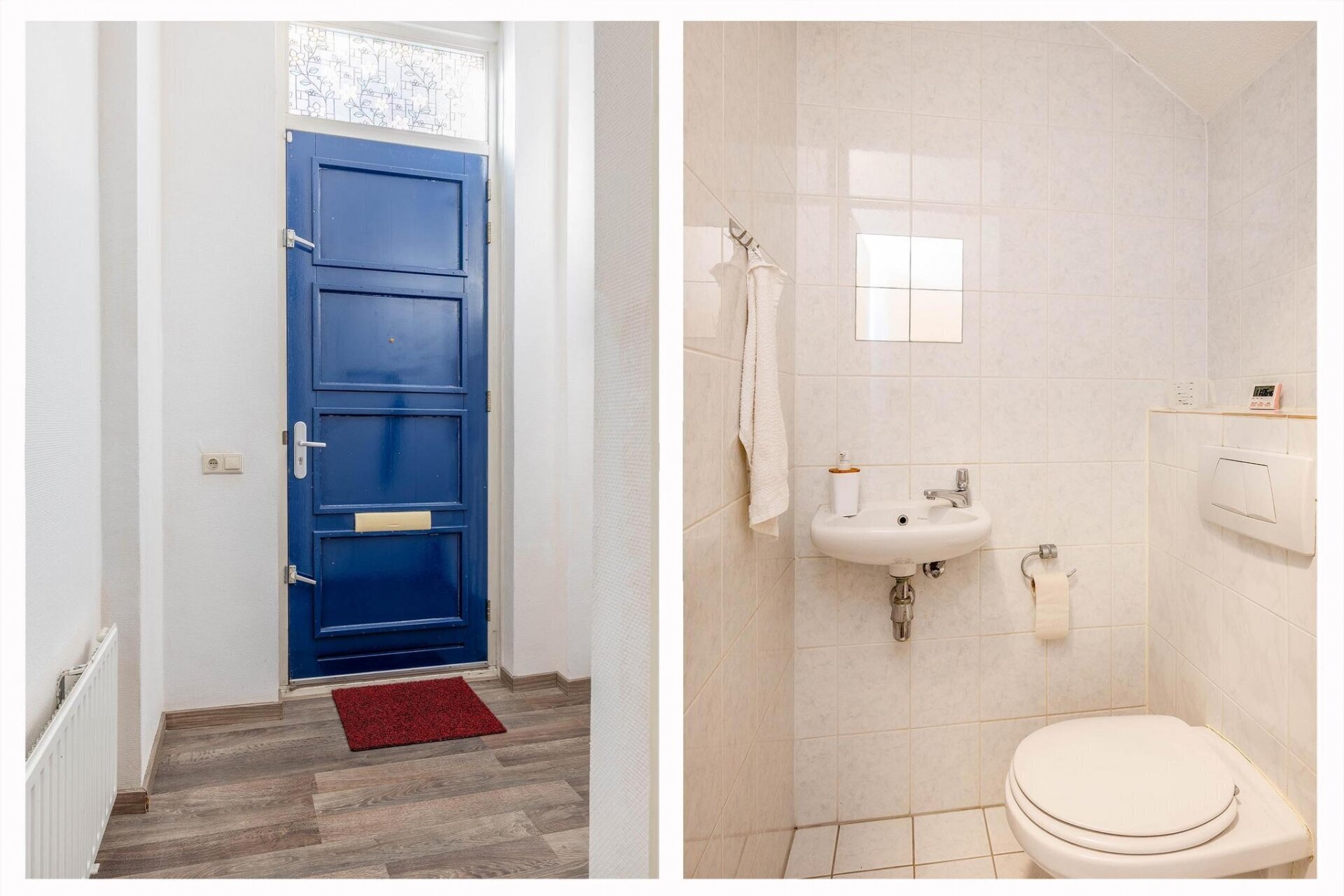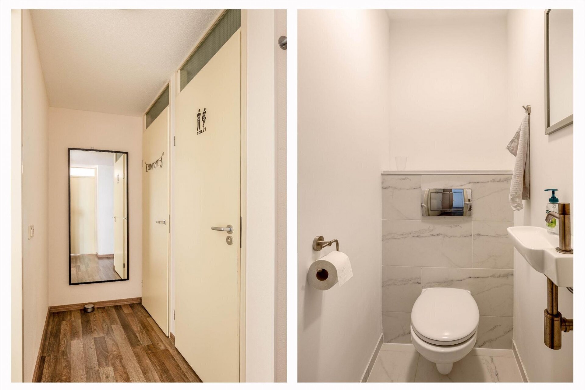 • Moderne Gemakken: Een stijlvol toilet en een aparte berging voor een wasmachine en droger.