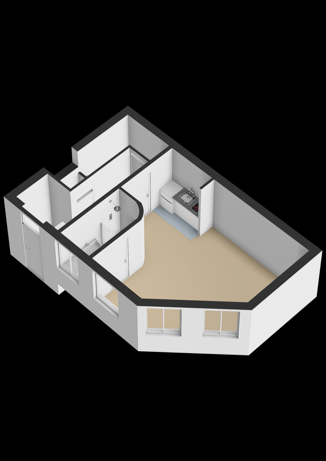 De begane grond, bereikbaar via een interne trap of een eigen ingang aan de Calliopestraat, is ontworpen als een zelfstandige studio. Het omvat: