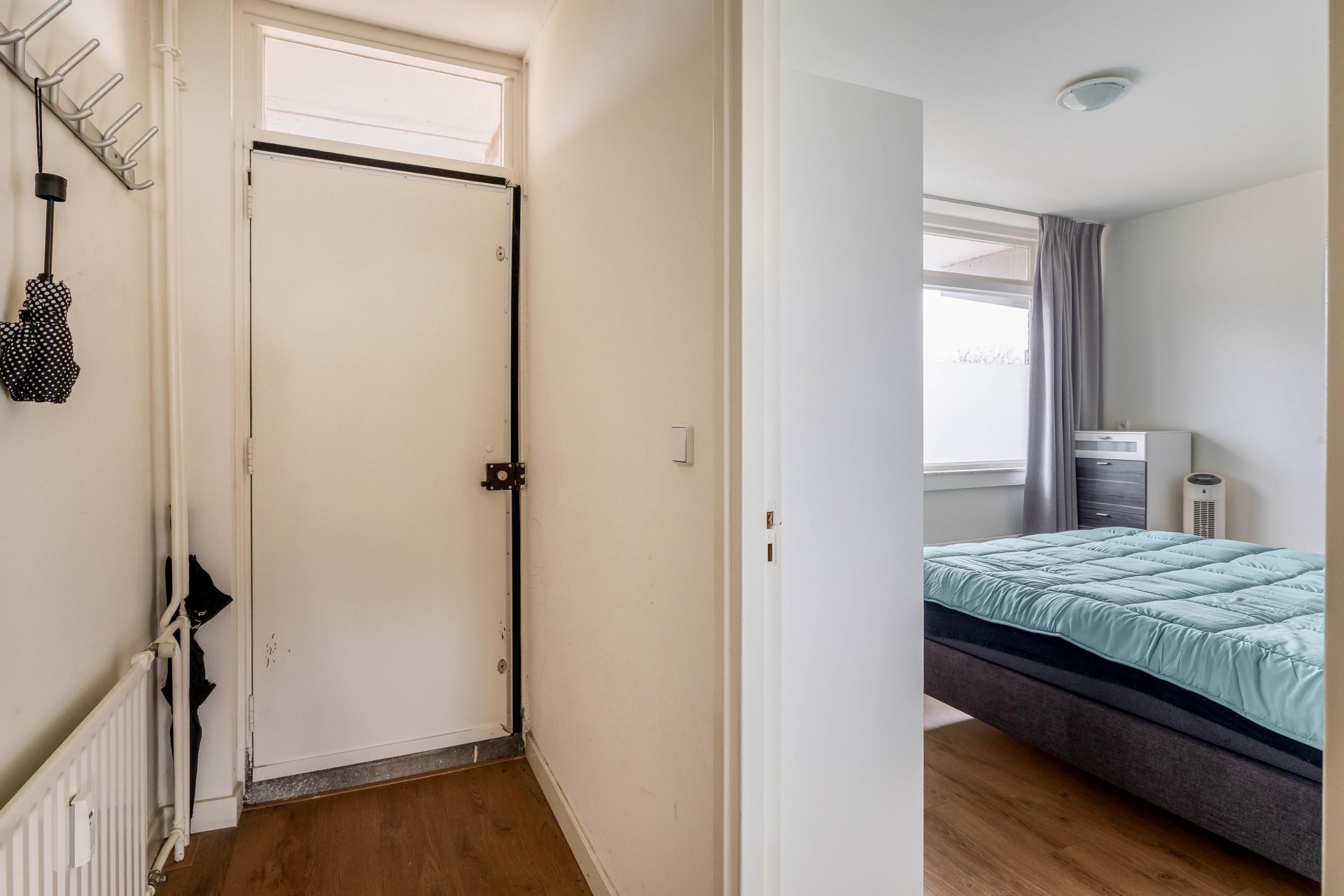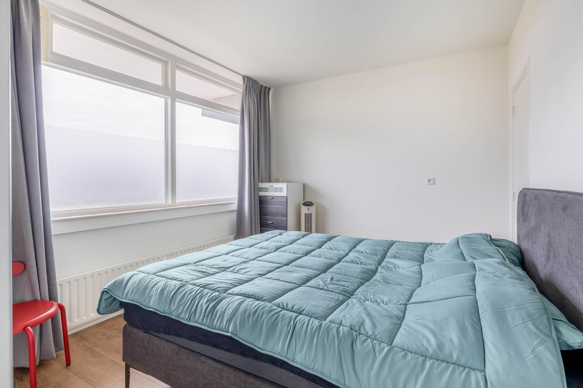 De slaapkamer is goed van formaat en biedt voldoende ruimte voor een tweepersoonsbed en een kledingkast. Ook hier zorgen de ramen voor prettig daglicht. Door de efficiënte indeling voelt het appartement groter aan dan de vierkante meters doen vermoeden.