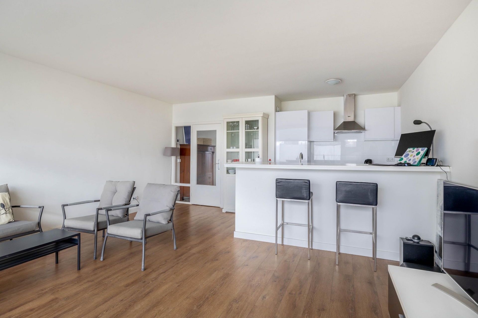 Zodra je binnenkomt valt direct de fijne lichtinval op. De grote raampartijen zorgen voor een open en frisse uitstraling. De woonkamer is praktisch in te delen met een comfortabele zithoek én een eethoek. Dankzij de neutrale afwerking en de laminaatvloer voelt het geheel verzorgd en instapklaar aan.