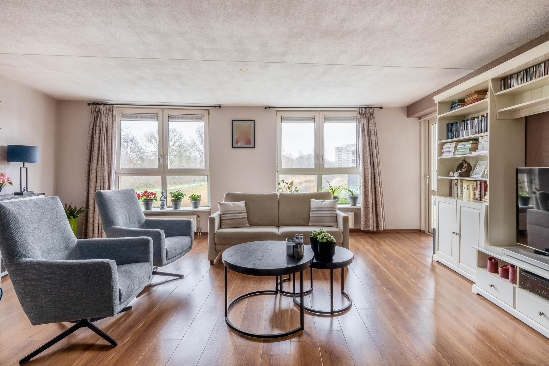 De woonkamer is direct het hart van het huis. Wat hier meteen opvalt, is het licht. Dankzij de grote raampartijen en de bijzondere, licht gebogen gevel stroomt het daglicht royaal naar binnen. Vanuit de zithoek kijk je uit over het water en de groene omgeving. De ruimte is royaal opgezet, waardoor je hier met gemak een comfortabele zithoek en een ruime eethoek kwijt kunt.