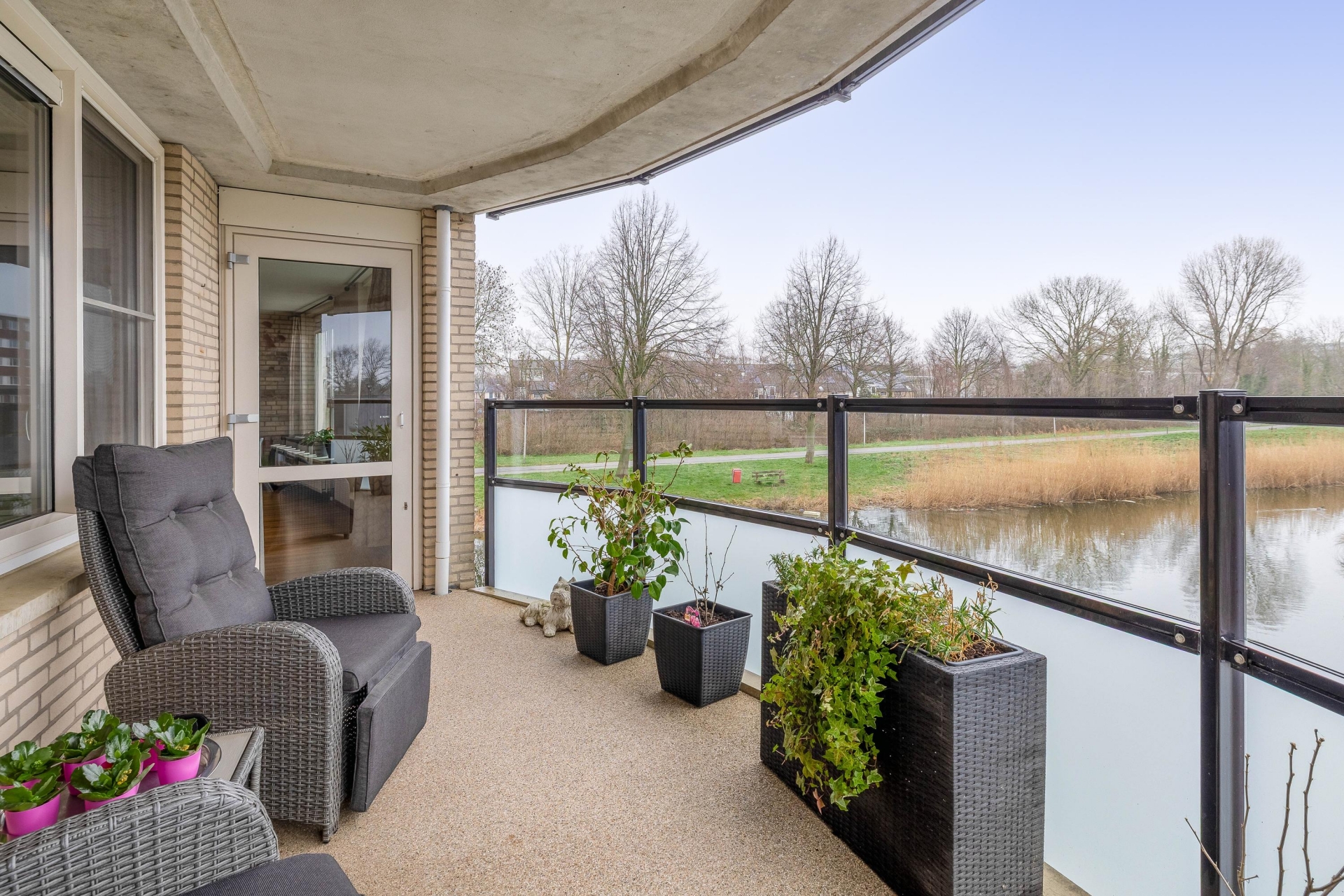 Via de woonkamer stap je zo het balkon op. Ruim genoeg voor twee comfortabele stoelen en een tafeltje, aangevuld met groen. Door de ligging op het oosten geniet je hier vanaf de ochtend tot het begin van de middag van de zon. Het uitzicht is vrij en groen, met water direct voor het complex.