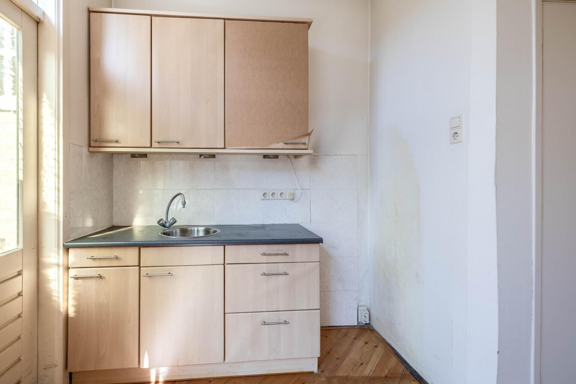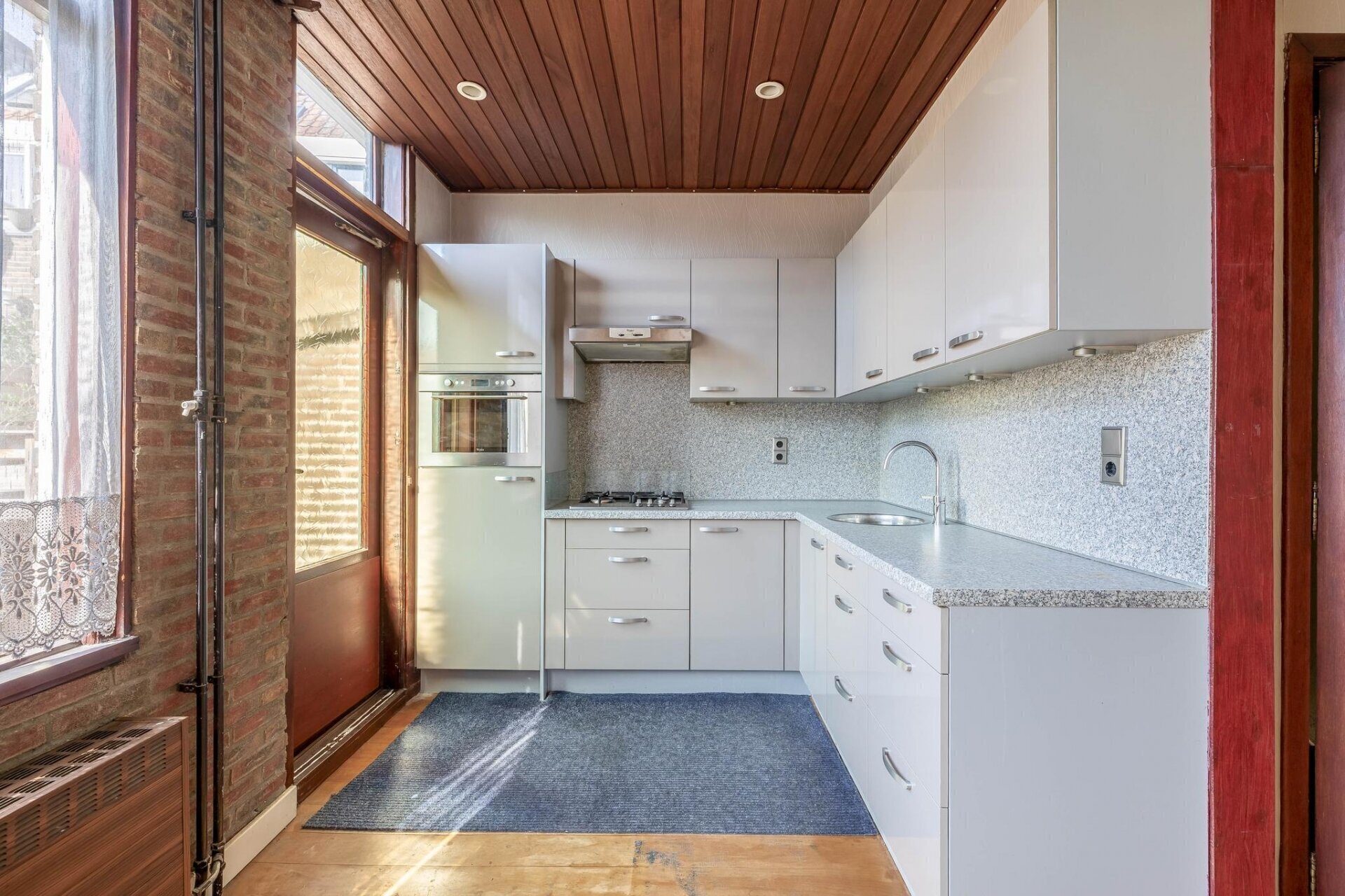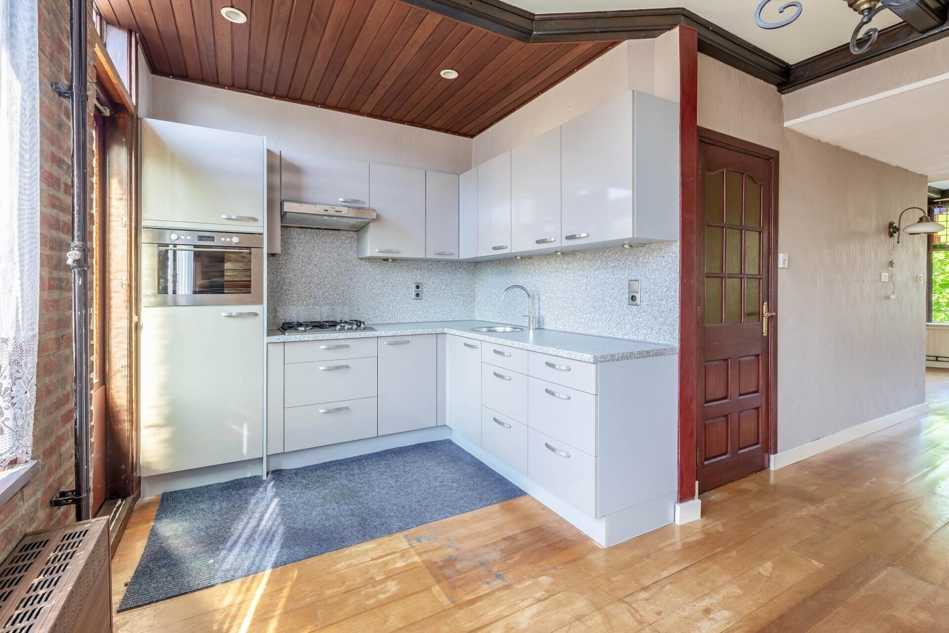 De eerste verdieping beschikt opnieuw over een lichte woonkamer met open keuken. Dankzij de aanwezige inbouwapparatuur – waaronder een 4-pits gasfornuis, combi-magnetron, koelkast, afzuigkap en vaatwasser – is dit een volwaardige leefruimte. Vanuit de keuken loop je zo het balkon op. Deze verdieping heeft bovendien een tweede toilet. Denk je aan dubbele bewoning of een verdieping voor logés of oudere kinderen? Dan zit je hier goed.