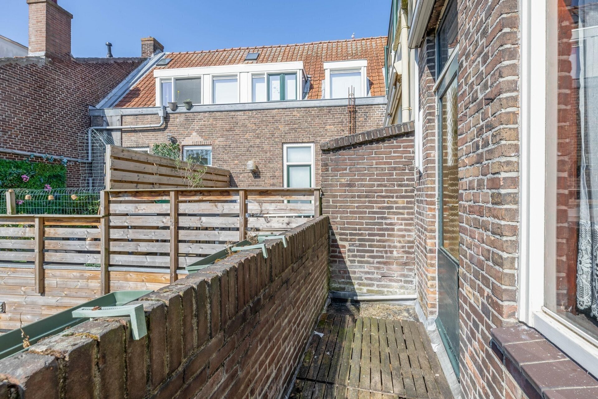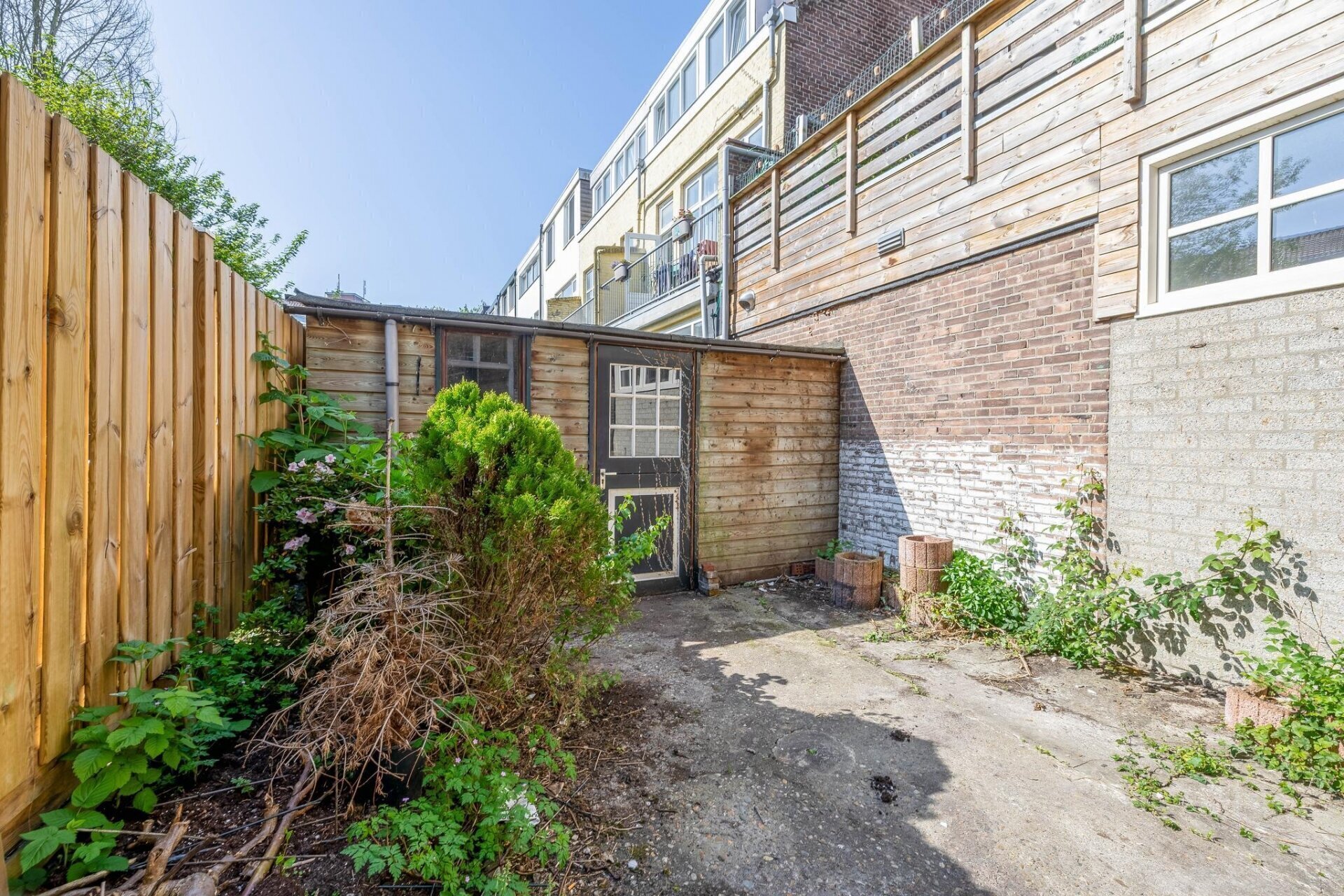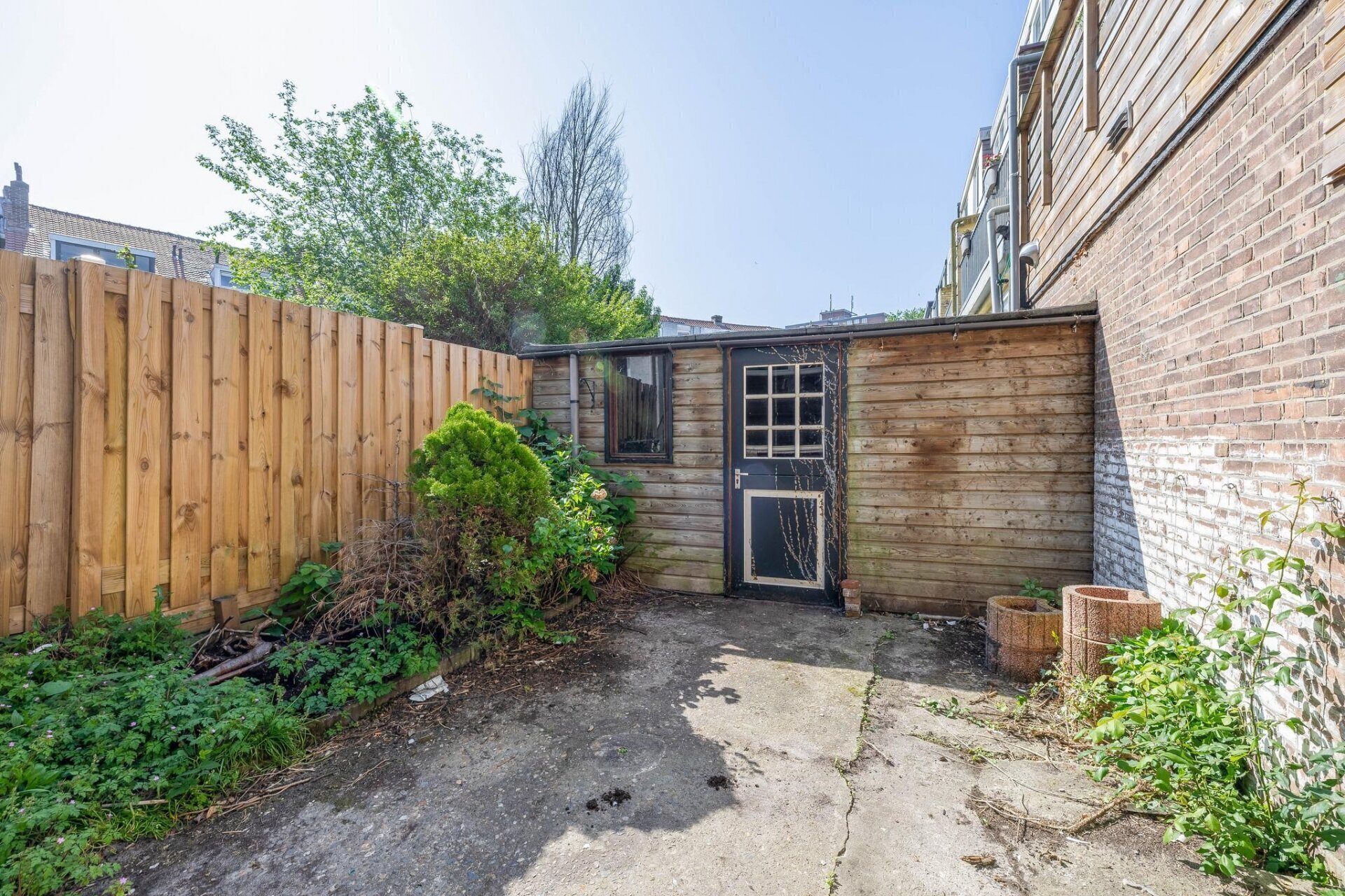 De achtertuin ligt op het zuiden, wat betekent: de hele dag zon! Hier drink je ’s ochtends koffie in de ochtendzon, lunch je met uitzicht op het groen en sluit je de dag af met een goed glas in de avondzon. Achterin de tuin staat een vrijstaande houten berging, ideaal voor fietsen, tuingereedschap of seizoensspullen.