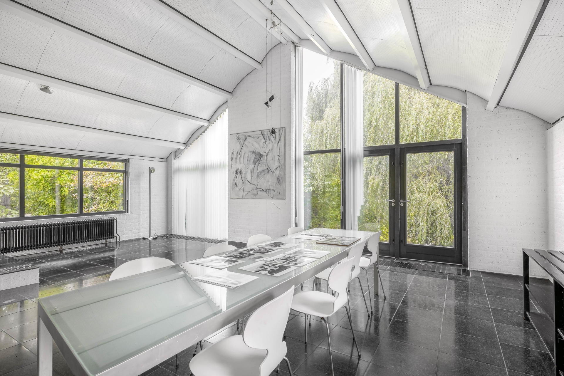 Entree met royale hal, garderobe, meterkast en toiletruimte. De lichte woonkamer is voorzien van hoge plafonds van circa 5,50 m, grote raampartijen en dubbele openslaande deuren naar het eerste terras en de groene tuin. Een open haard en een vide met open trap naar de eerste verdieping geven de leefruimte een unieke uitstraling.