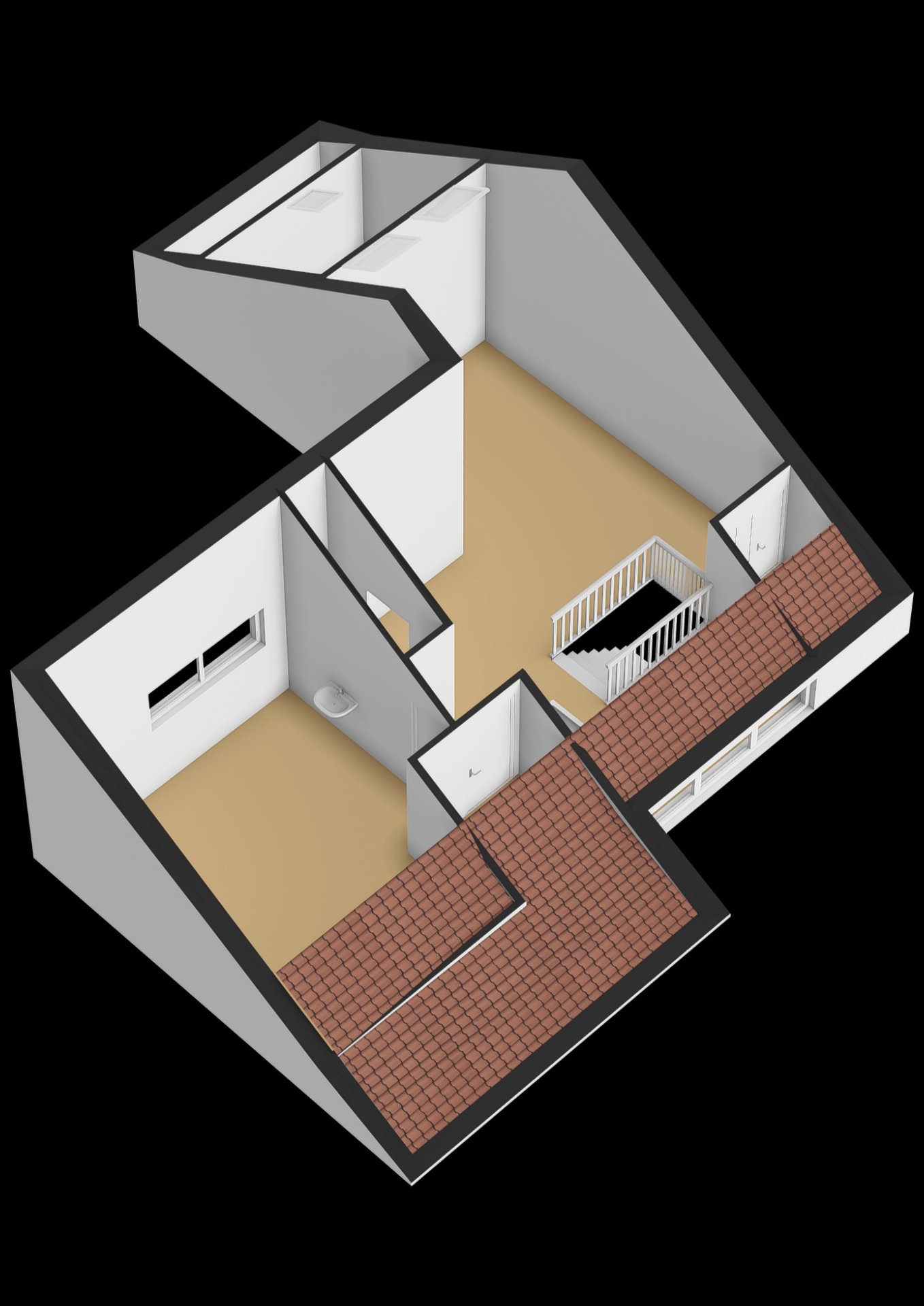 Een speels ingedeelde verdieping met vide en zicht op de woonkamer. Toegang tot de tweede en derde slaapkamer en de stookruimte met opstelplaats voor de CV-ketel.
