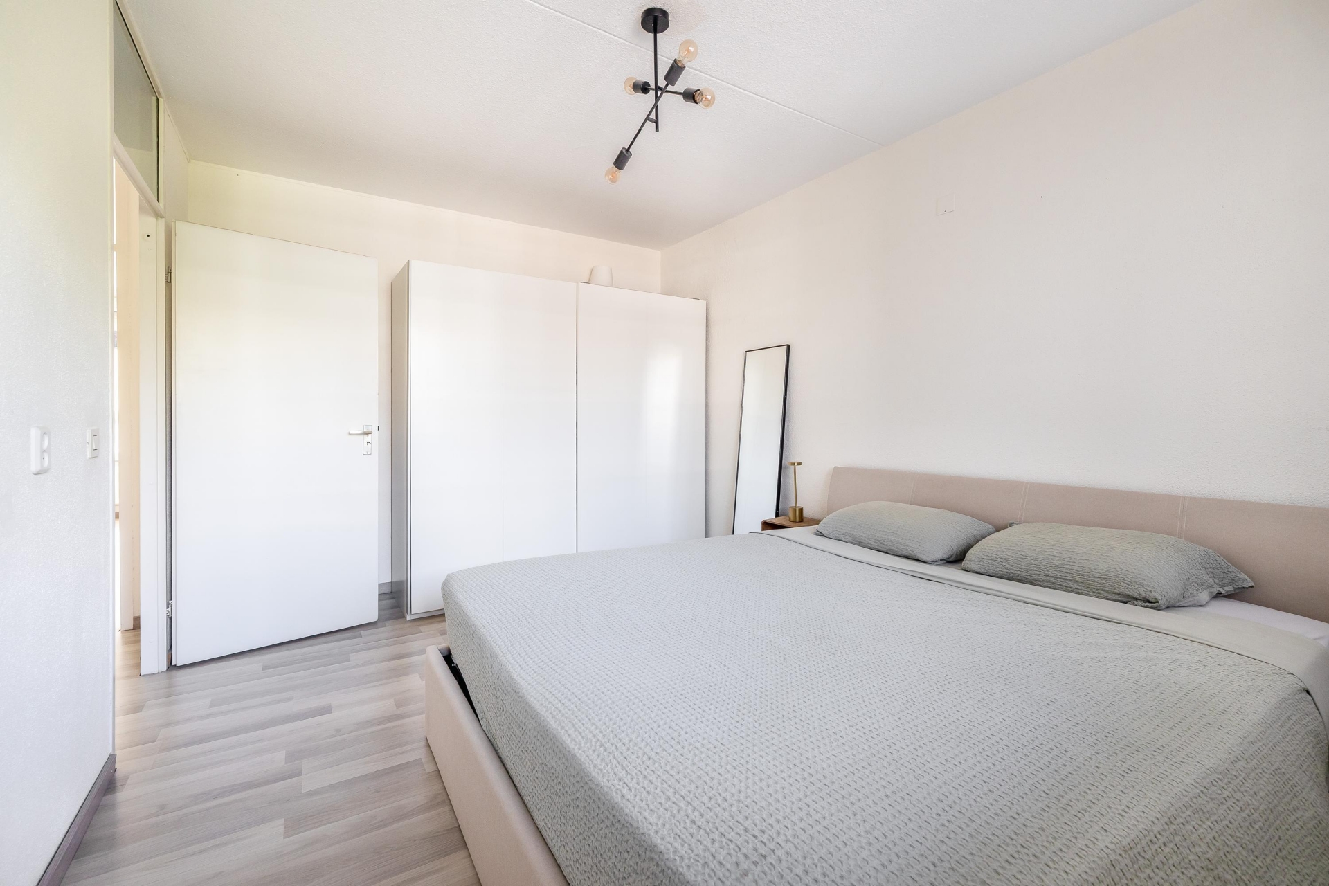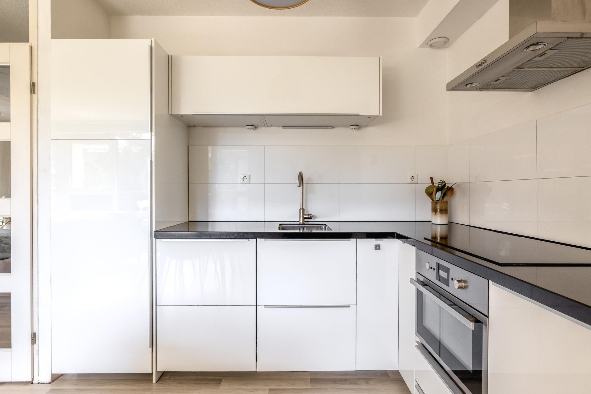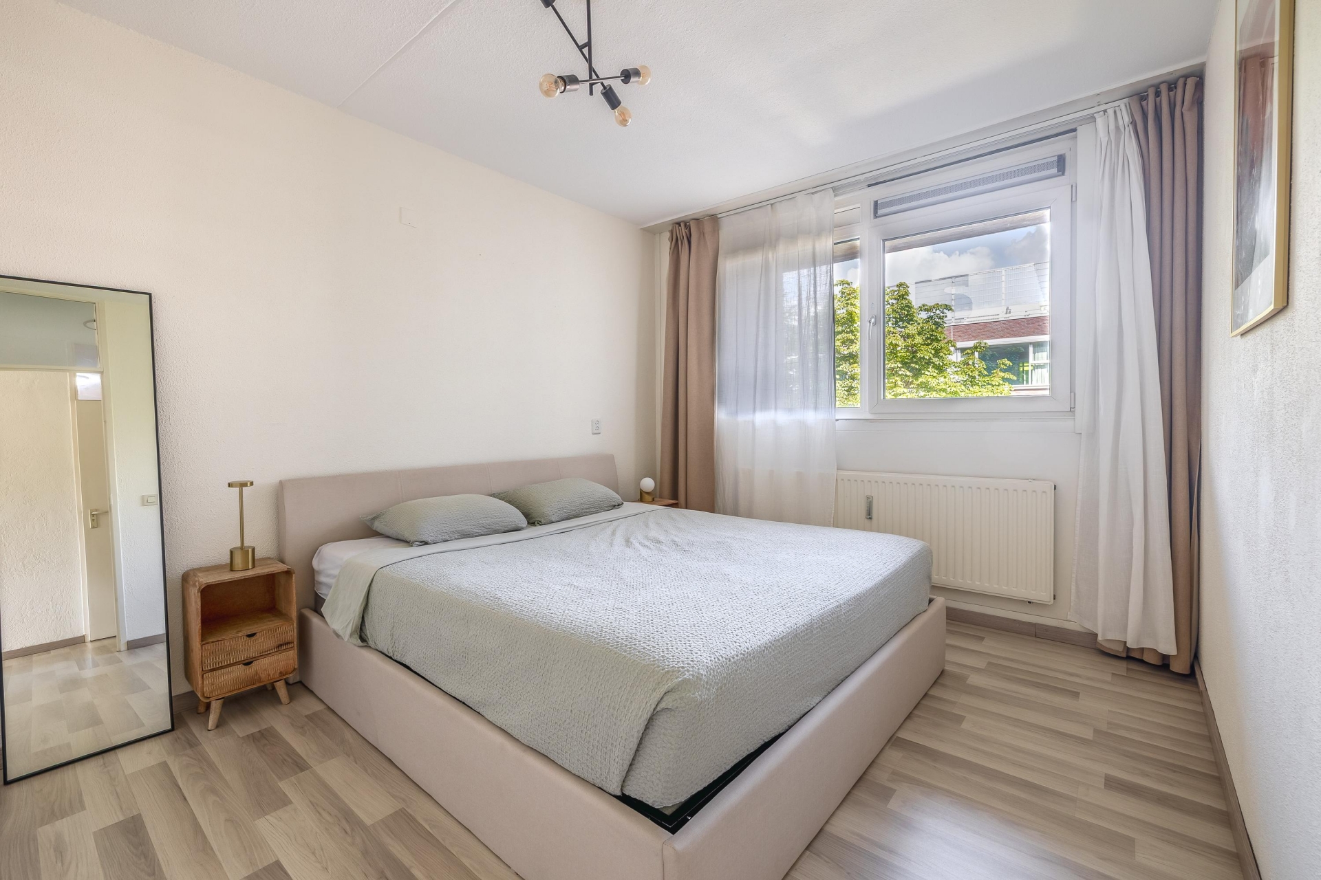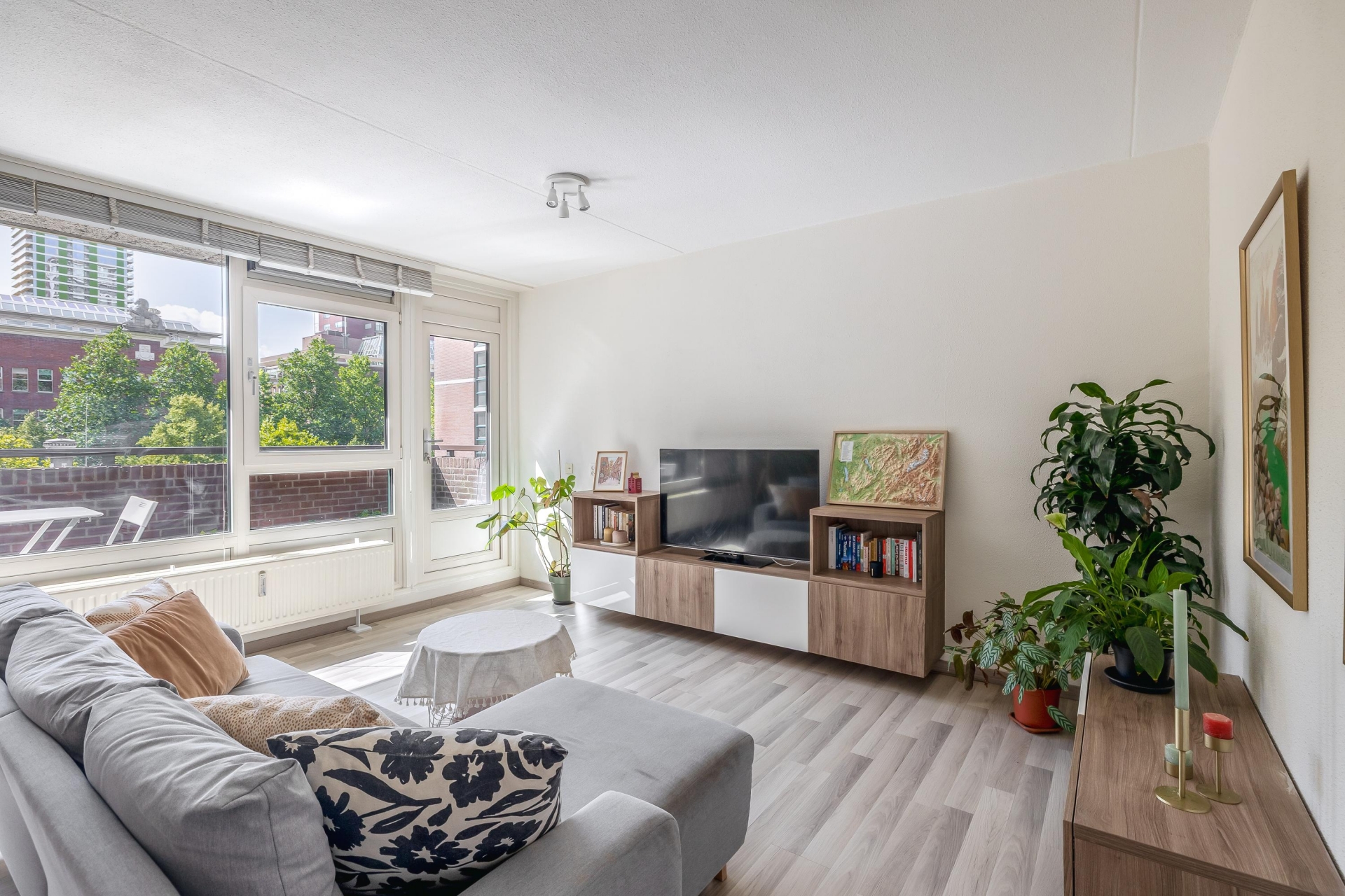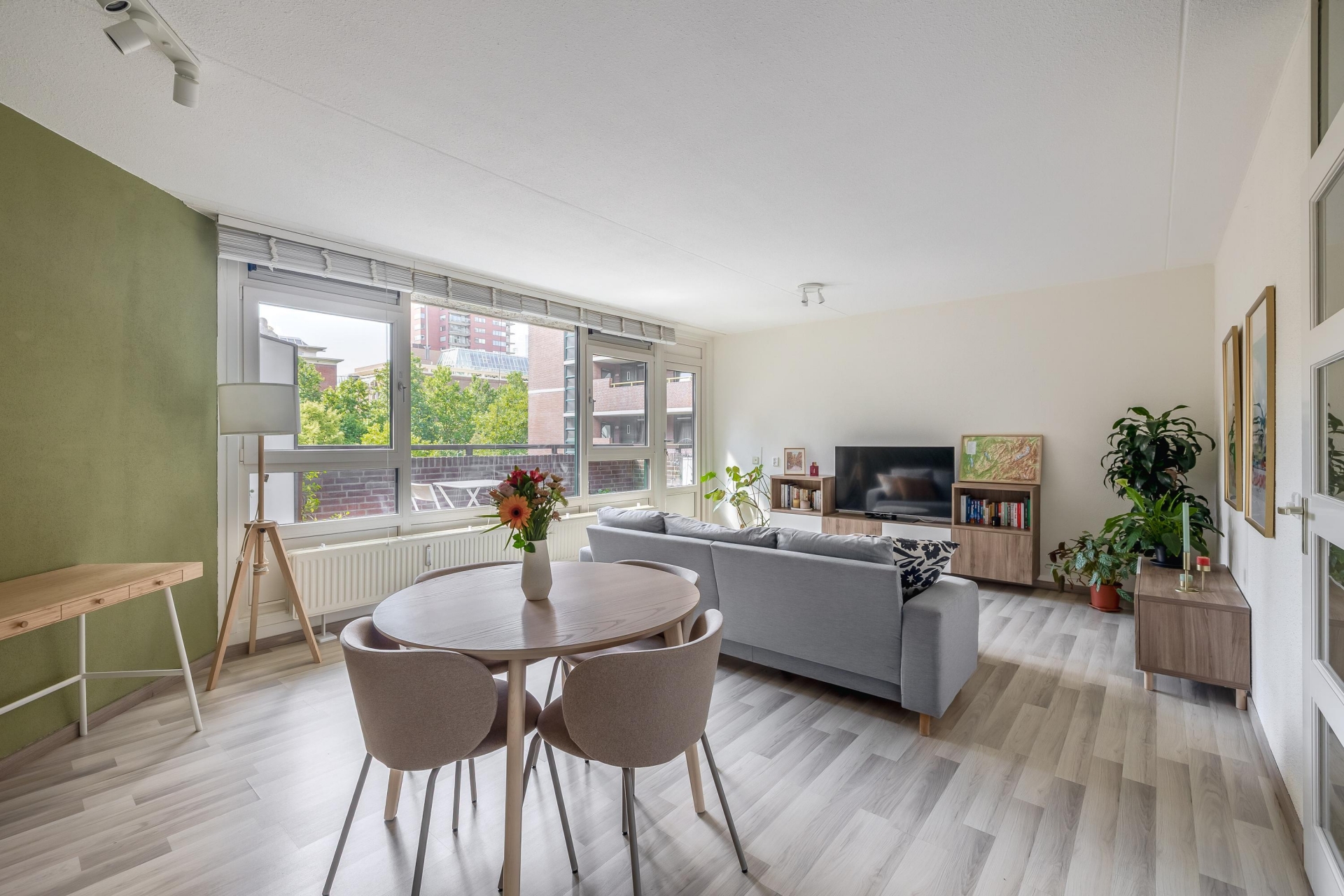 De ruime woonkamer heeft grote ramen waardoor er veel daglicht binnenkomt en een prettig gevoel van ruimte ontstaat. De open keuken is strak vormgegeven en voorzien van inbouwapparatuur, waardoor koken hier een plezier is. Door de open indeling blijft het contact met je gasten of huisgenoten altijd behouden. Vanuit de woonkamer stap je het zonnige balkon op – een heerlijke plek om te genieten van de middag- en avondzon met uitzicht over de stad.