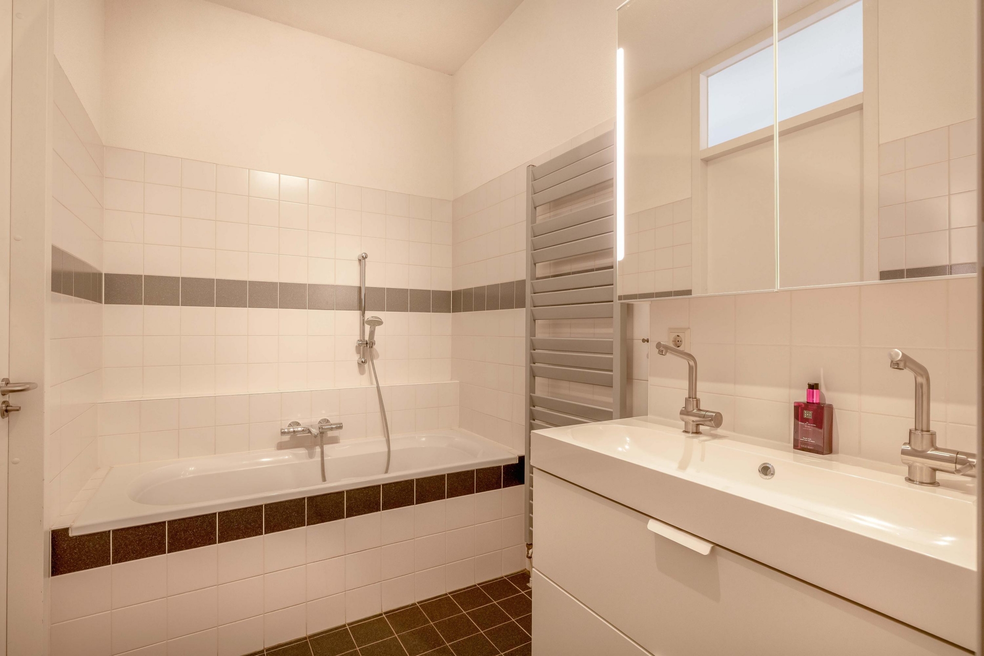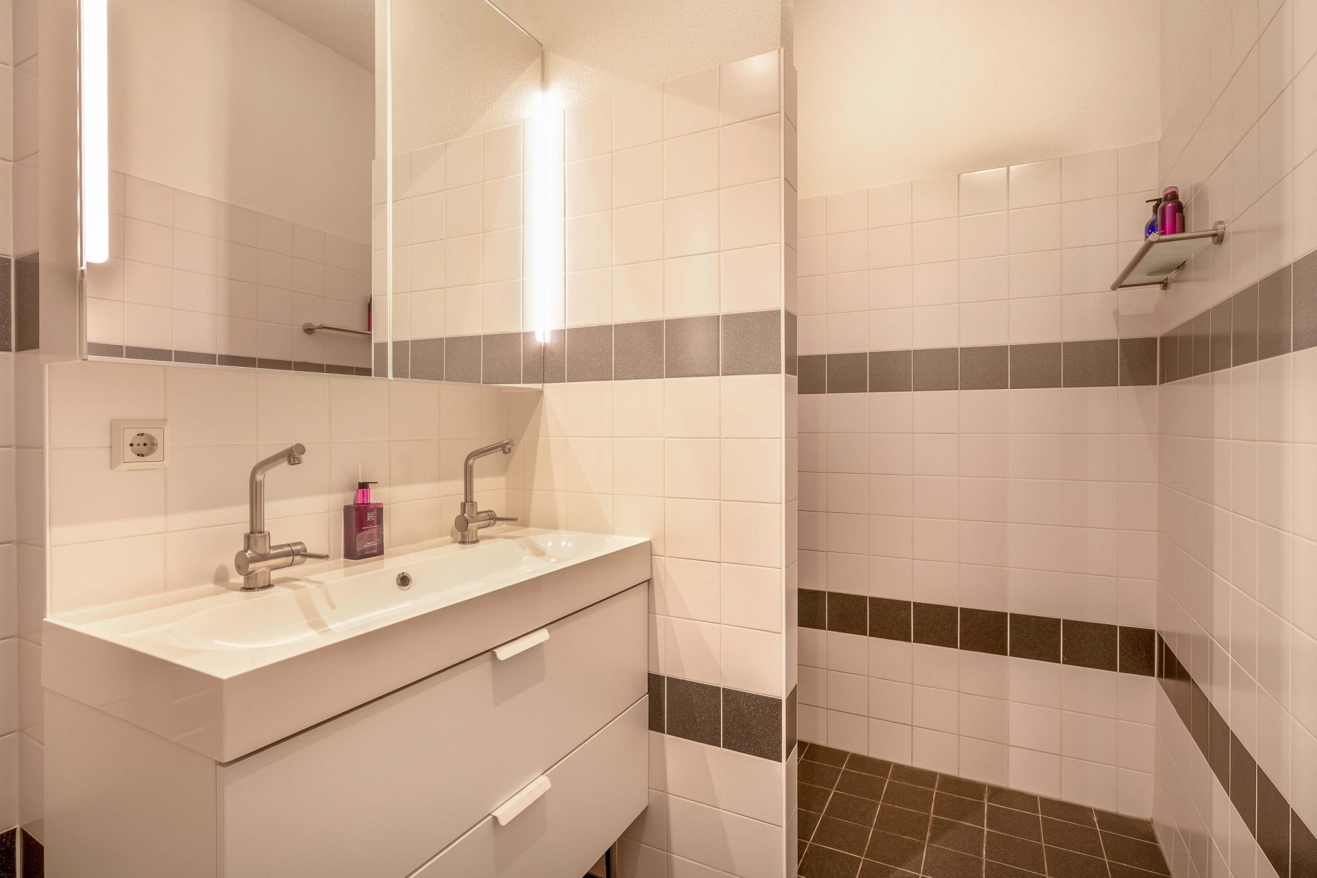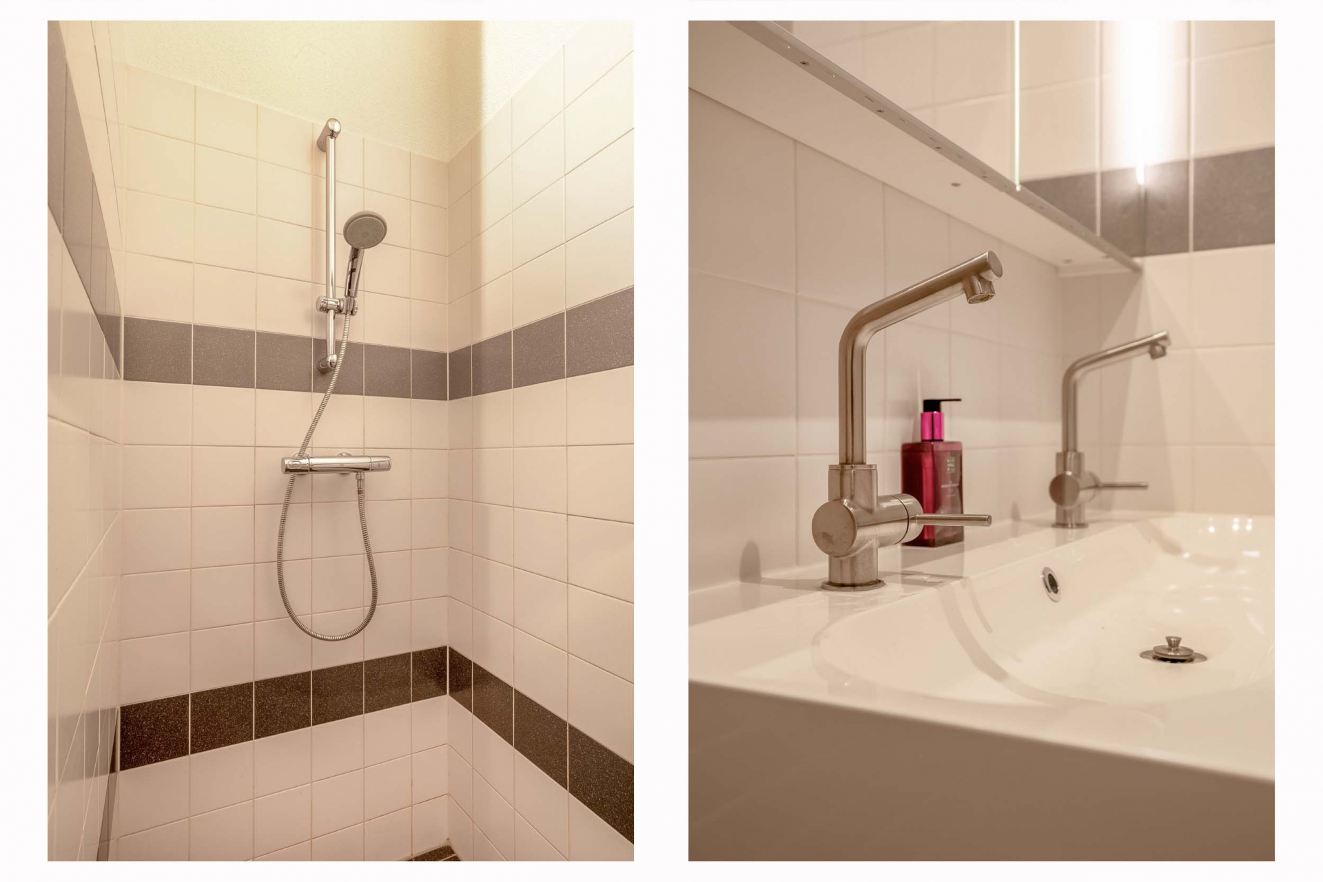 De badkamer op de eerste verdieping is keurig afgewerkt en voorzien van een inloopdouche, wastafelmeubel en ligbad. Een tweede separaat toilet is aanwezig. Op de zolderverdieping bevindt zich op de overloop voldoende ruimte voor wasmachine en droger en de opstelplaats van de CV-ketel.