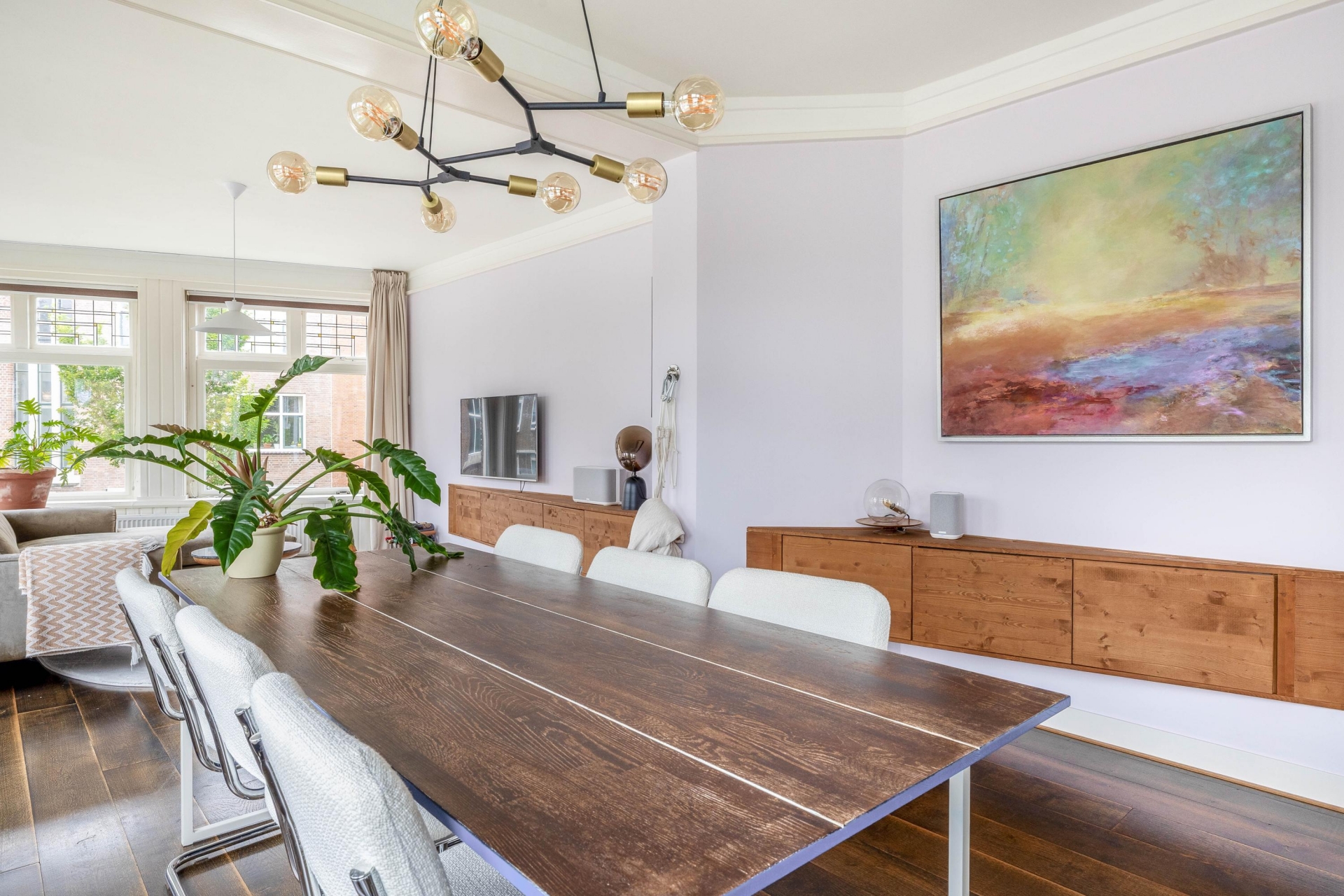 De eerste woonlaag voelt direct vertrouwd. De lichte woonkamer met houten vloer ademt sfeer en de markiezen houden het binnen in de zomer heerlijk koel. Vanuit de open keuken blijf je altijd onderdeel van het leven in huis. Dankzij het HR++ glas blijft de warmte in de winter uitstekend behouden, waardoor comfort en energiezuinig wonen moeiteloos samenkomen.
