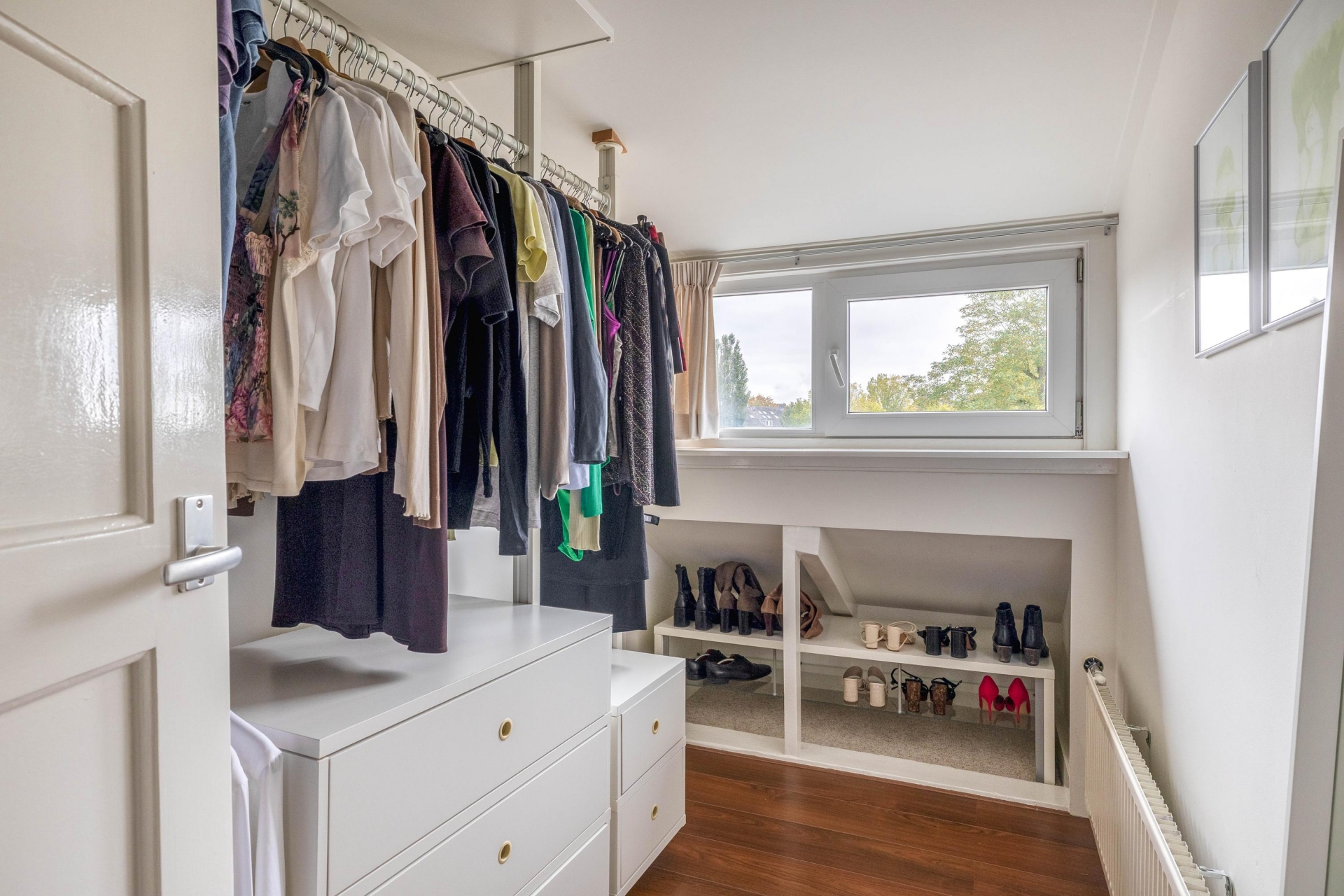 De vliering biedt nog meer opbergruimte, de aansluitingen voor de wasmachine en de ideale plek om was te drogen. Vanuit hier bereik je tevens de deur naar het dakterras.
