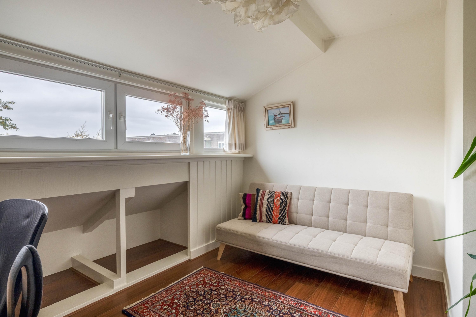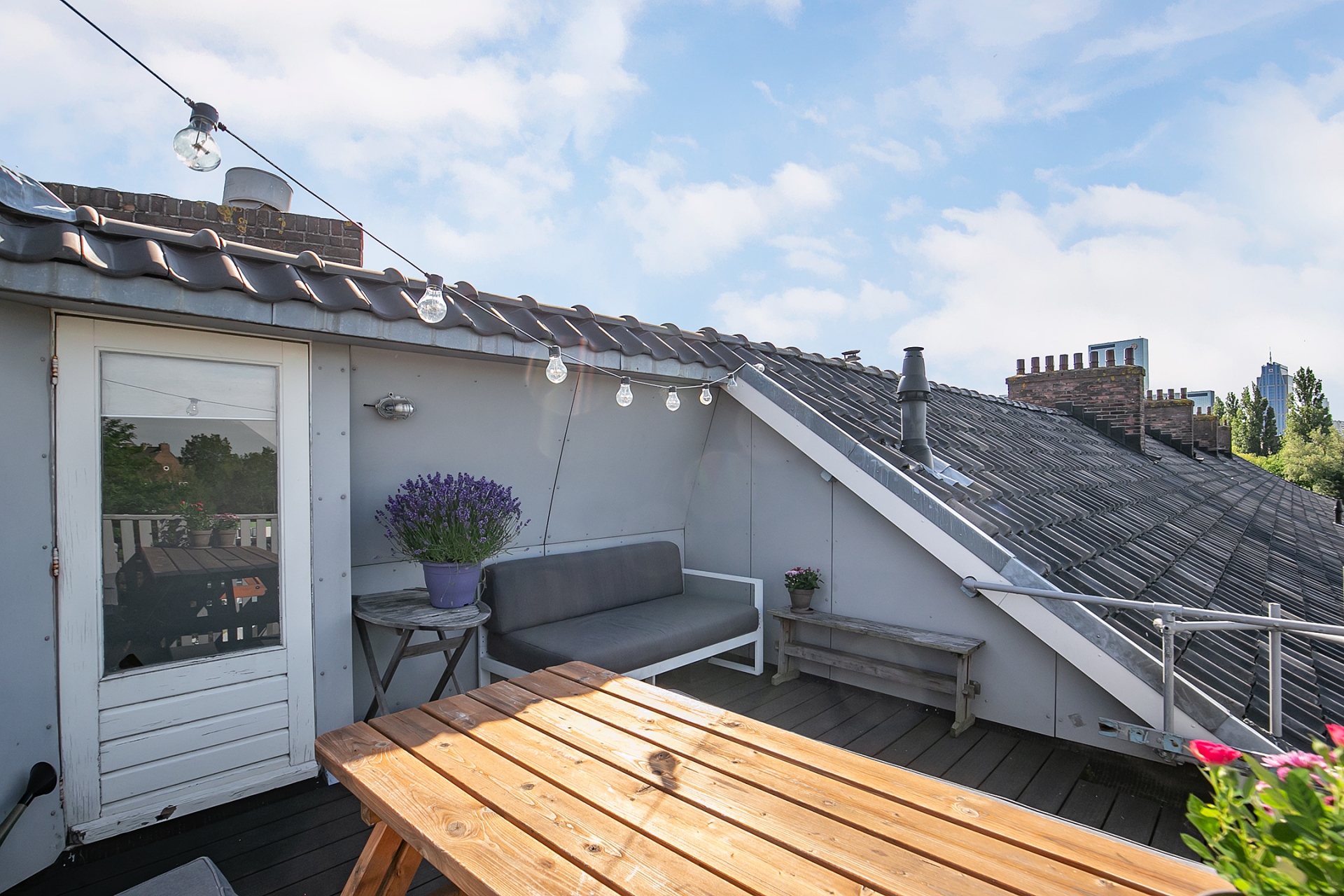 Zodra je boven komt, voel je het meteen: dit dakterras is uniek. Het is het enige terras in het pand en voelt daardoor als een privé-uitkijkpunt. Door de gunstige ligging op het westen en de beschutte positie kun je hier al vroeg in het jaar comfortabel buiten zitten. Van lange zomeravonden tot een snelle kop koffie in het voorjaarszonnetje - dit is een plek die echt elke dag plezier geeft.