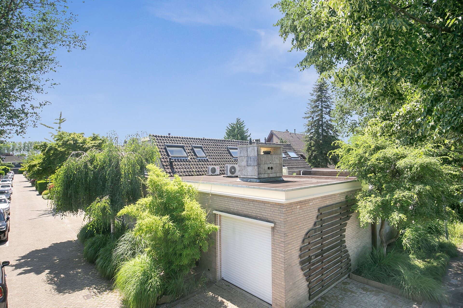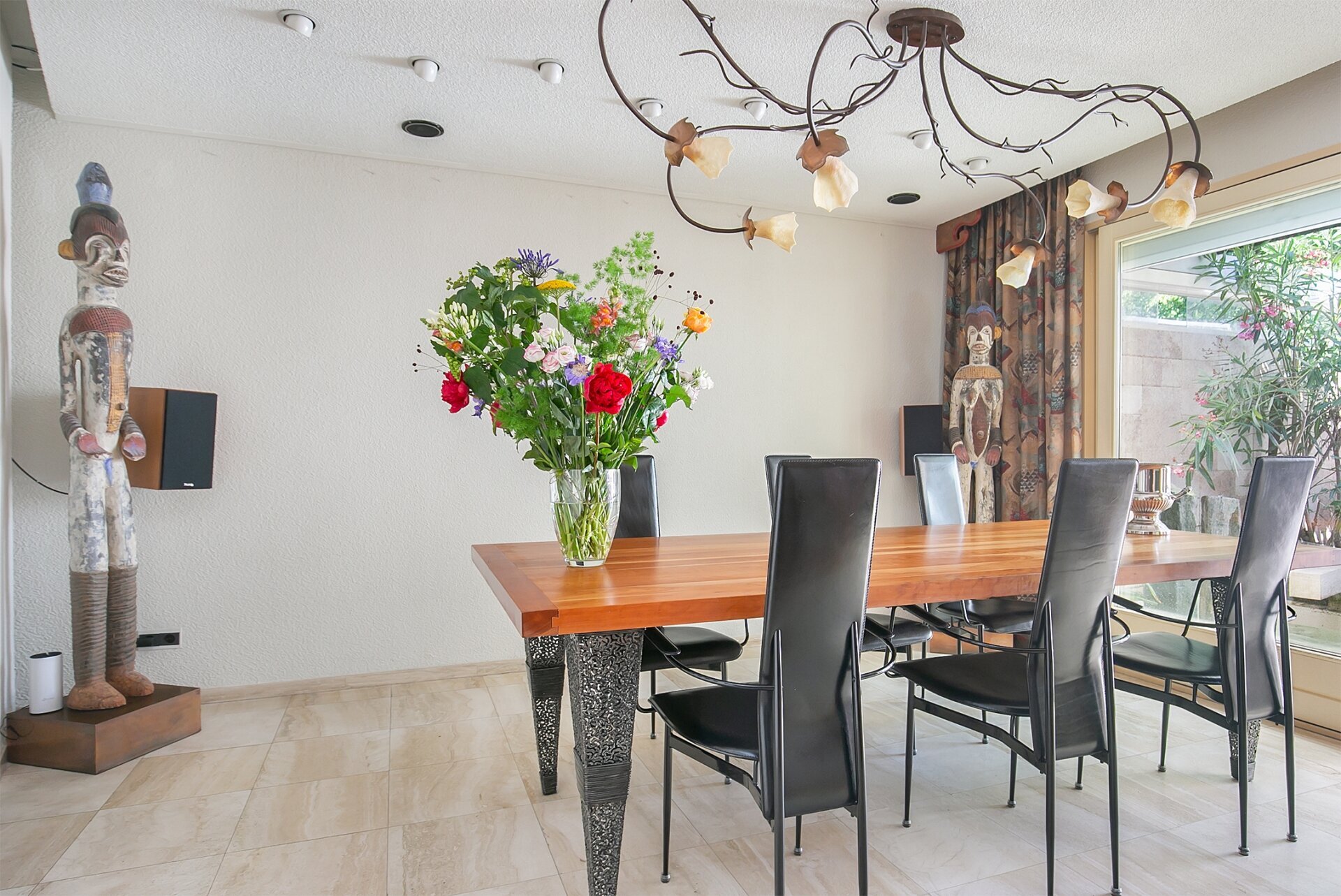 Vanuit de woonkamer en eetkamer is er goede verbinding met de subtropische tuin met veel kuipplanten. Met een zonnetje kun je ook heerlijk in de patio zitten. Zelfs met regen kunnen de patiodeuren open blijven en ervaar je de gezellig kletterende regen op het patiodak.