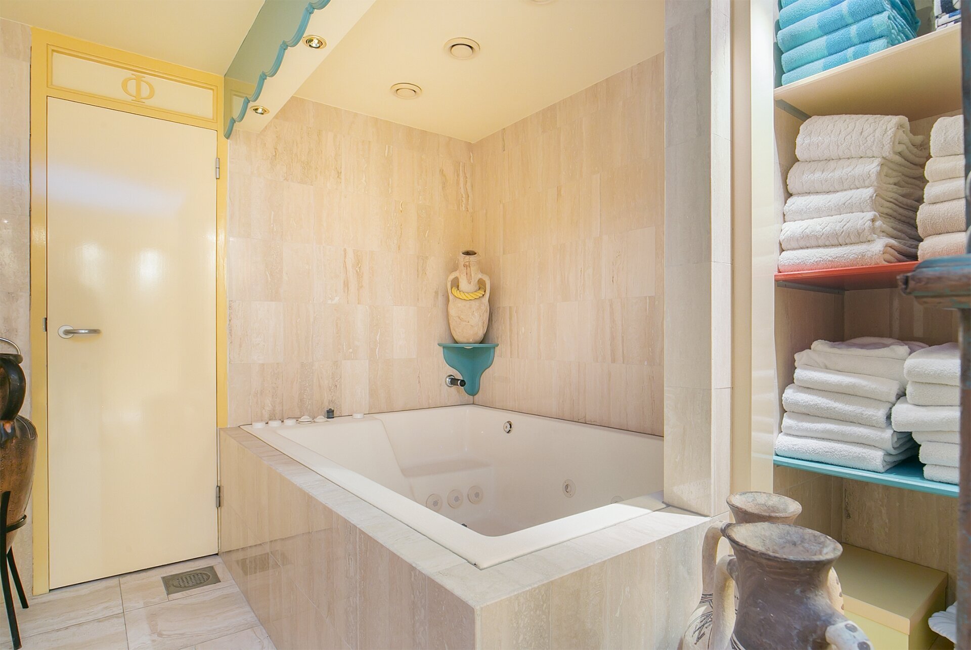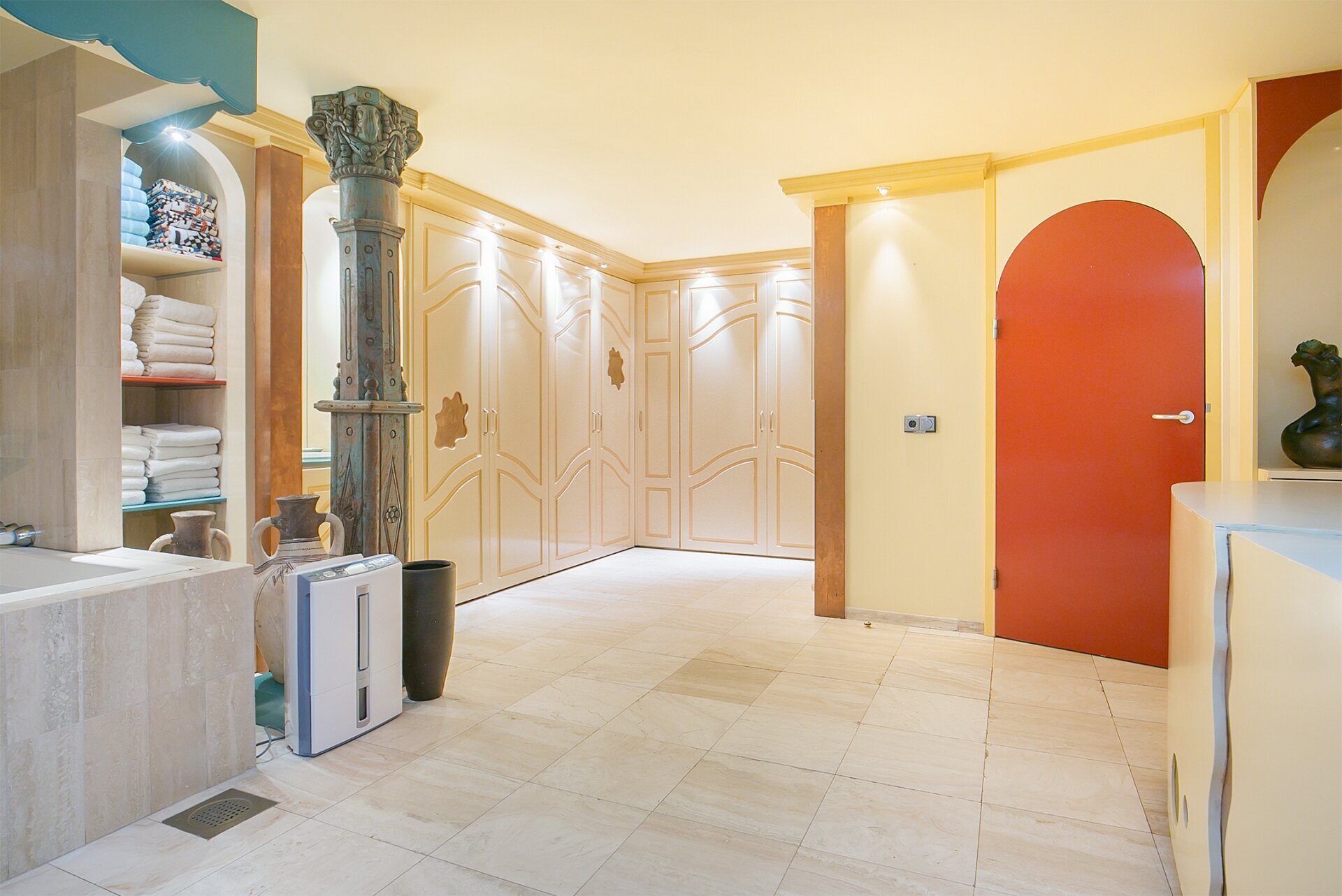 Uniek is ook de benedenverdieping. Naast een royale was- en strijkruimte en 2 persoons logeerbed is er een relax-/wellnessruimte met onder meer een tweepersoons bad, tweepersoonssauna, (2e) douche, wastafelmeubel, hoogtezon en tv-aansluiting. In een separate kamer bevindt zich de CV ketel (Remeha), waterafvoer en luchtcirculatie. De gehele benedenverdieping bevat zeer veel kastruimte, zodat u voldoende spullen netjes kunt wegbergen. Als uitsmijter treft u hier tevens een ‘walk in closet’ en royale geïsoleerde wijnkelder.