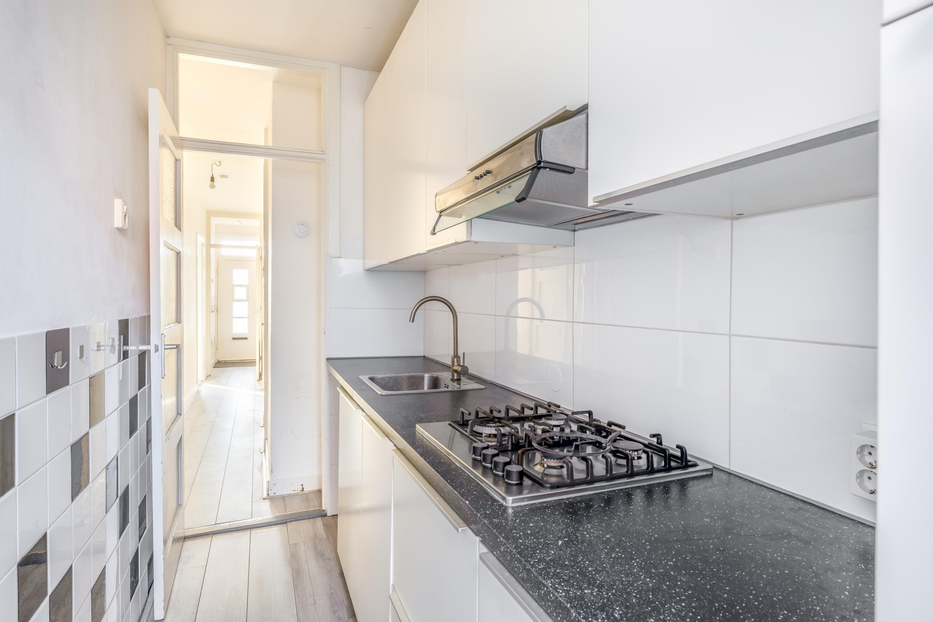 Bij binnenkomst valt direct de prettige indeling op. De woonkamer is ruim van opzet en dankzij de grote raampartijen geniet je hier van veel natuurlijk licht. Aan de achterzijde van de woning bevindt zich de keuken, met een deur naar de tuin. Een fijne en praktische plek om te koken, met direct contact met buiten. De keuken is voorzien van diverse inbouwapparatuur en biedt een goede basis om eventueel naar eigen smaak te moderniseren.