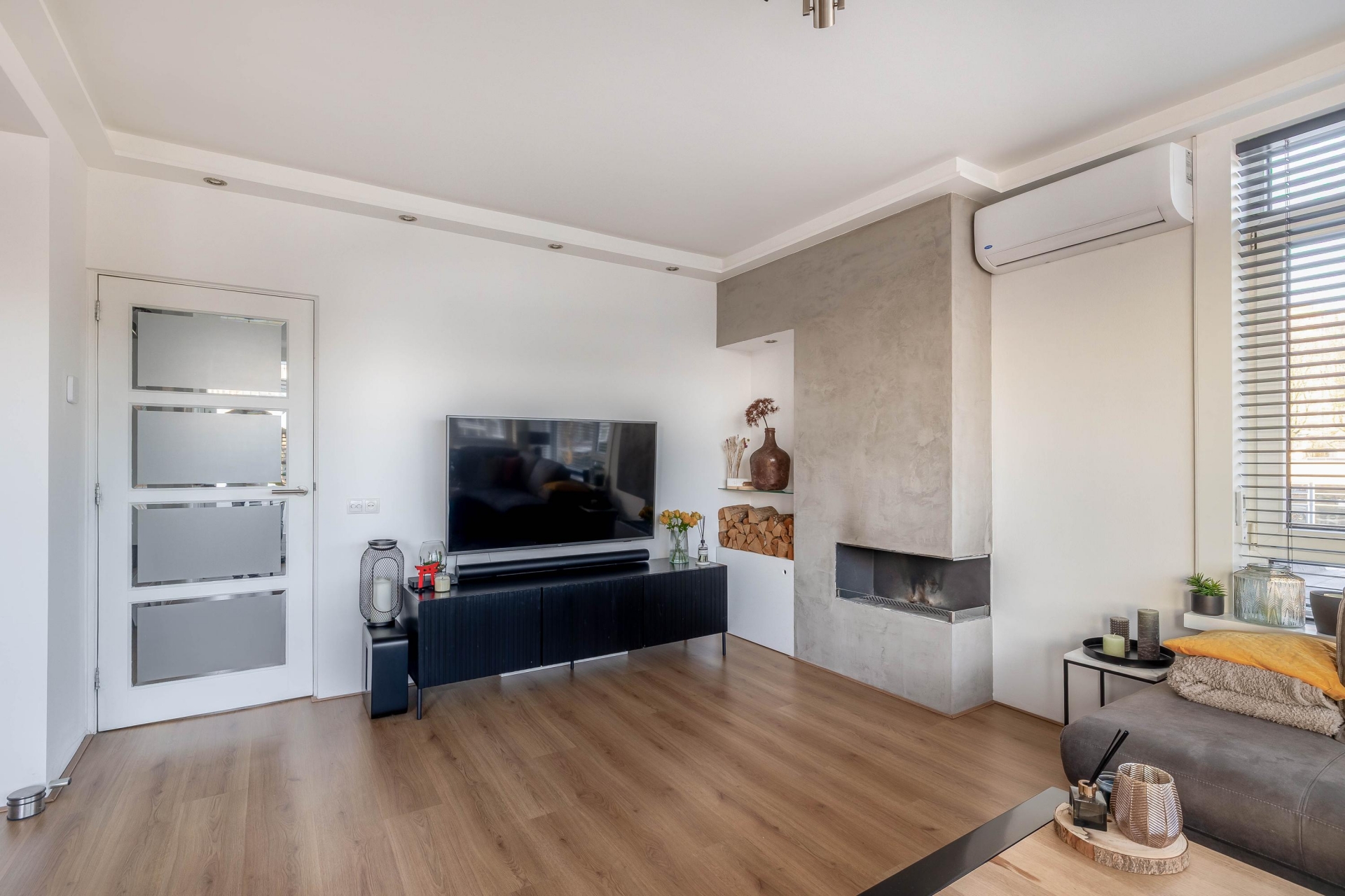 De woonkamer is een echte eyecatcher: licht, ruim en met een fijne sfeer dankzij de grote raampartijen, het hoekraam en de aanwezigheid van een sfeerhaard. De strakke afwerking en warme vloer maken het geheel af. Hier is het elke dag fijn thuiskomen. Of je nu lekker onderuit zakt op de bank, of vrienden uitnodigt voor een avondje samen. De twee airco's zorgen op warme dagen voor extra comfort en koelte.