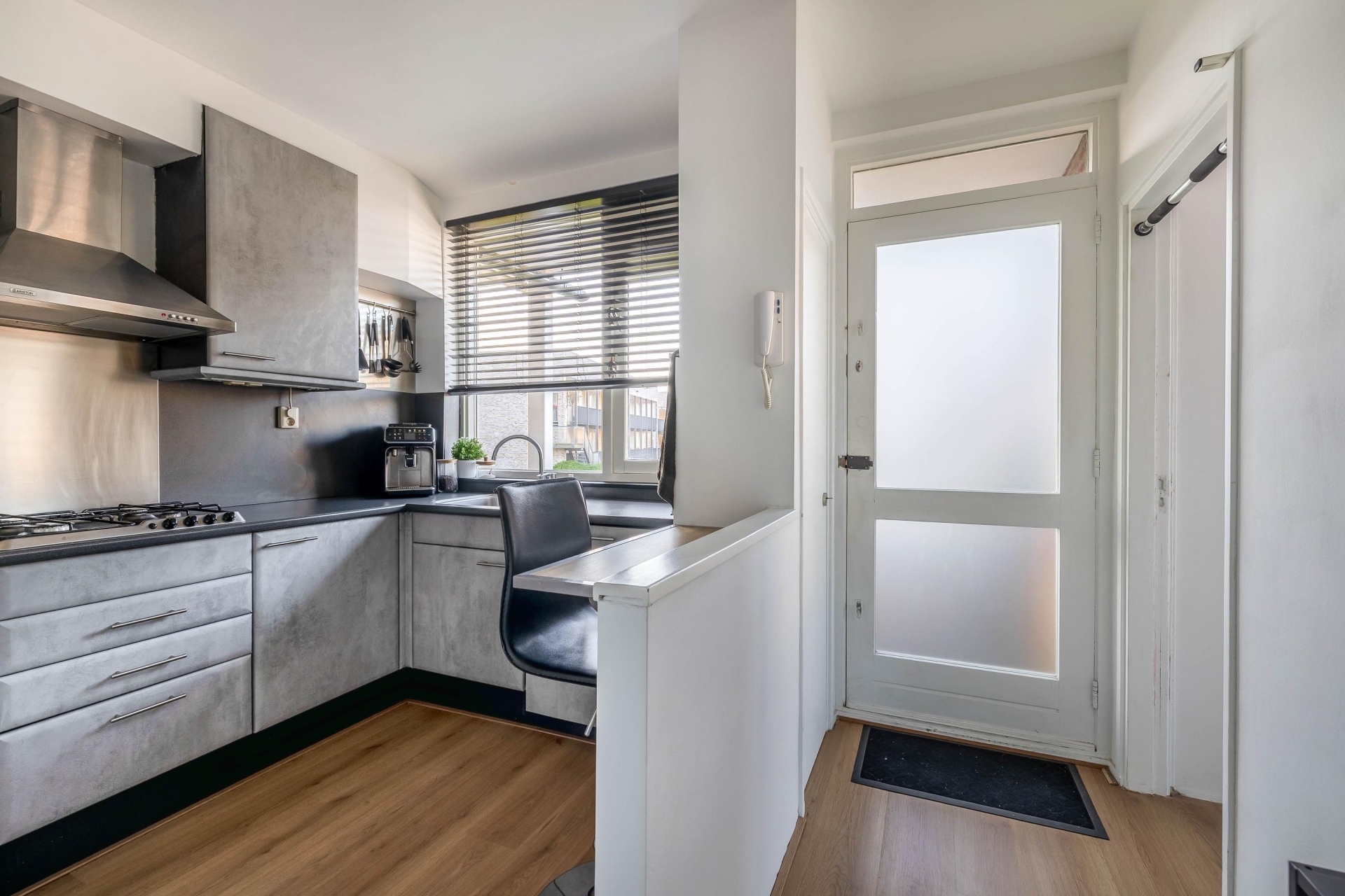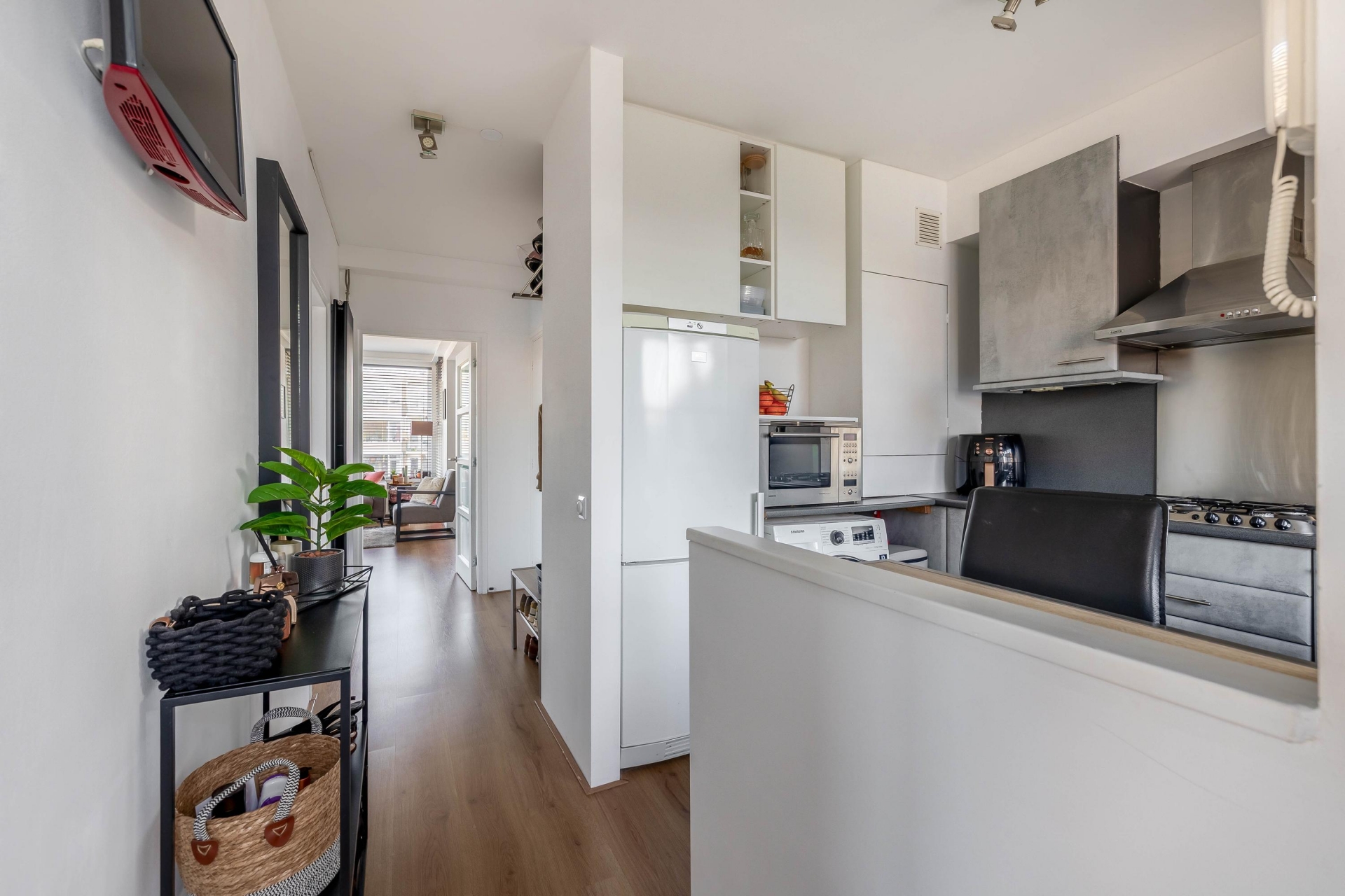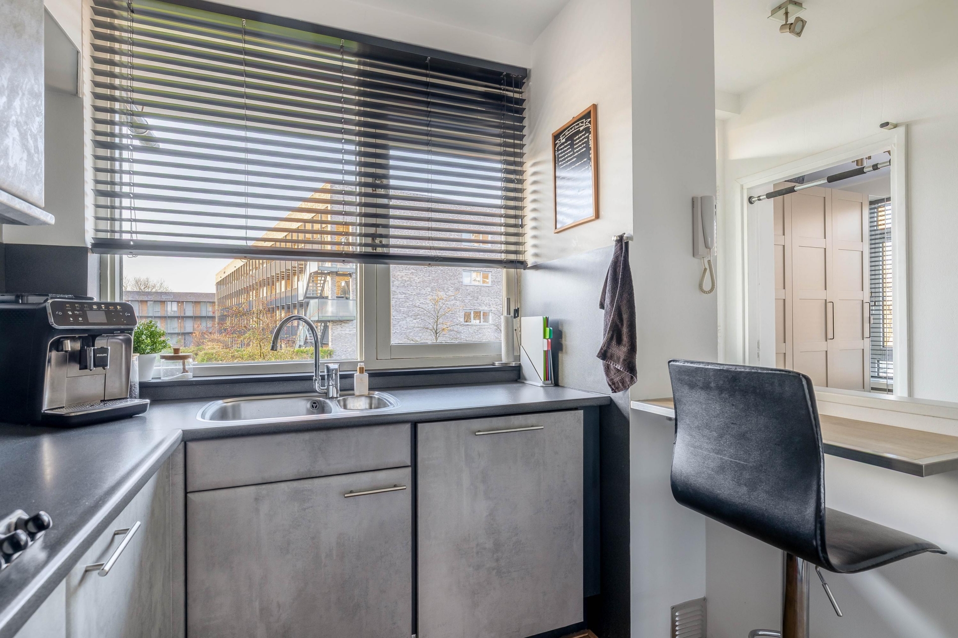 De keuken is netjes en praktisch ingericht met voldoende werkruimte en een moderne uitstraling. Dankzij het grote raam boven het aanrecht heb je hier veel daglicht, wat het een prettige plek maakt om te koken. De opstelling is functioneel, met voldoende kastruimte en apparatuur en sluit mooi aan op de rest van het appartement.
