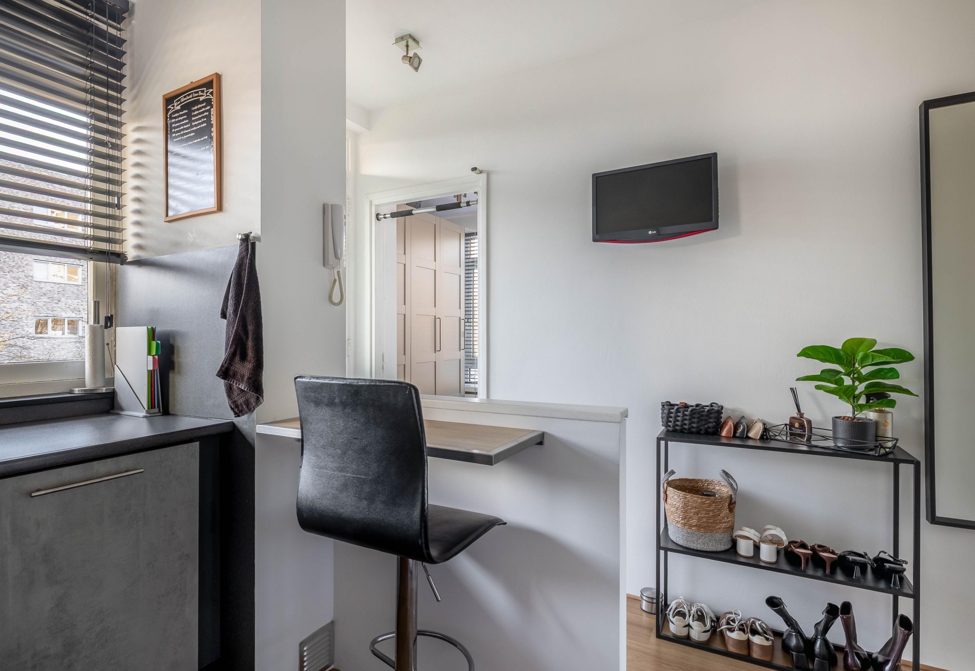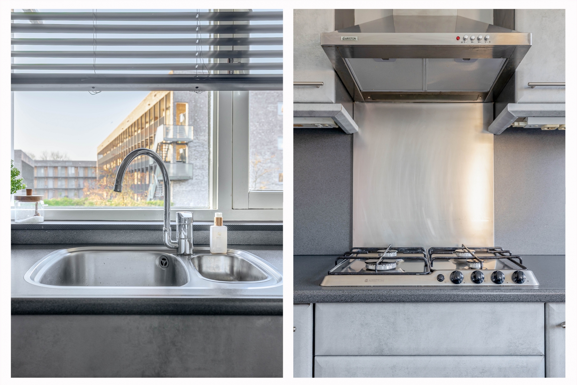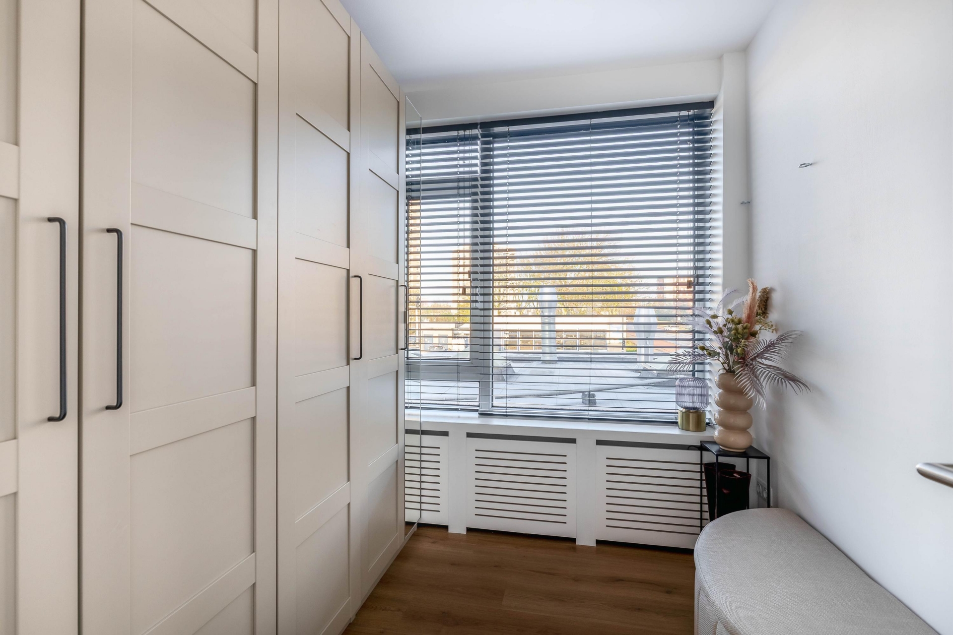 De keuken is netjes en praktisch ingericht met voldoende werkruimte en een moderne uitstraling. Dankzij het grote raam boven het aanrecht heb je hier veel daglicht, wat het een prettige plek maakt om te koken. De opstelling is functioneel, met voldoende kastruimte en apparatuur en sluit mooi aan op de rest van het appartement.