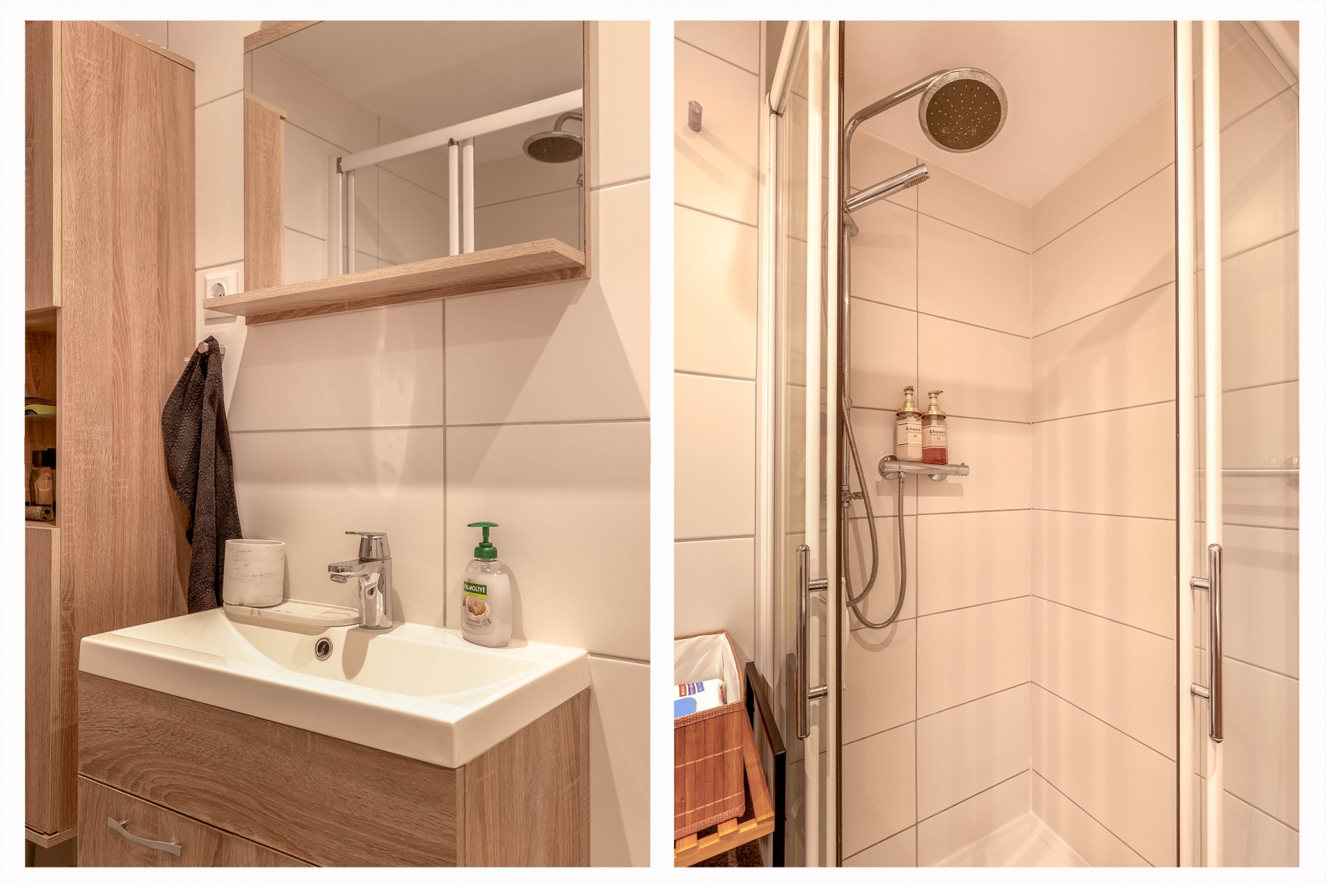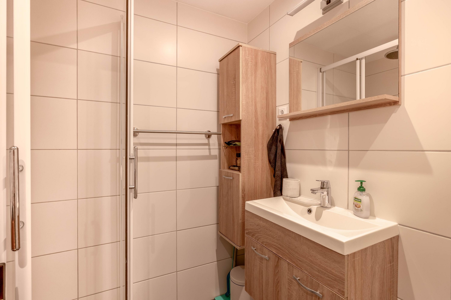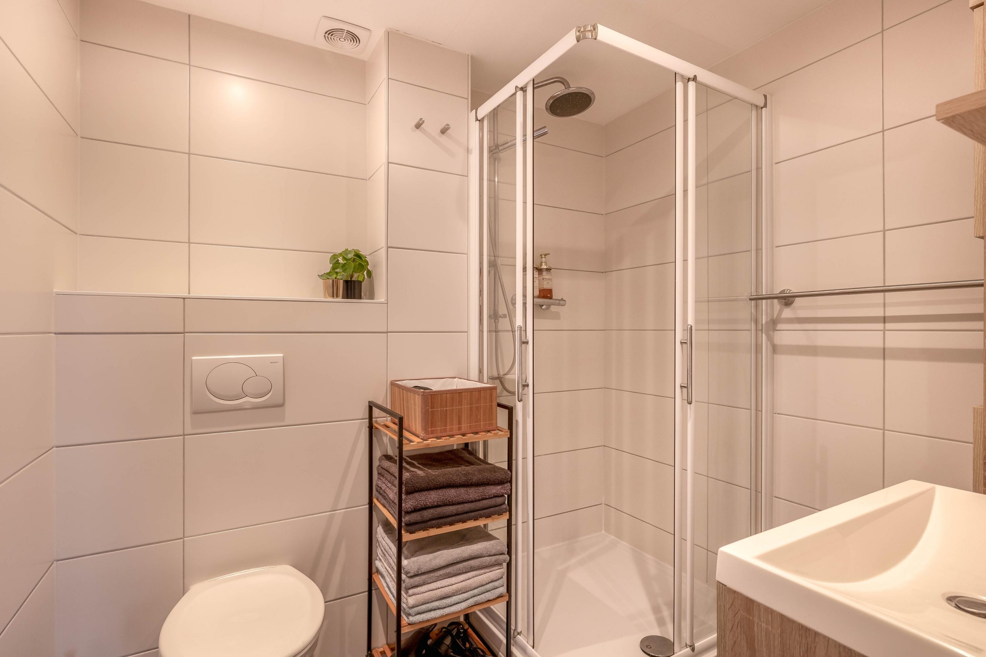 De badkamer is in 2017 vernieuwd en straalt rust en comfort uit. Strakke witte tegels, een moderne douchecabine en slim geplaatste opbergmogelijkheden maken dit een fijne plek om je dag te starten of juist ontspannen af te sluiten. Het toilet is netjes geïntegreerd in de badkamer.