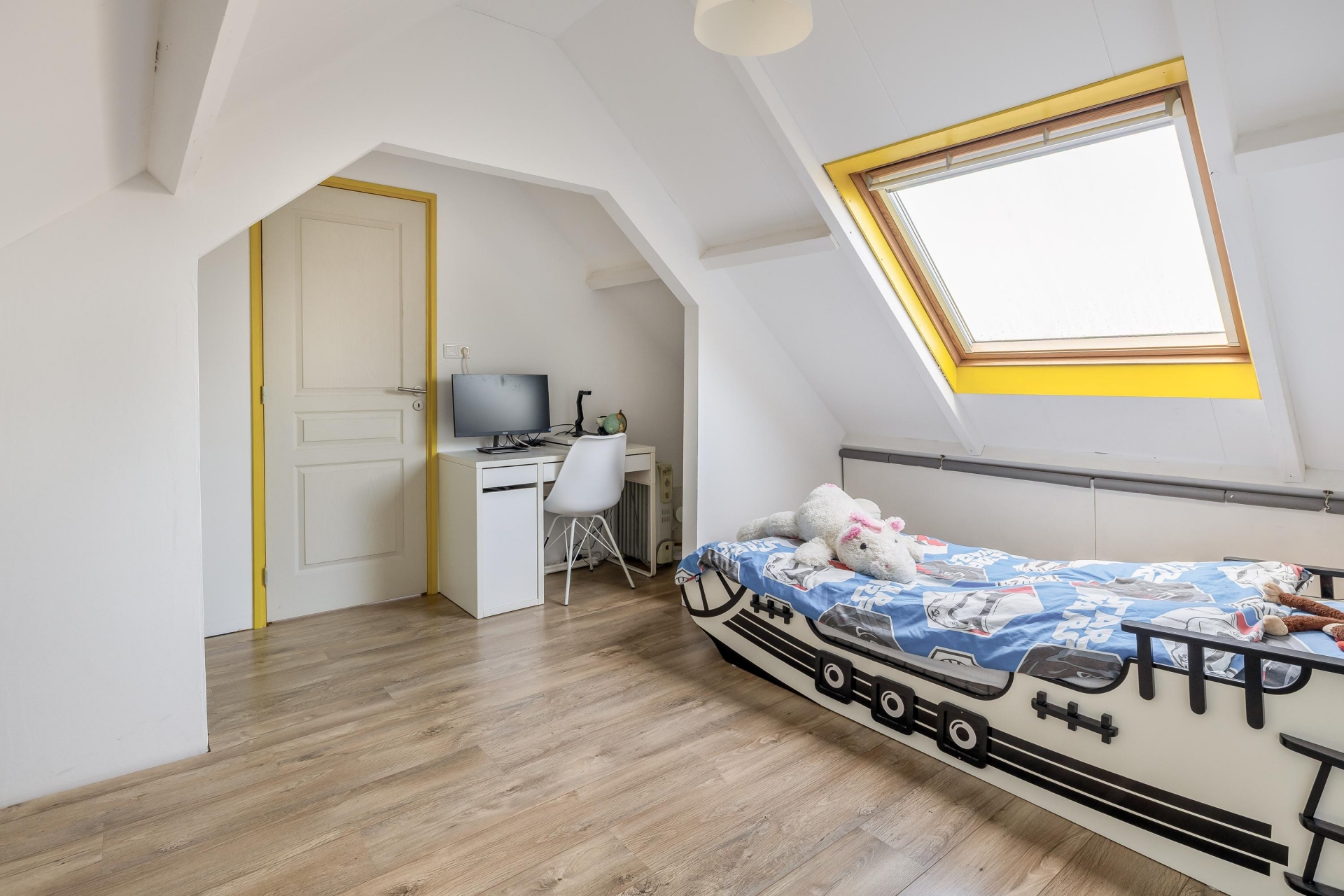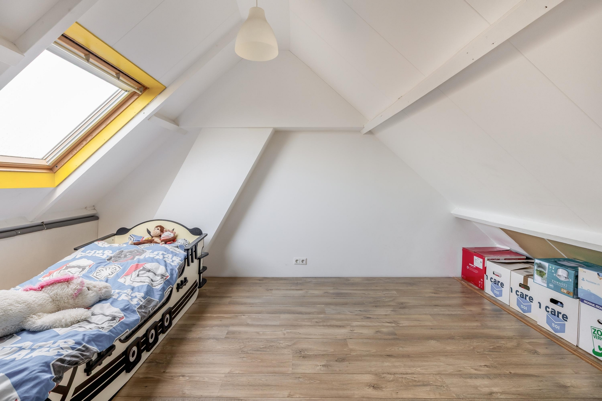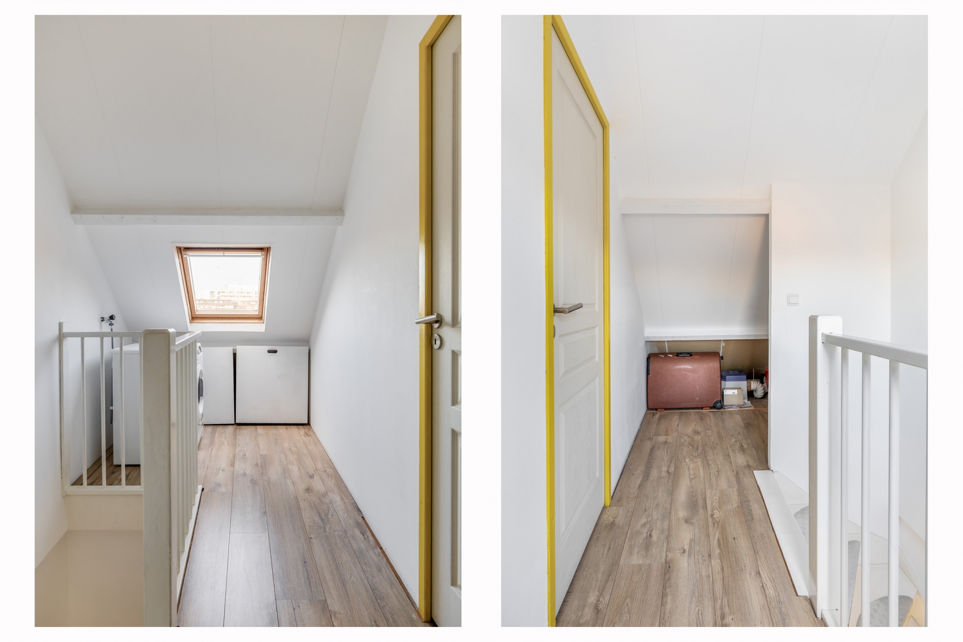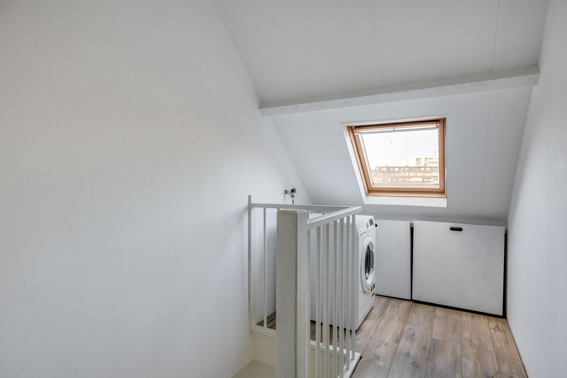 Een vaste trap brengt je naar de zolderverdieping. Deze verdieping is momenteel in gebruik als wasruimte én heeft nog een slaapkamer, die goed zou kunnen dienen als bijvoorbeeld een werkplek, logeerruimte of master bedroom.