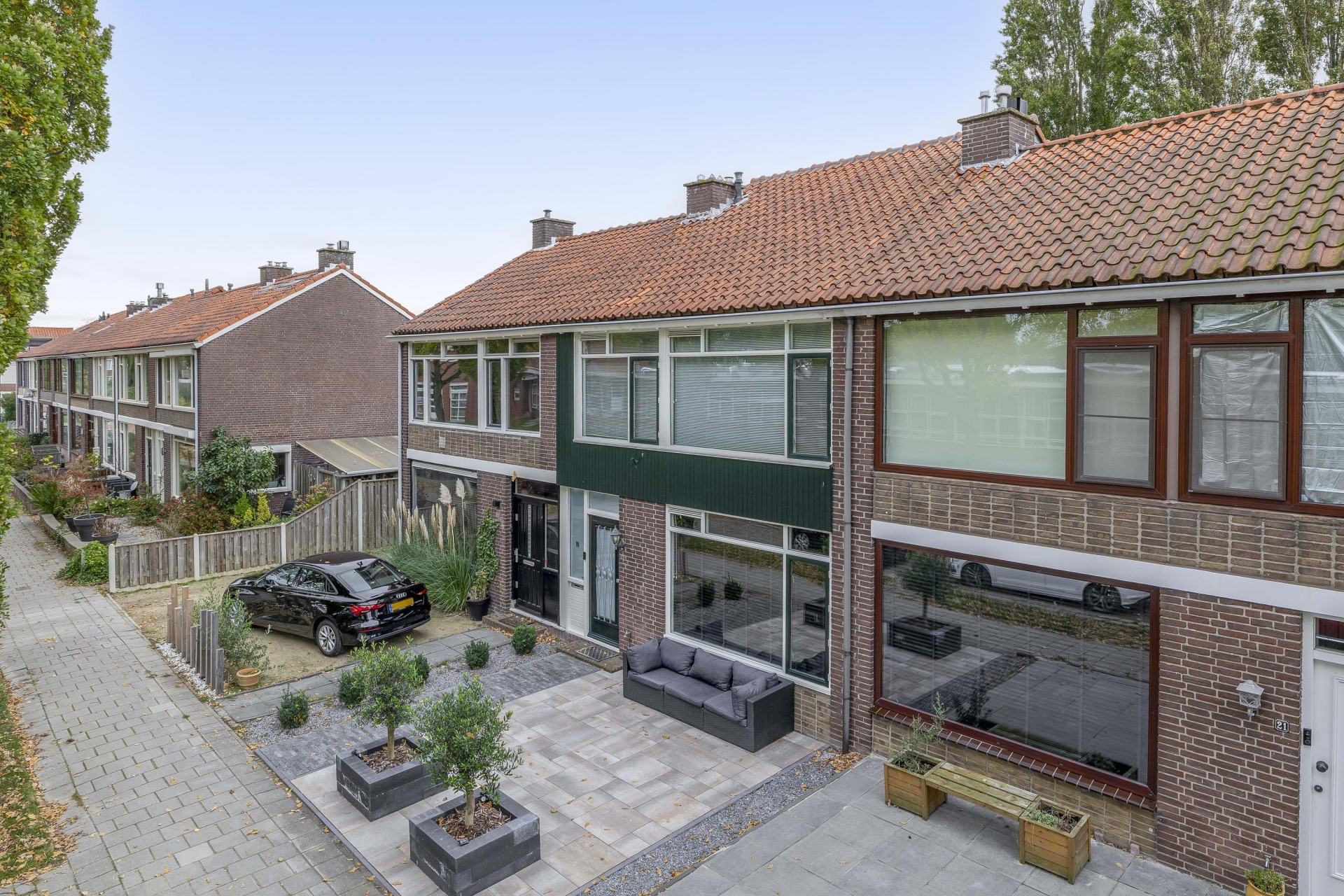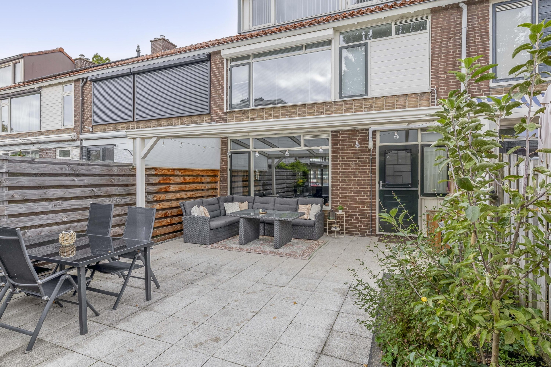 De voortuin is recent strak aangelegd en geeft de woning direct een verzorgde uitstraling. Achter het huis ligt een fijne achtertuin op het zuidoosten. De aangebouwde overkapping maakt dit tot een extra leefruimte in de warmere maanden – ideaal voor lange zomeravonden of een koffie in de ochtendzon.