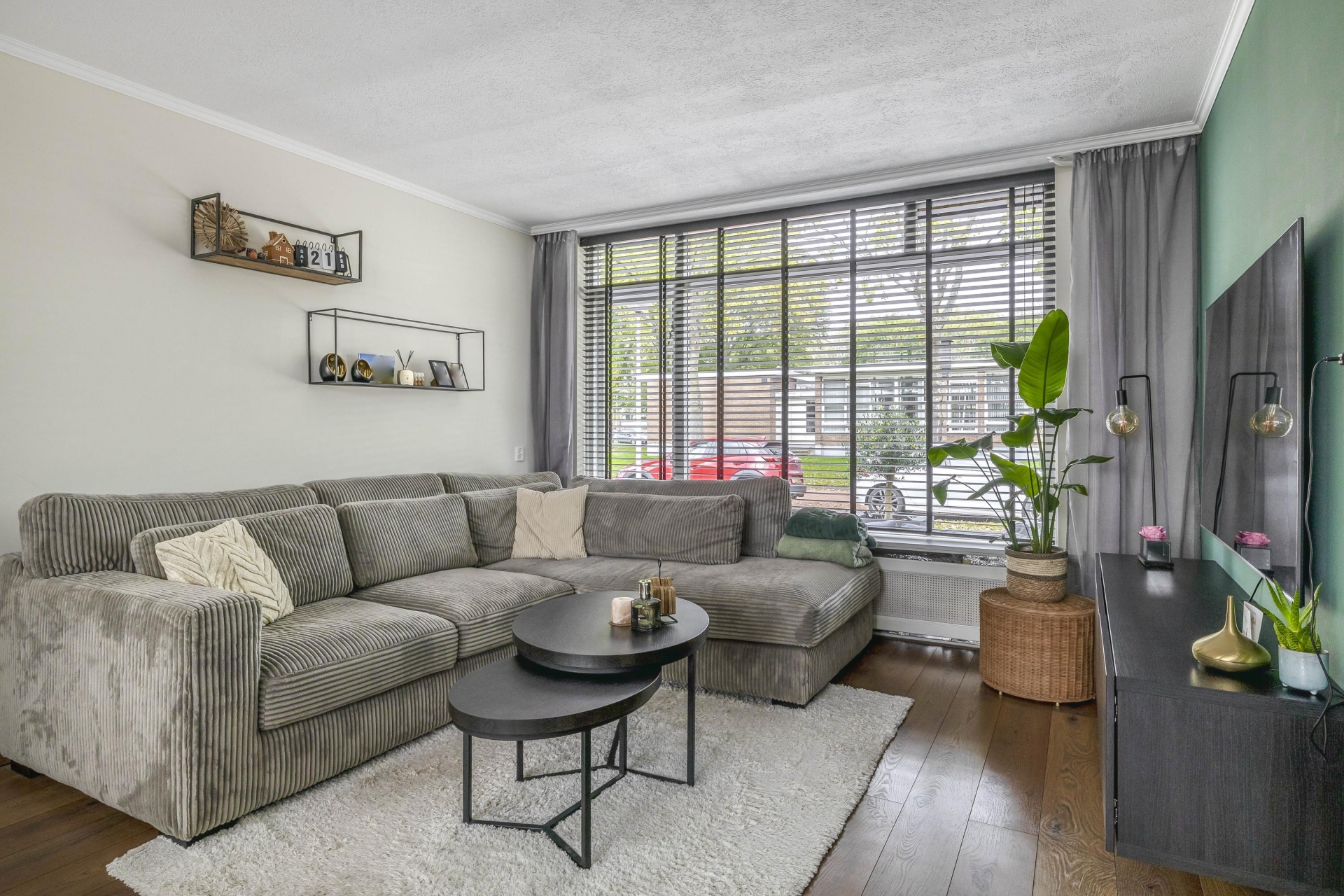 De begane grond is praktisch en sfeervol ingedeeld. De woonkamer met grote raampartij aan de voorzijde biedt een fijne lichtinval en een gezellige zithoek. De groene accentmuur zorgt voor een warme, moderne uitstraling en de afwerking is strak en eigentijds. De keuken aan de achterzijde is modern uitgevoerd en van alle gemakken voorzien, ideaal voor wie graag kookt. Via de keuken heb je direct toegang tot de achtertuin, waardoor binnen en buiten naadloos in elkaar overlopen.