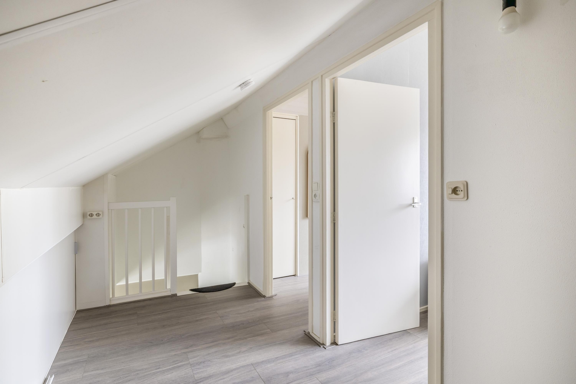 Op de eerste verdieping zijn twee slaapkamers te vinden: een ruime hoofdslaapkamer aan de achterzijde, een sfeervolle kinderkamer aan de voorzijde. Alle kamers zijn netjes afgewerkt met laminaatvloeren en neutrale tinten.