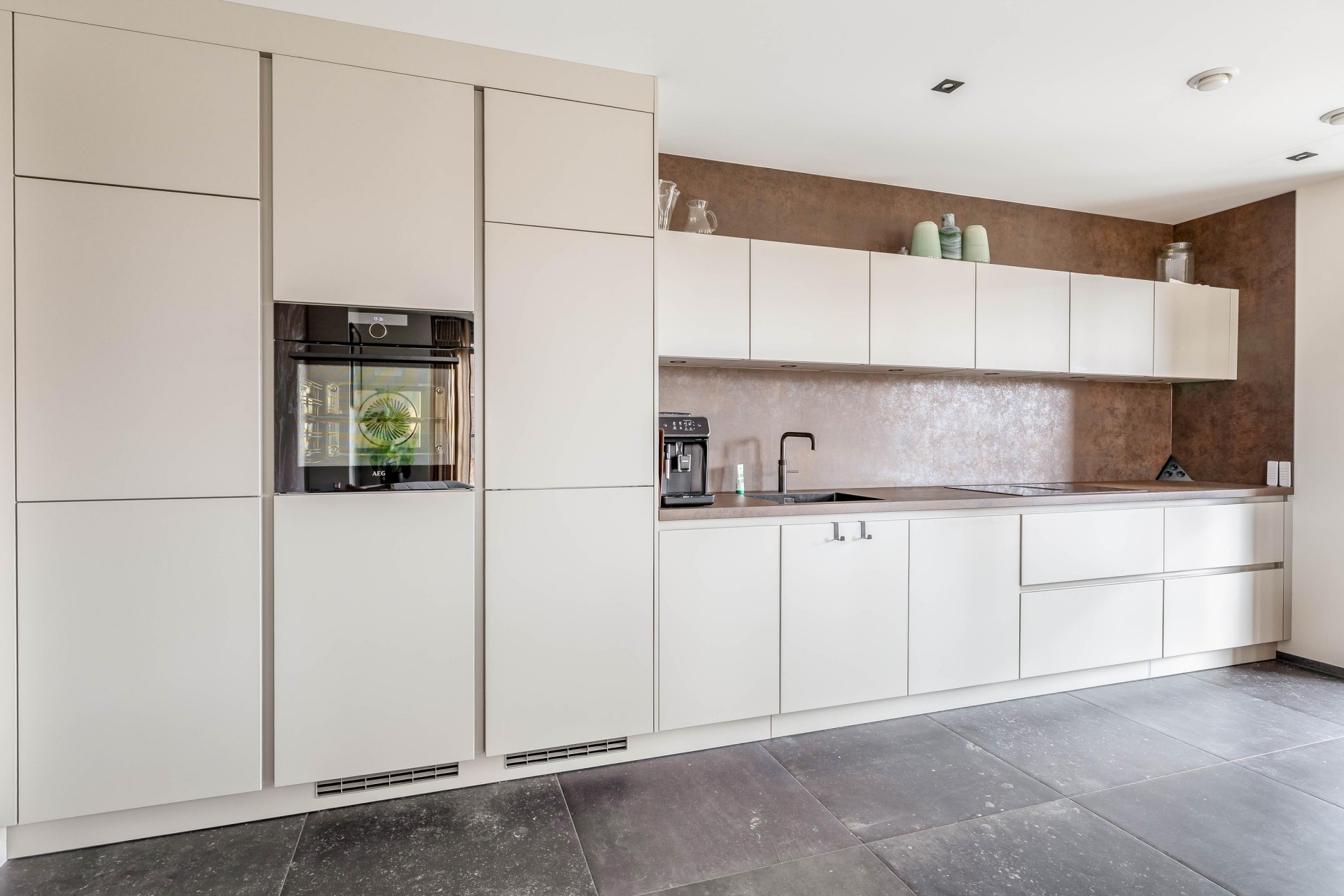De open keuken is modern, greeploos en uitgevoerd in een lichte kleurstelling met een warm accent in de achterwand. Uiteraard voorzien van alle benodigde inbouwapparatuur uit 2024 en een Quooker. Alles is strak weggewerkt, waardoor het één rustig geheel vormt met de woonkamer. Hier kook je met plezier!