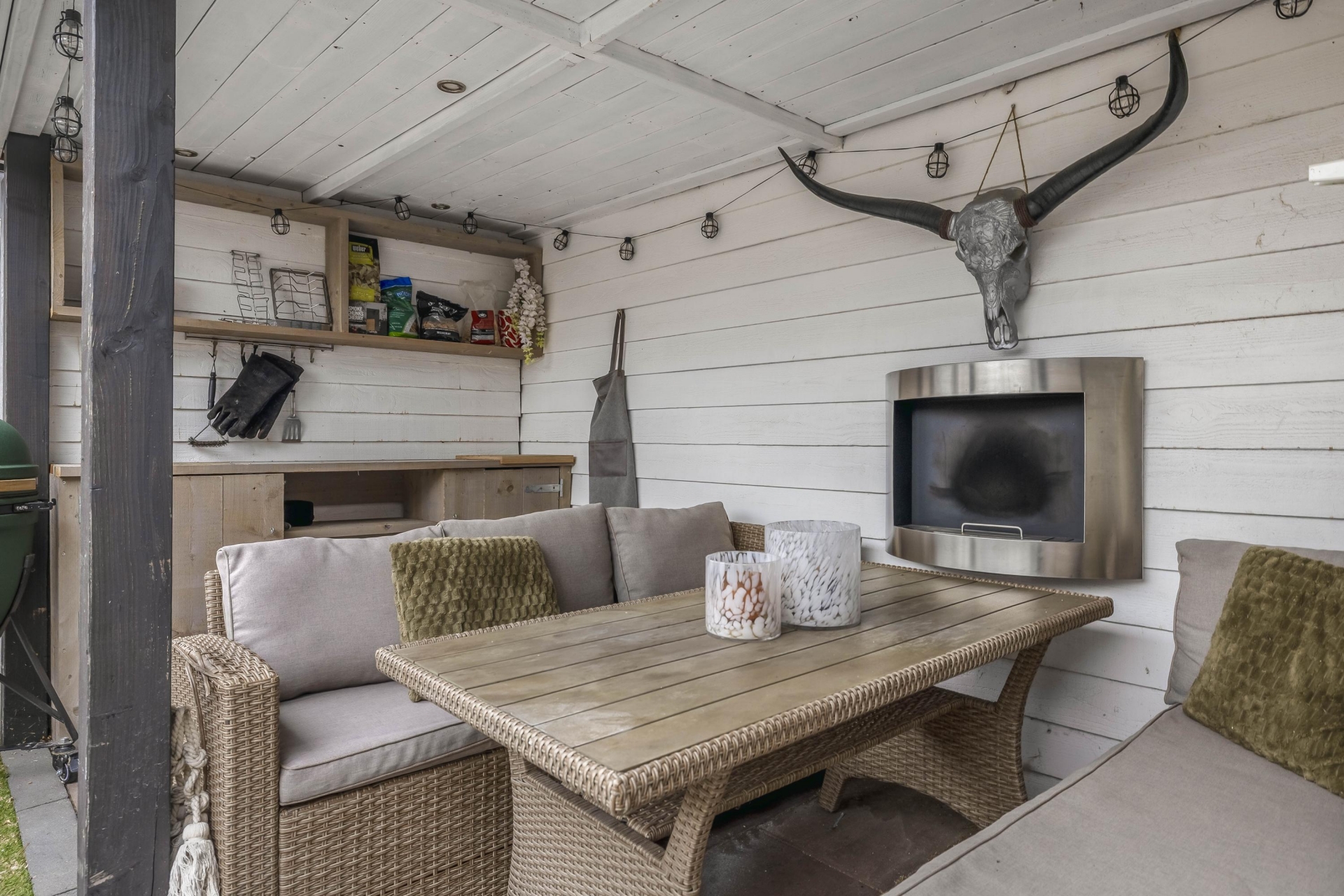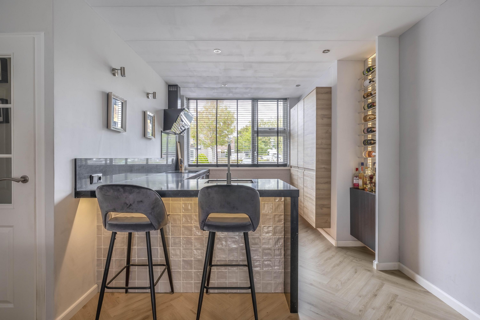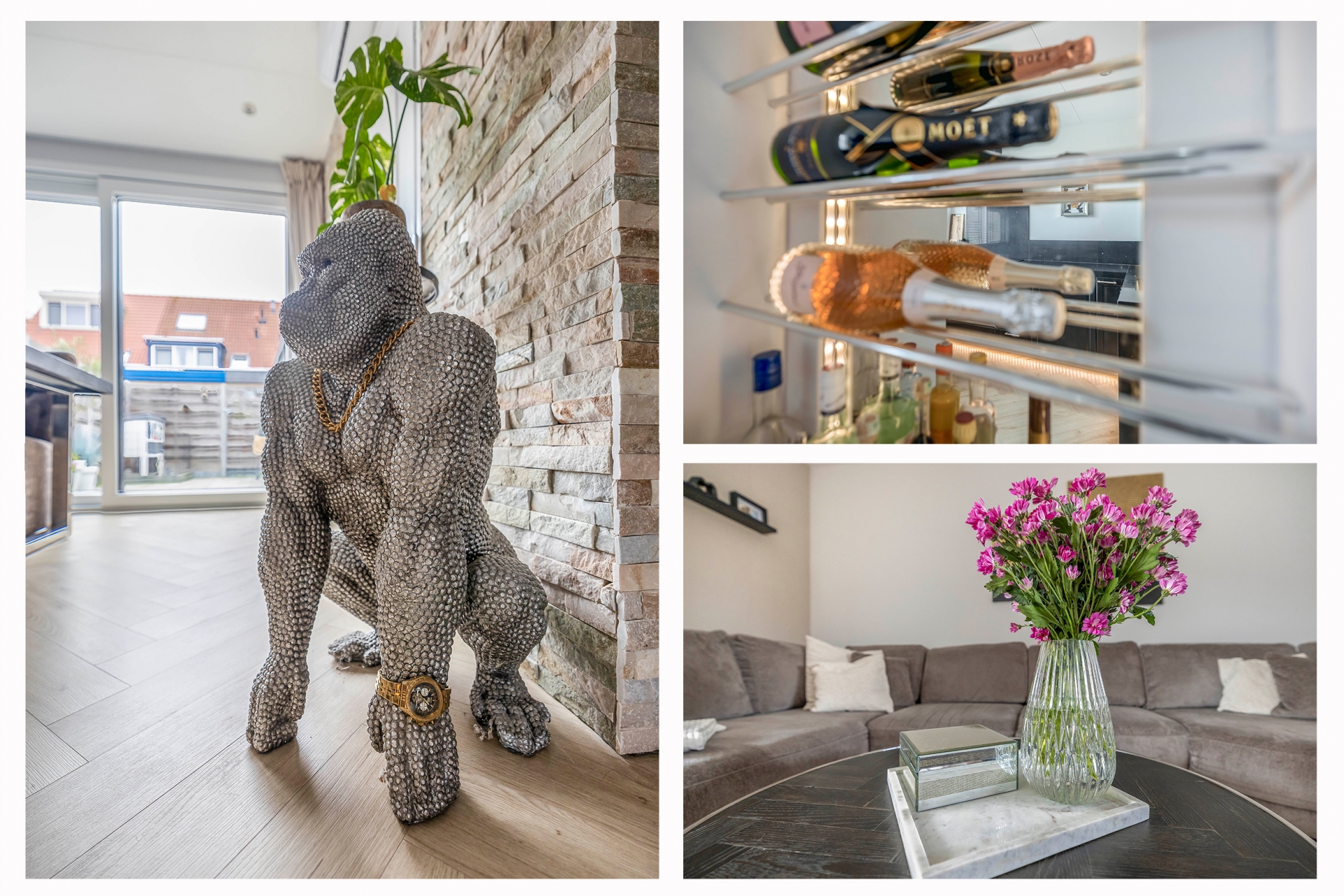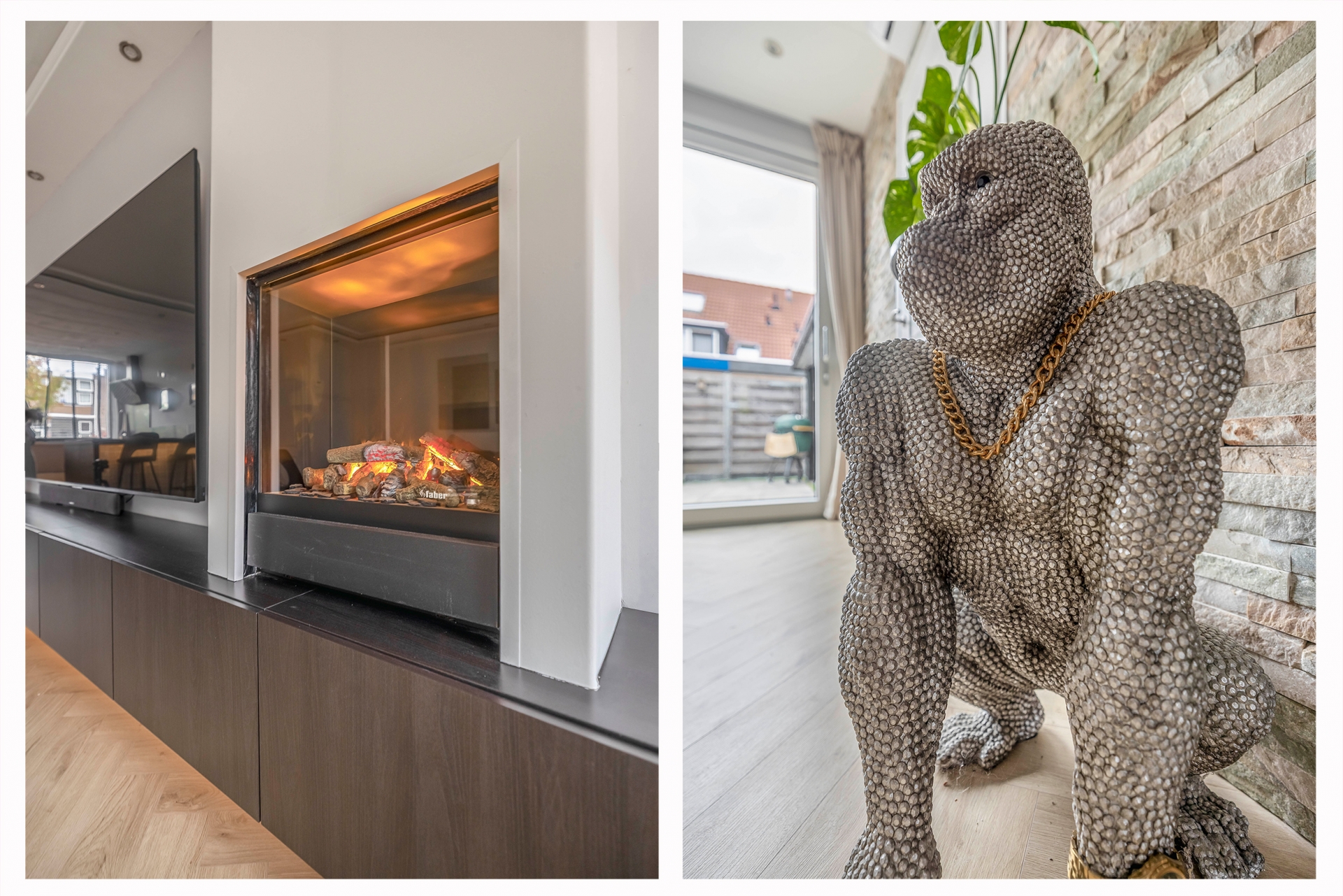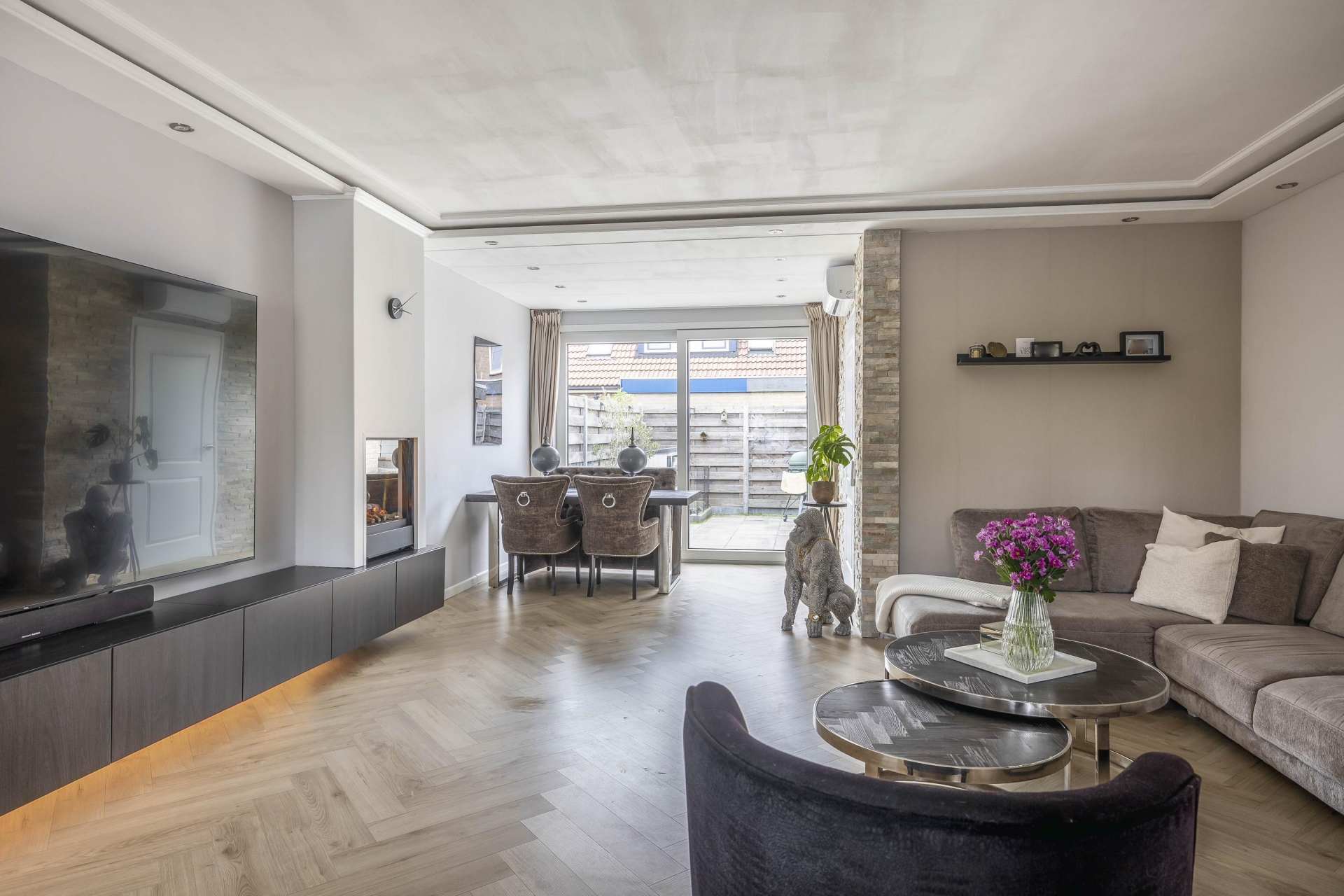 Entree van de woning via de voortuin met parkeerplaats; hal met garderobekast, toiletruimte met closet en fonteintje, meterkast; sfeervolle uitgebouwde woonkamer met sfeerhaard, interne berging en doorgang naar de zonnige achtertuin middels een schuifpui. Aan de voorzijde ligt de moderne halfopen keuken in L-opstelling voorzien van diverse inbouwapparatuur waaronder een oven, vaatwasser, inductie kookplaat, vriezer en afzuigkap. De begane grond is voorzien van airconditioning en een nette vloerafwerking in visgraat motief.