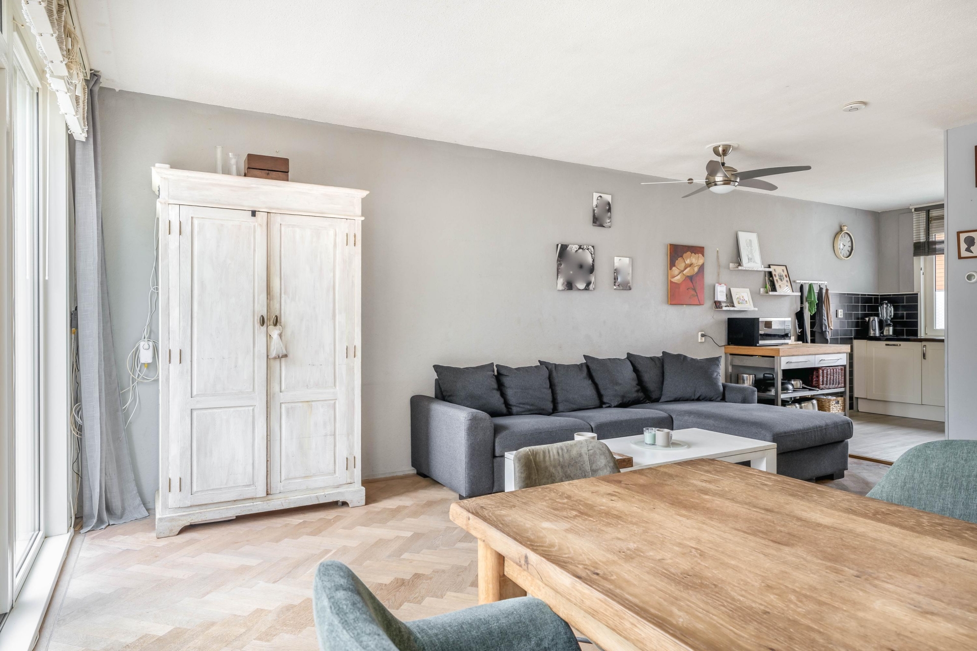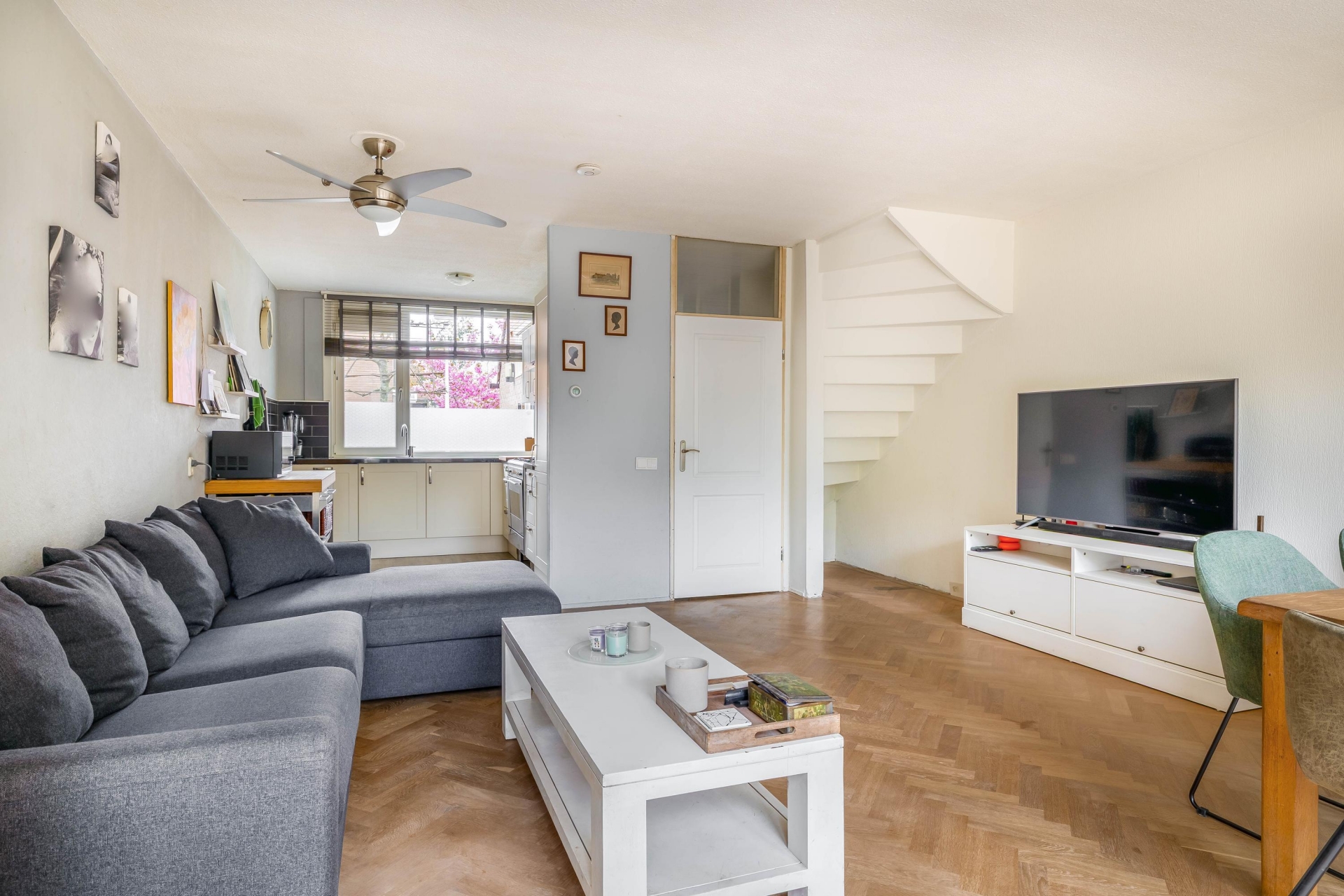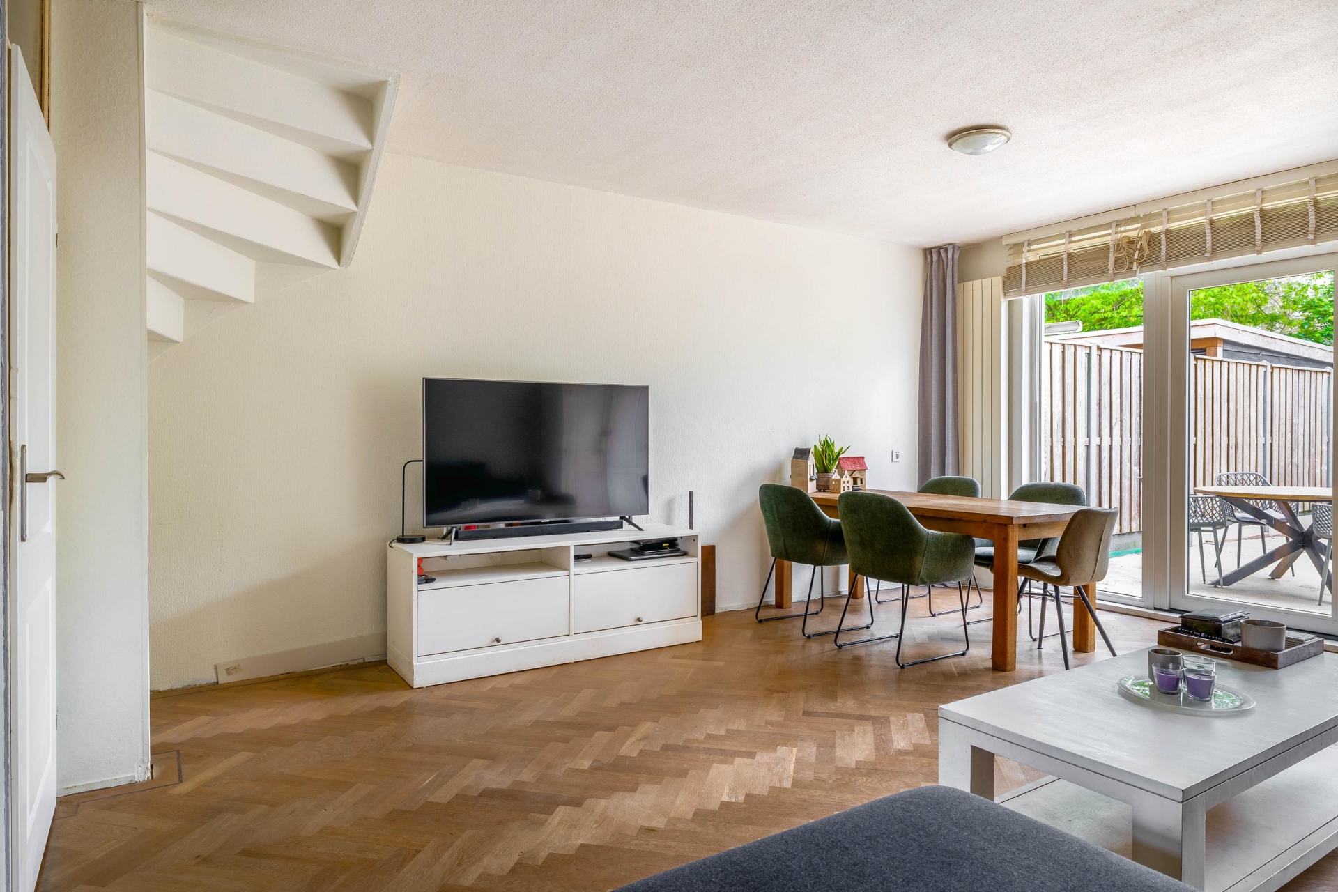 Wat direct opvalt bij dit huis is de fijne breedte en de hoeveelheid licht. De woonkamer aan de achterzijde is ruim opgezet en biedt met circa 28 m² alle ruimte voor een comfortabele zithoek en een grote eettafel. Dankzij de brede pui naar de tuin valt het daglicht hier rijkelijk naar binnen, wat zorgt voor een prettige en open sfeer.
