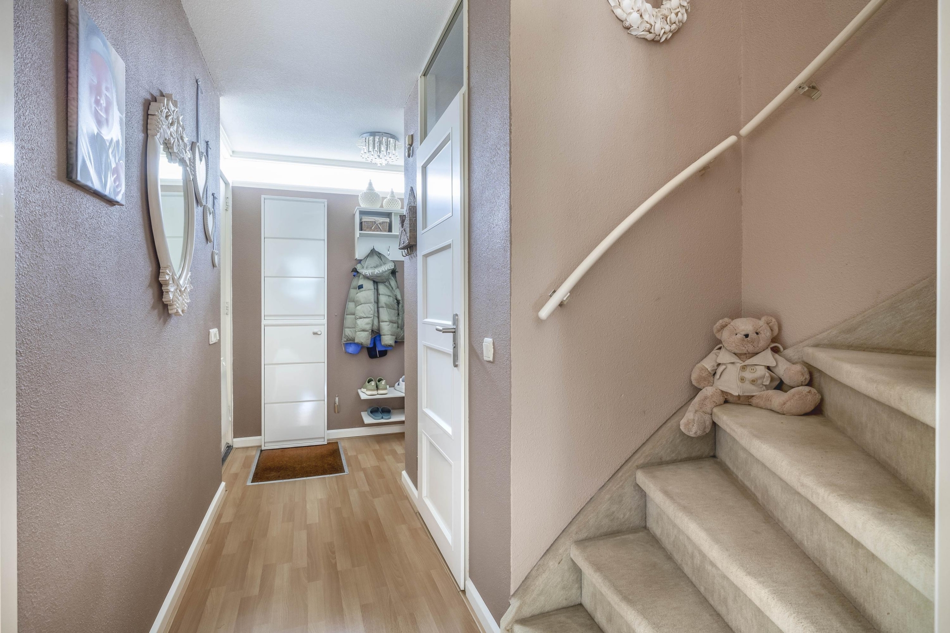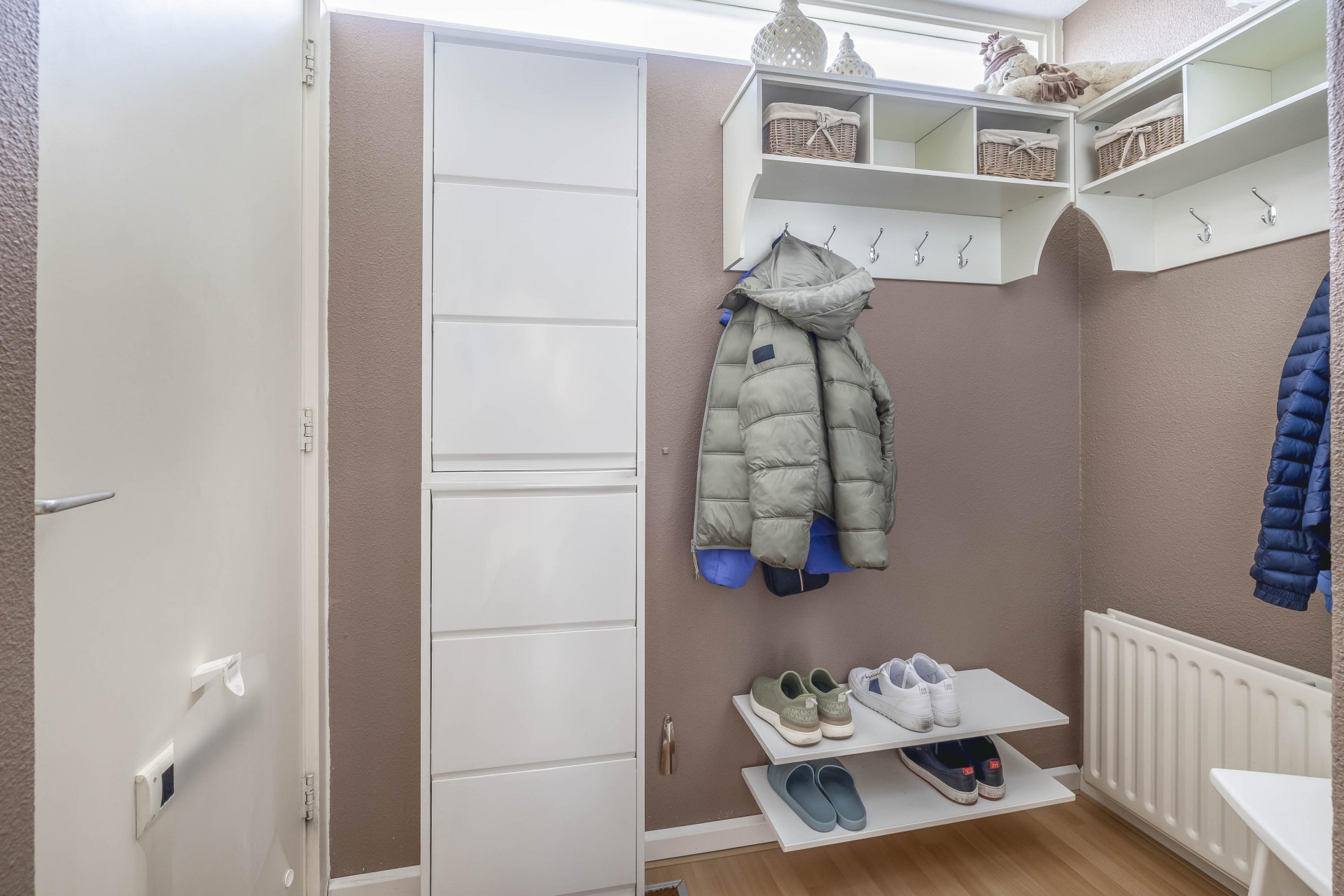 Via de ruime entree heb je toegang tot alle vertrekken. Hier is voldoende ruimte voor een garderobe en bevindt zich de meterkast. Het toilet is separaat en voorzien van een fonteintje. In de hal vind je tevens de trapopgang met praktische trapkast en de toegang tot de woonkamer en keuken.