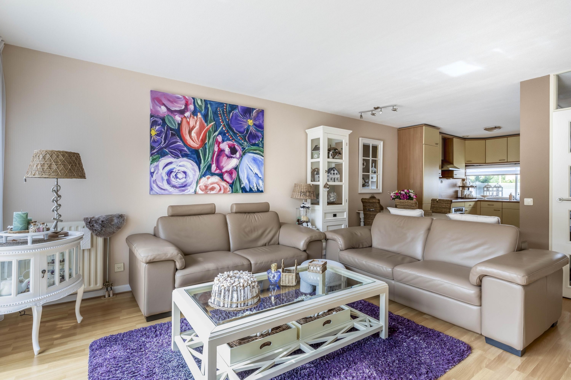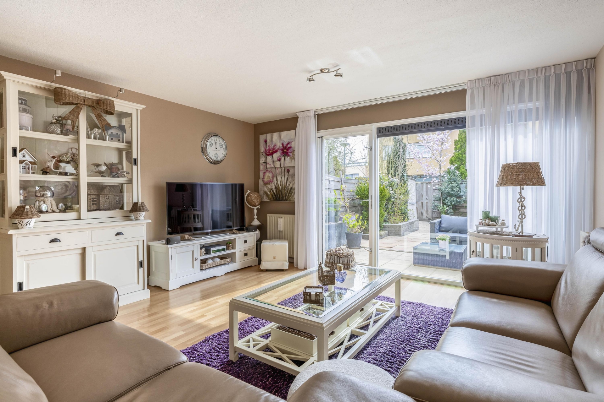 De lichte woonkamer sluit naadloos aan op de keuken en wordt gekenmerkt door grote raampartijen, waardoor er veel natuurlijk licht binnenvalt. Vanuit de woonkamer heb je toegang tot de zonnige achtertuin op het zuiden, die tevens beschikt over een achterom.