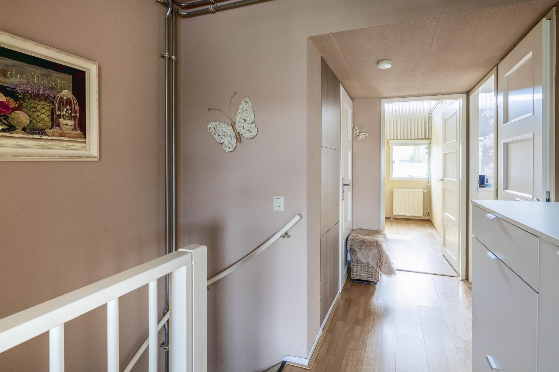 De overloop geeft toegang tot alle vertrekken. Aan de achterzijde bevinden zich twee slaapkamers van circa 10 m² en 8 m².