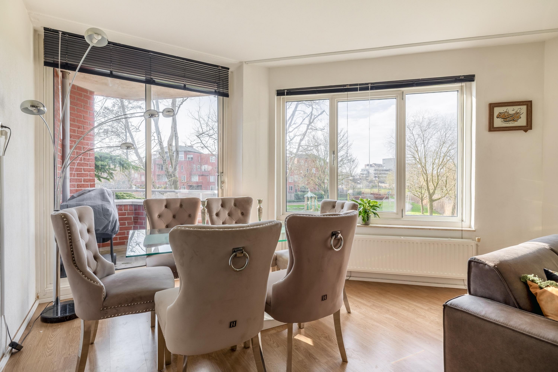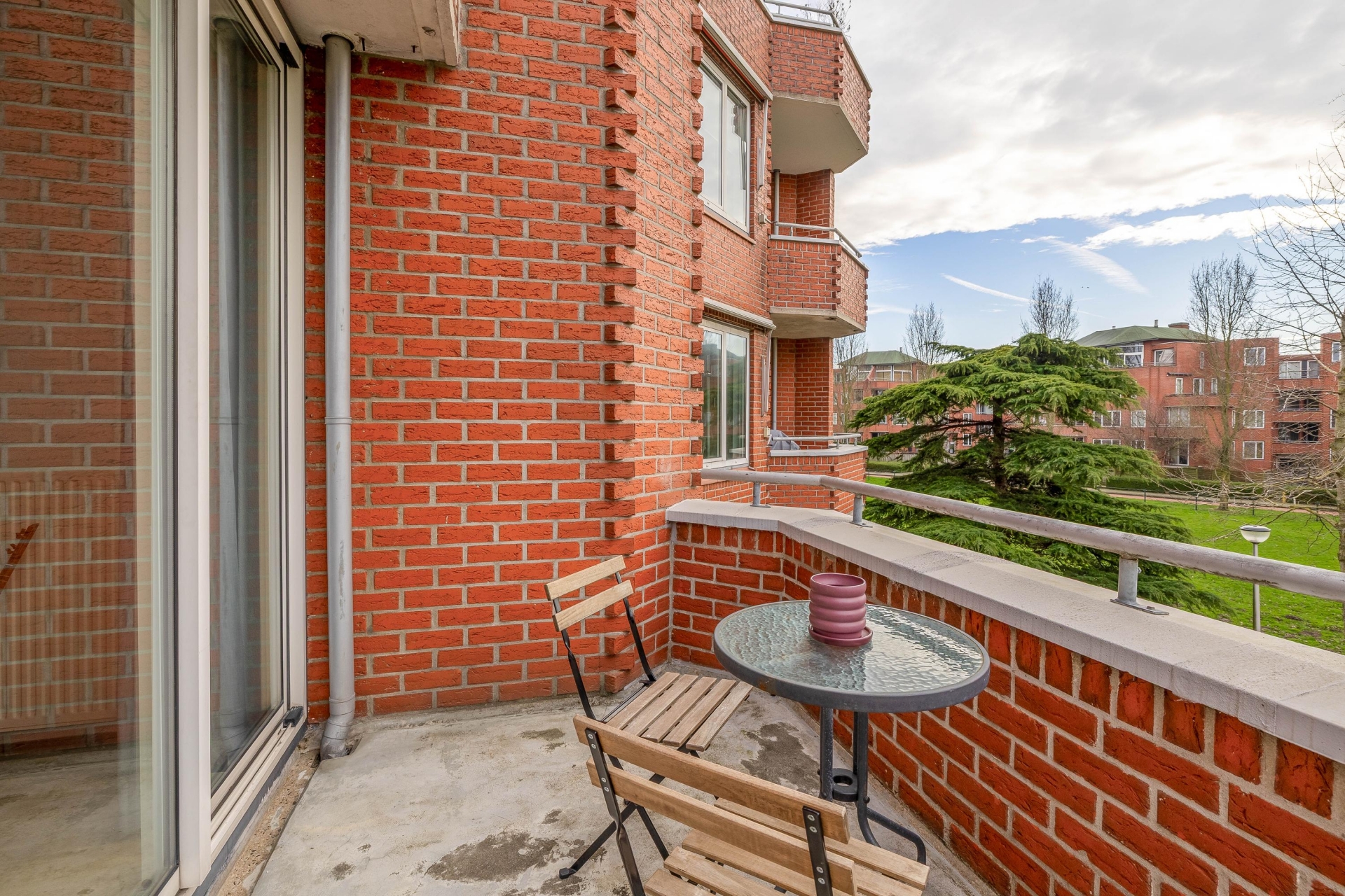 Vanuit de woonkamer stap je zo het balkon op. Hier zit je heerlijk beschut met uitzicht op groen.