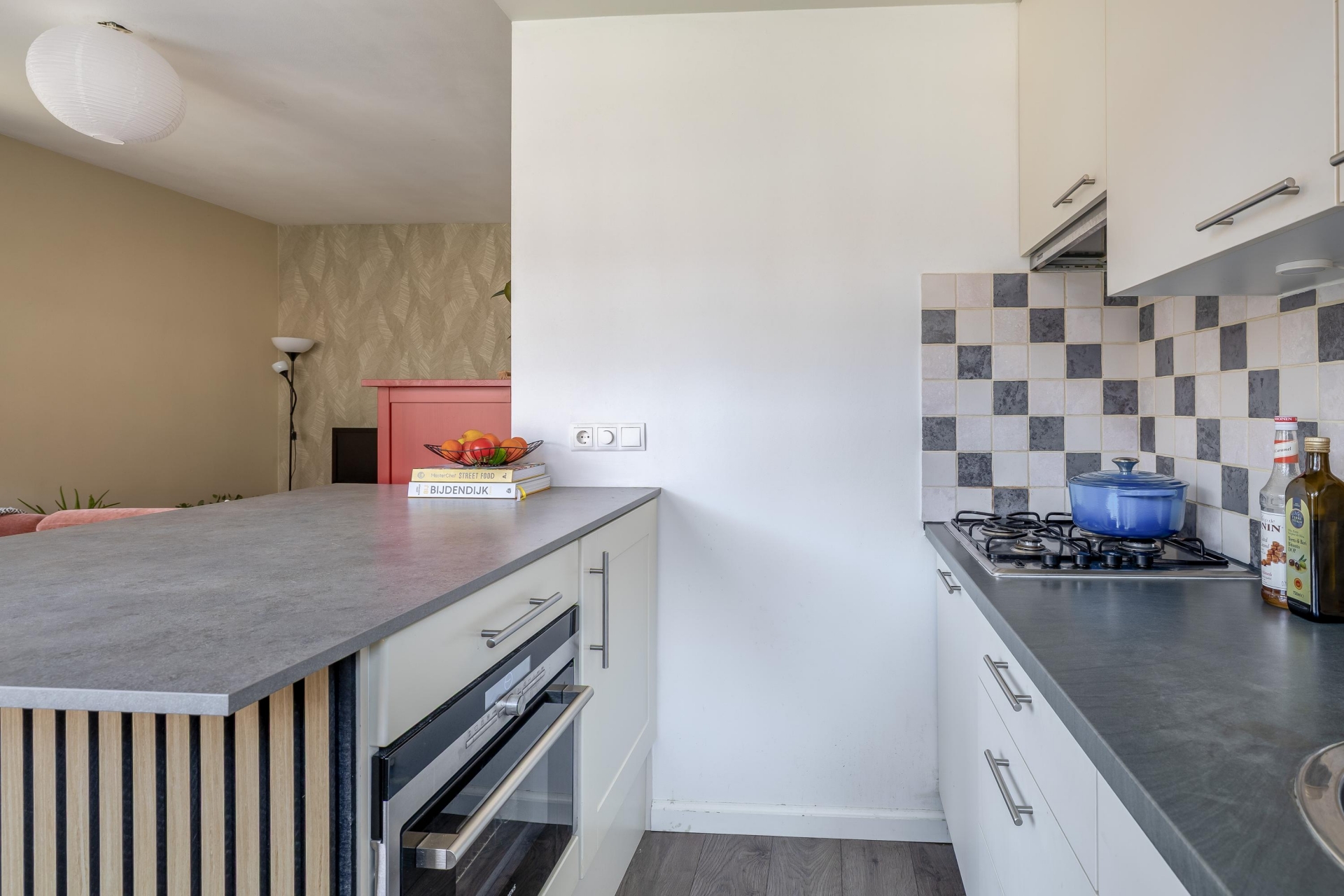 De woonkamer staat in verbinding met de keuken, waardoor de ruimte praktisch en overzichtelijk blijft. Of je nu een avondje op de bank ontspant of vrienden uitnodigt voor een etentje, hier kun je alle kanten op. De neutrale afwerking maakt het eenvoudig om het appartement helemaal naar jouw eigen smaak in te richten. De keuken is functioneel ingericht en beschikt over voldoende werk- en opbergruimte. Je hebt hier alles bij de hand om dagelijks te koken, terwijl je toch in contact blijft met de rest van de leefruimte. Dat maakt het een fijne plek waar koken en gezelligheid samenkomen.