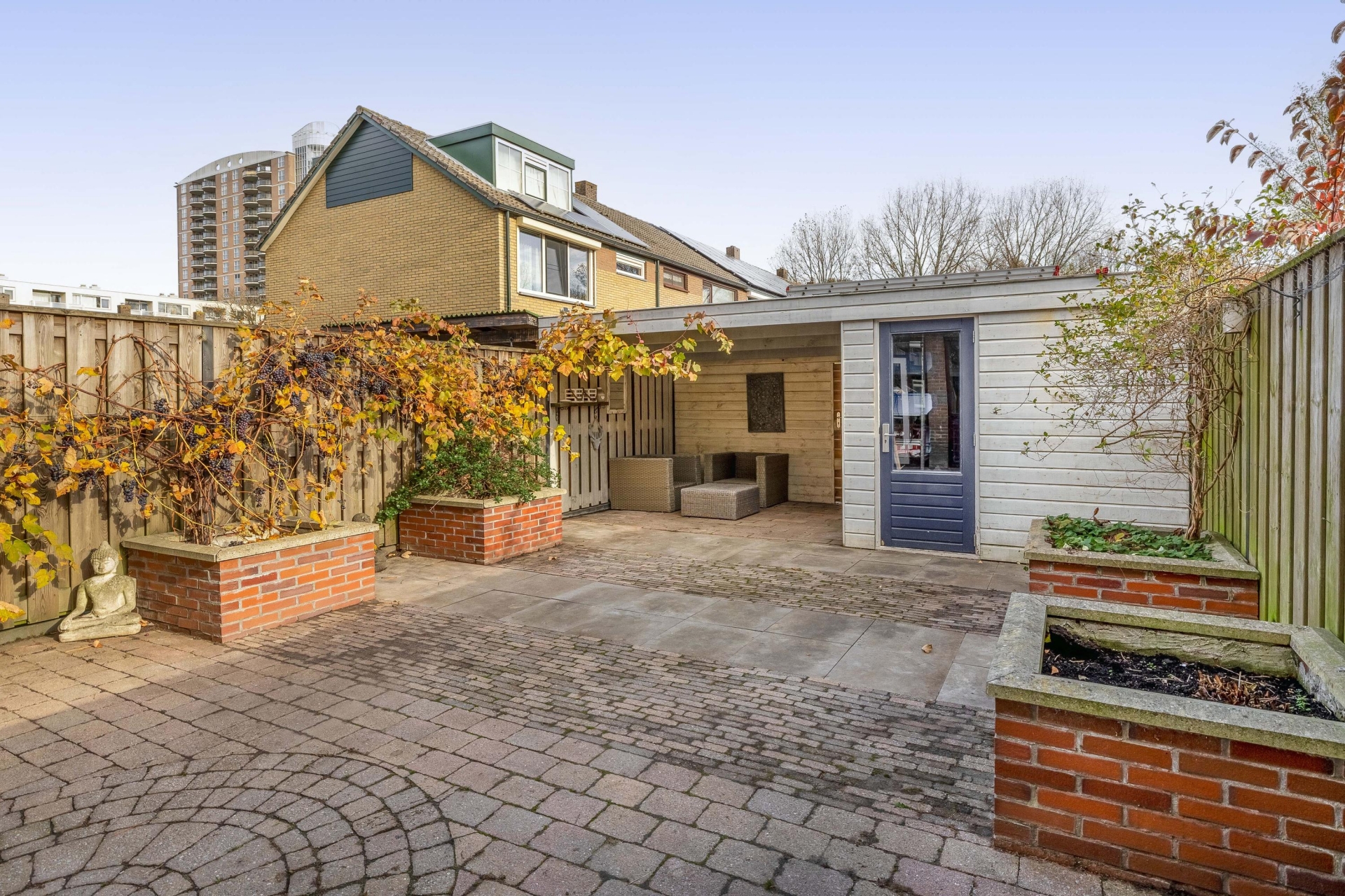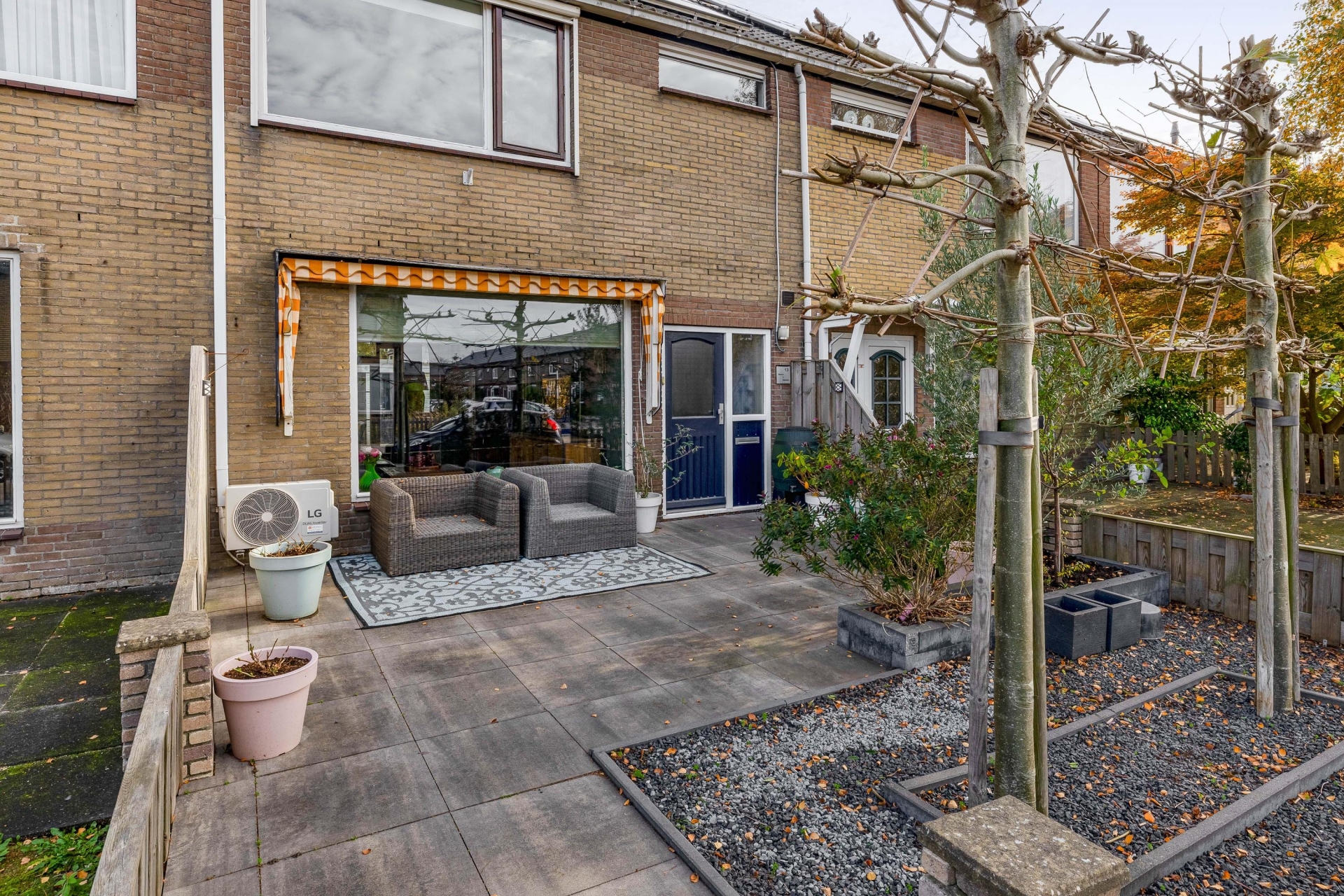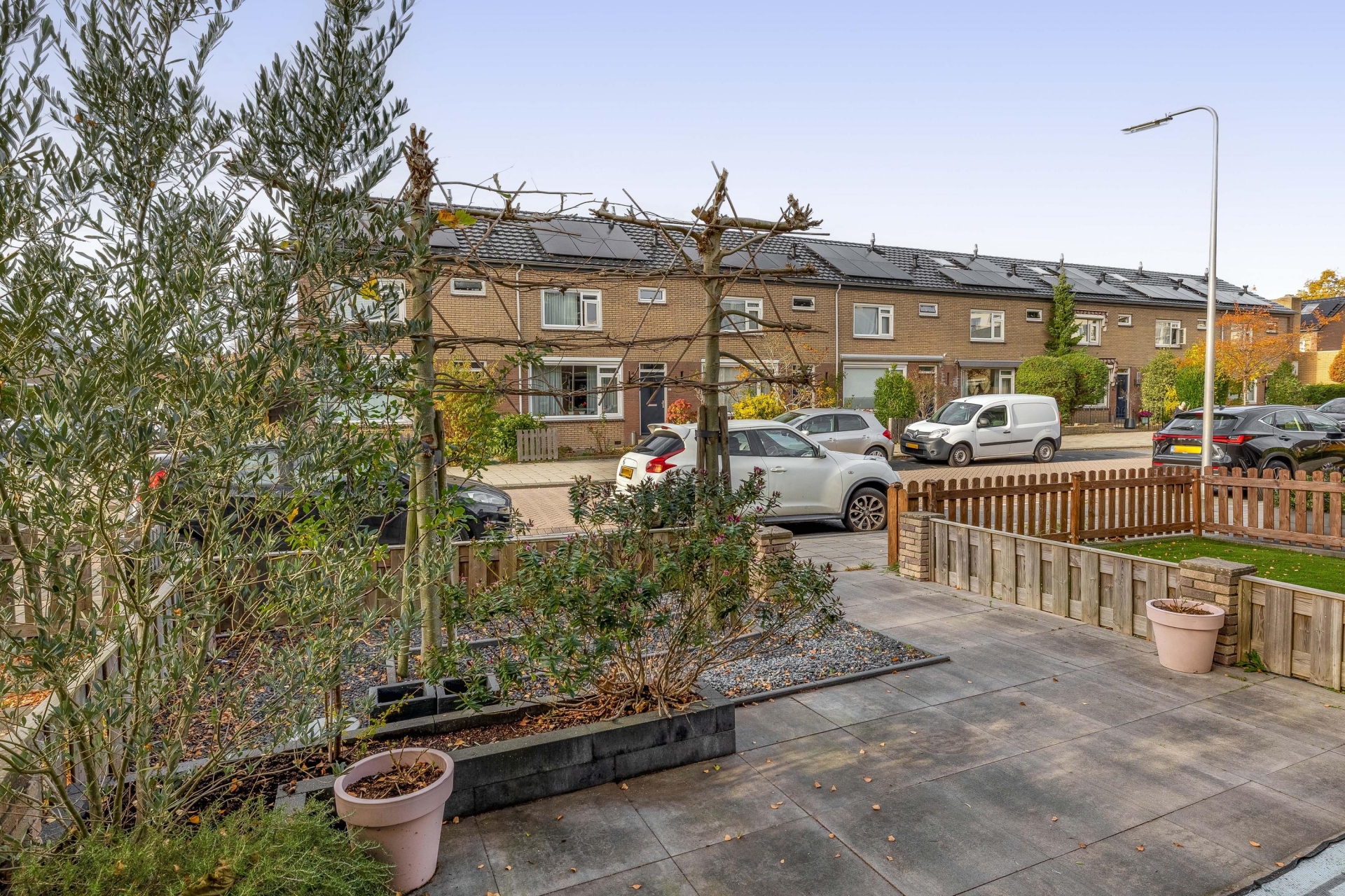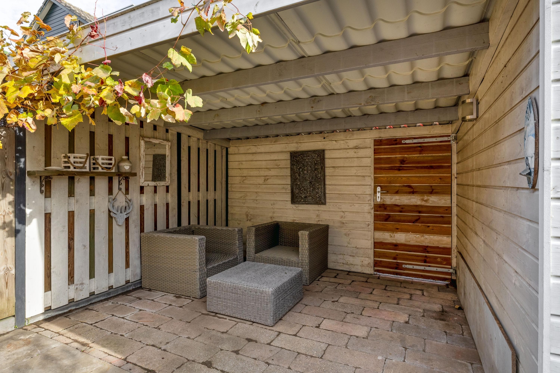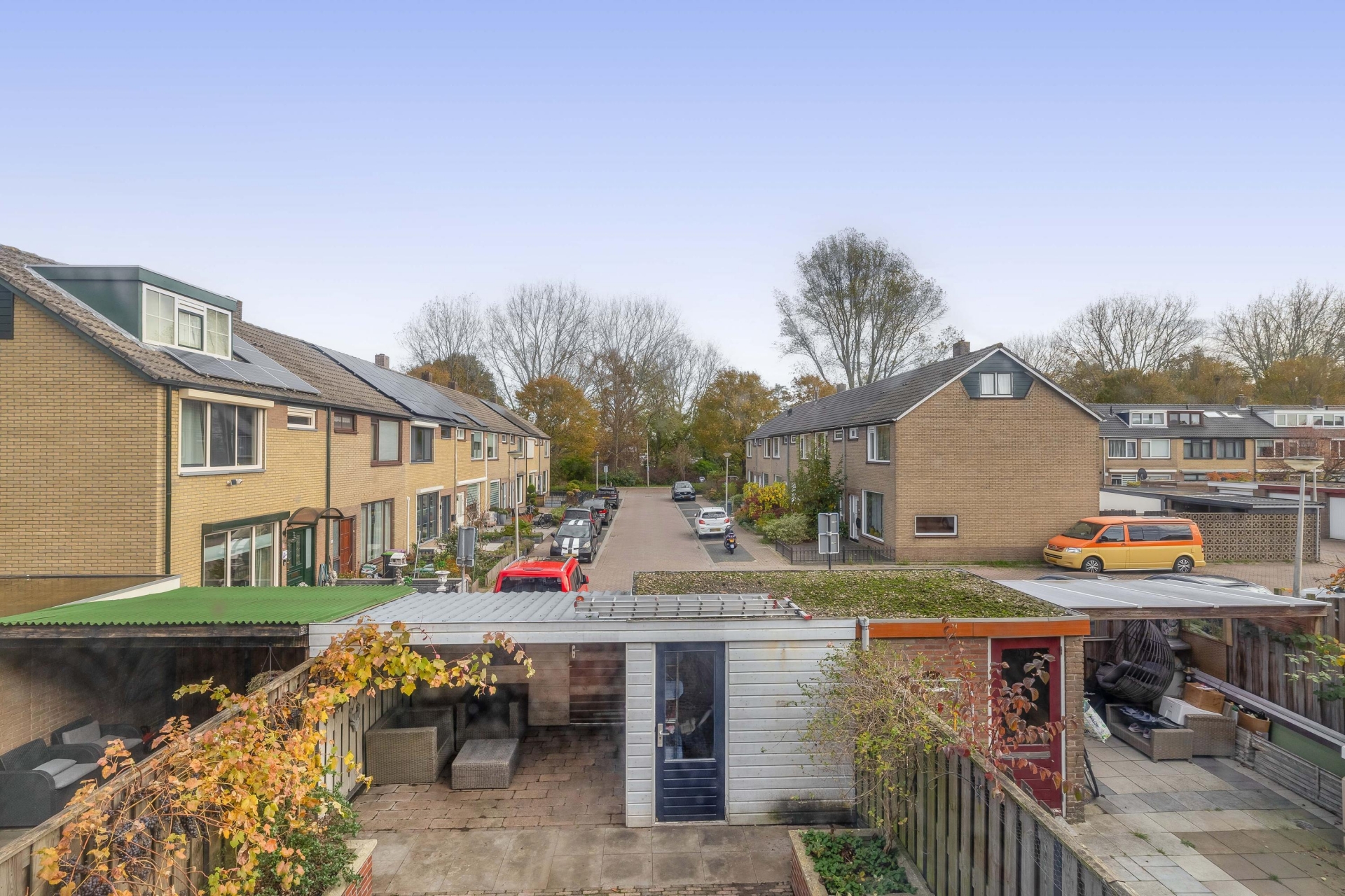 Een van de grote pluspunten van deze woning is de diepe achtertuin op het oosten. Hier geniet je in de ochtend en vroege middag van de zon, maar dankzij de diepte is er ook later op de dag nog genoeg lichtinval. Achterin de tuin vind je een praktische stenen berging, bekleed met rabatdelen en een overkapping met gezellige zithoek, perfect voor lange zomeravonden of als speelruimte voor kinderen. De tuin is grotendeels bestraat en voorzien van groenblijvende borders en klimplanten, wat zorgt voor sfeer en onderhoudsgemak. Ook de voortuin is verzorgd aangelegd en biedt ruimte voor bijvoorbeeld een zithoek.